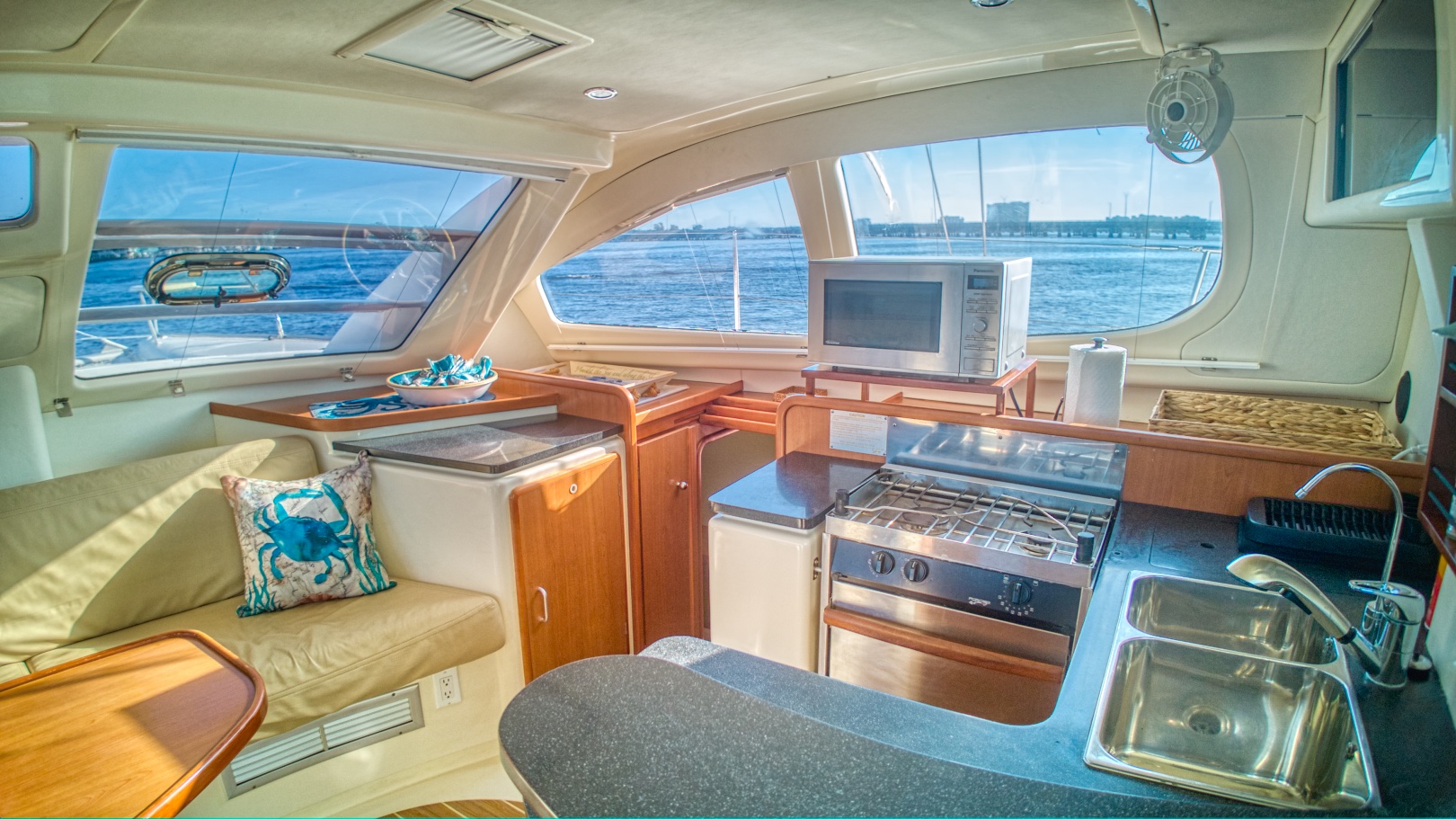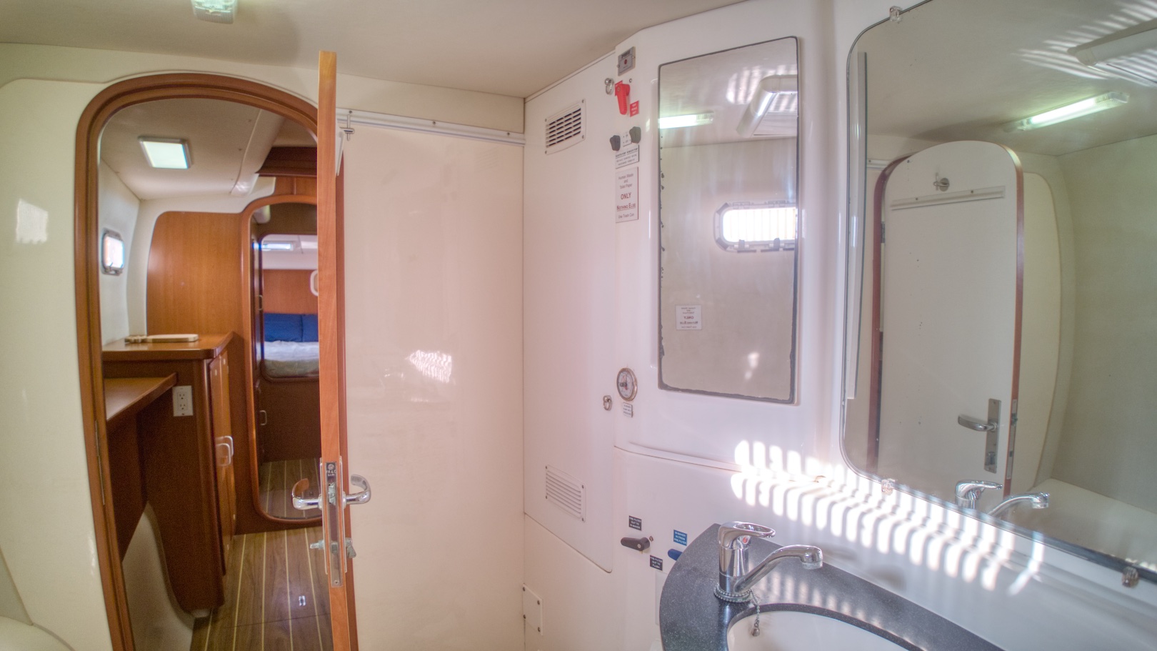 The generator set and deck storage is forward with easy access and sound/vibration enclosure.