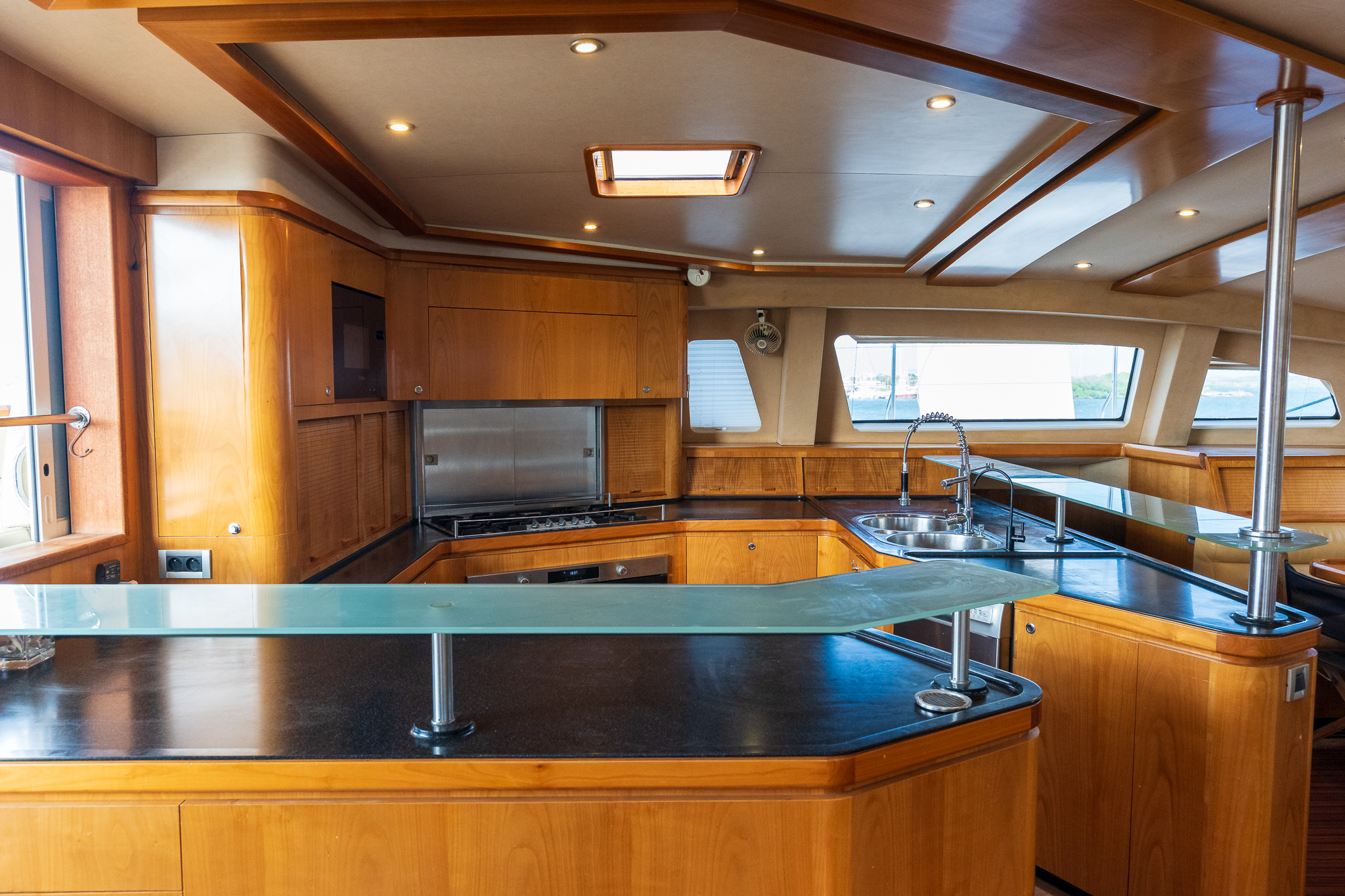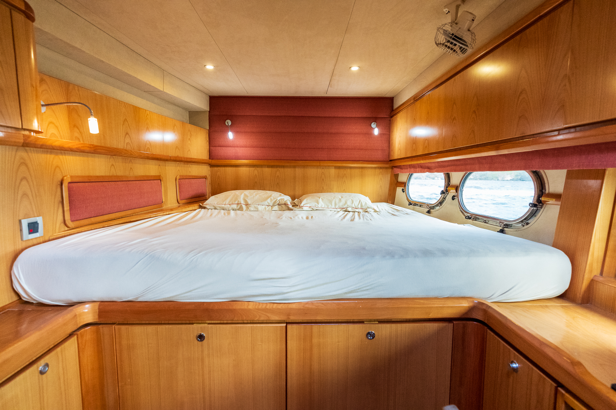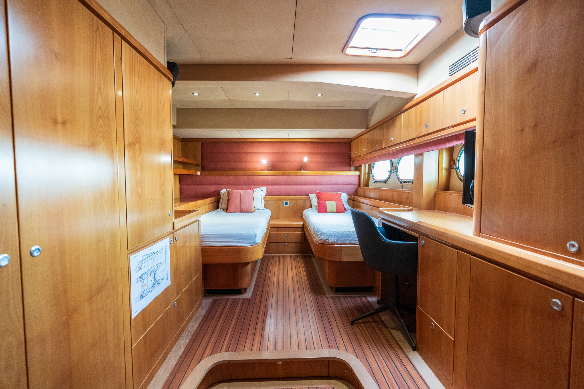 Flexible layout – A port aft cabin easily converts from twin beds into a full king, while the captain’s quarter can be set up with a Pullman berth for flexible family or crew arrangements.