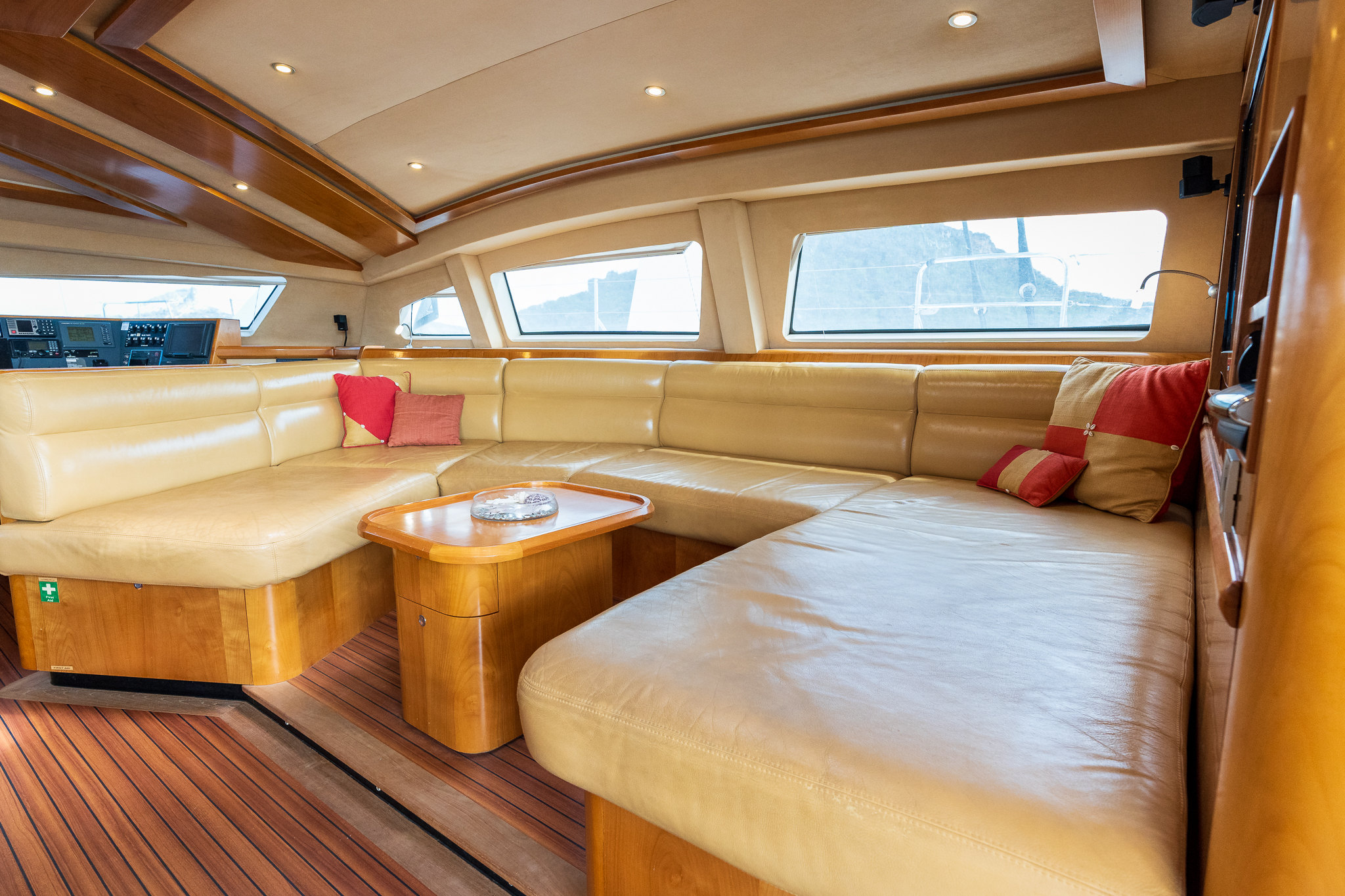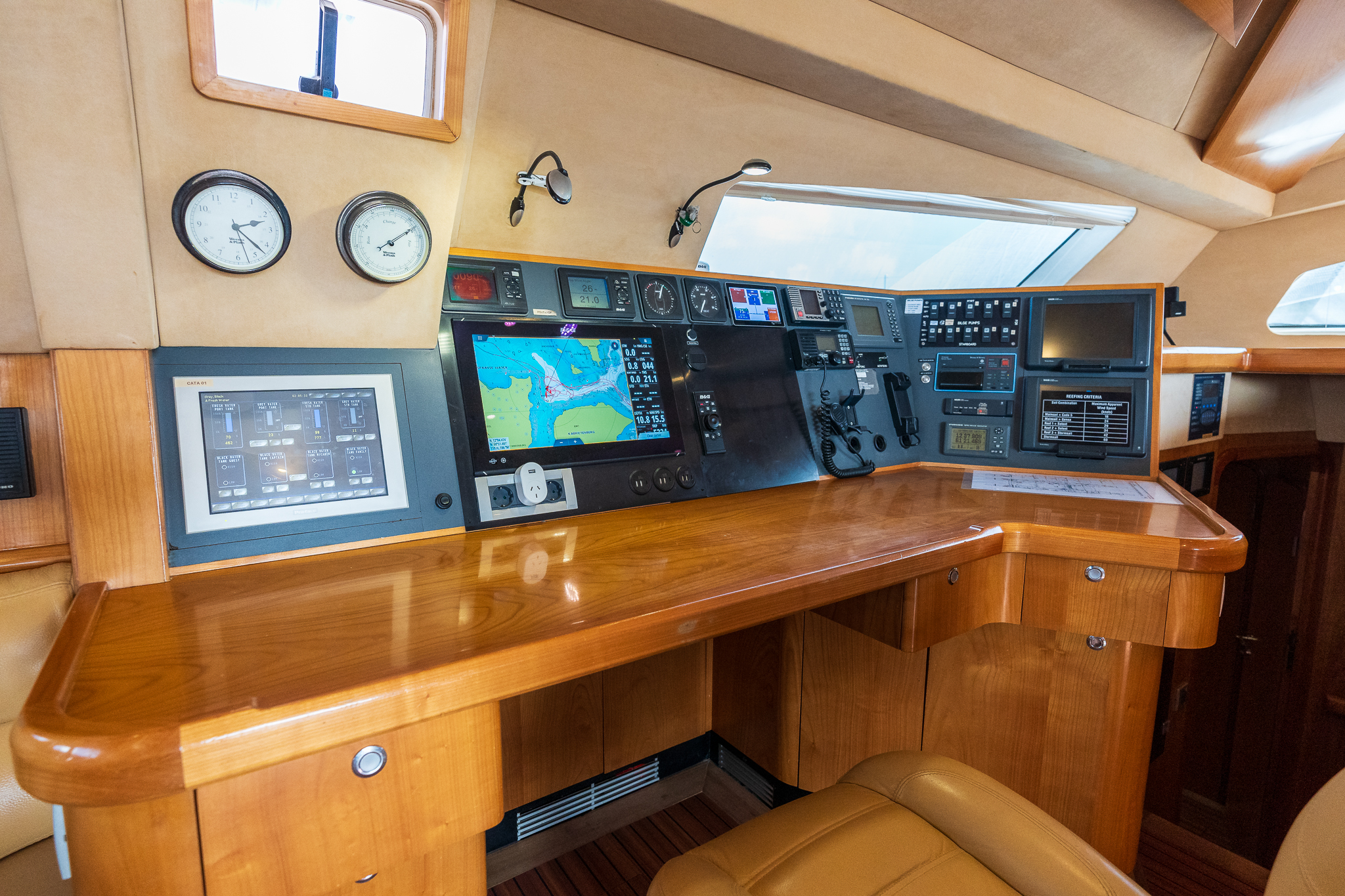 The navigation station is both practical and stylish, featuring extensive storage, a dedicated chart drawer, and a custom ergonomic leather seat (added in 2022) — electrically adjustable for long passages in comfort.