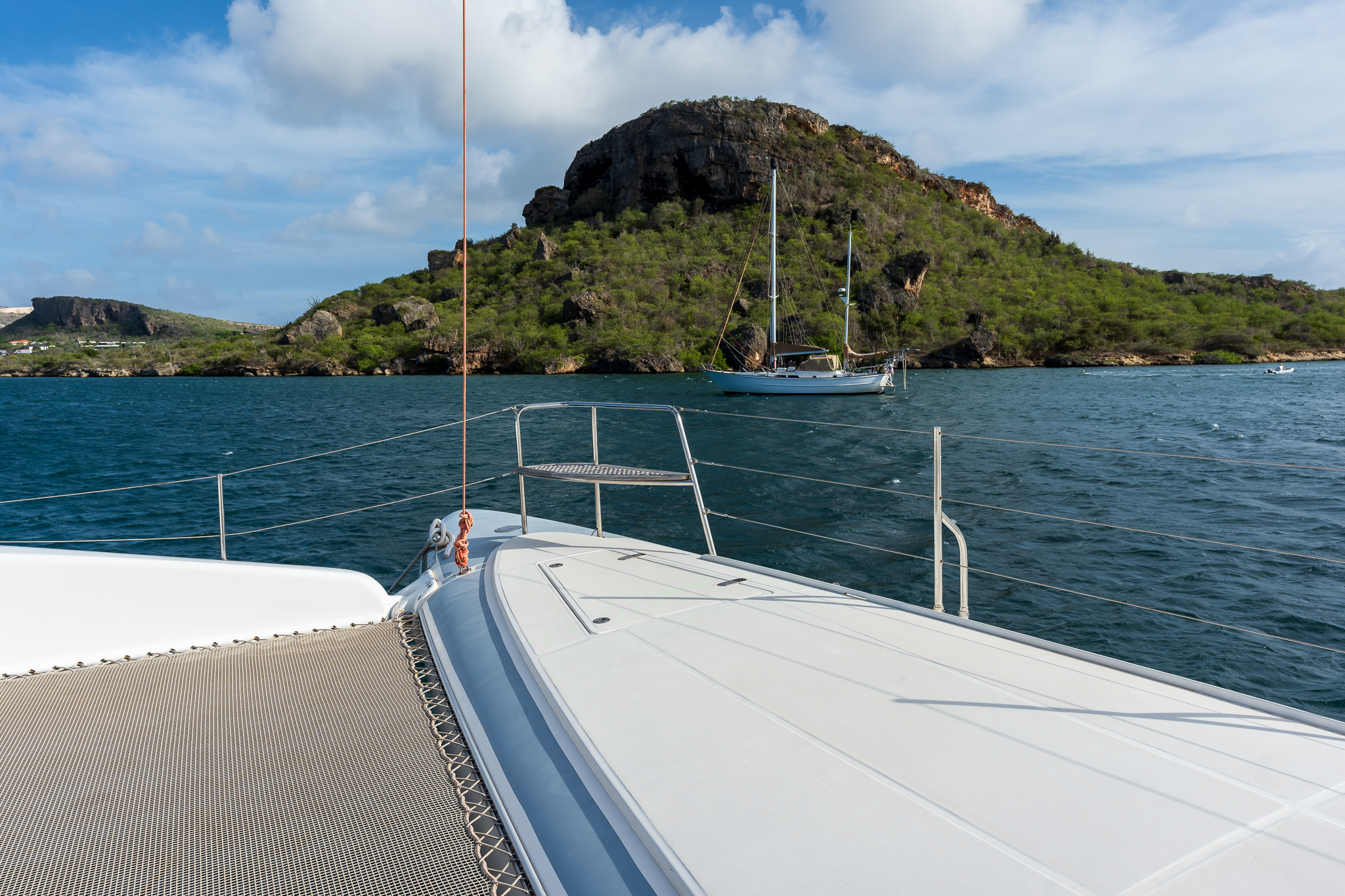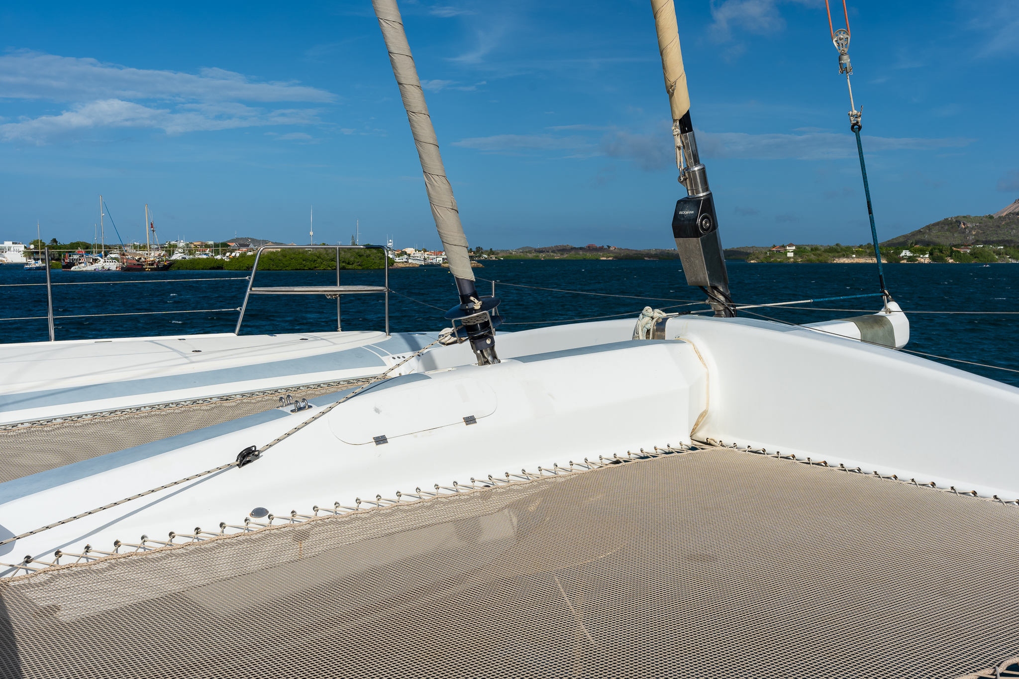 Comfortable deck layout – Two high-comfort woven Dyneema trampolines, forward Swedish pulpits with seats, reinforced cleats, and easy-access deck pumps make spending time on deck safe and relaxing.