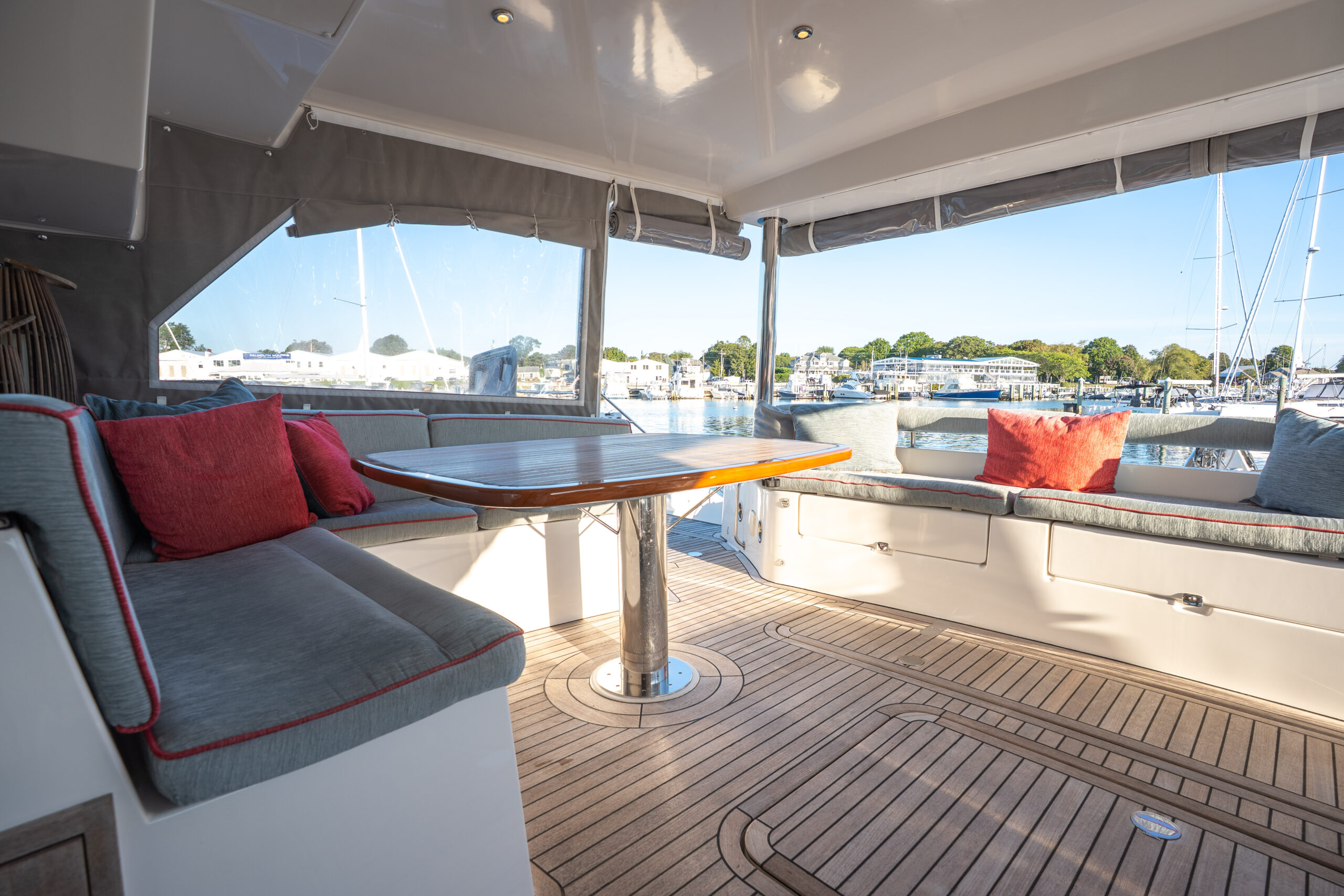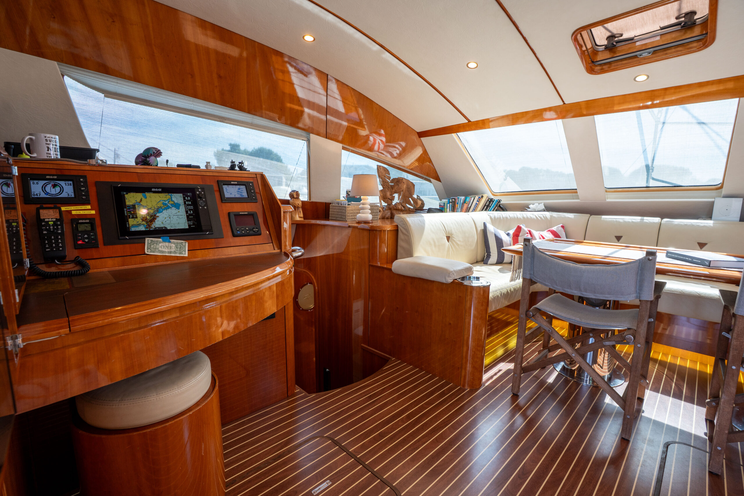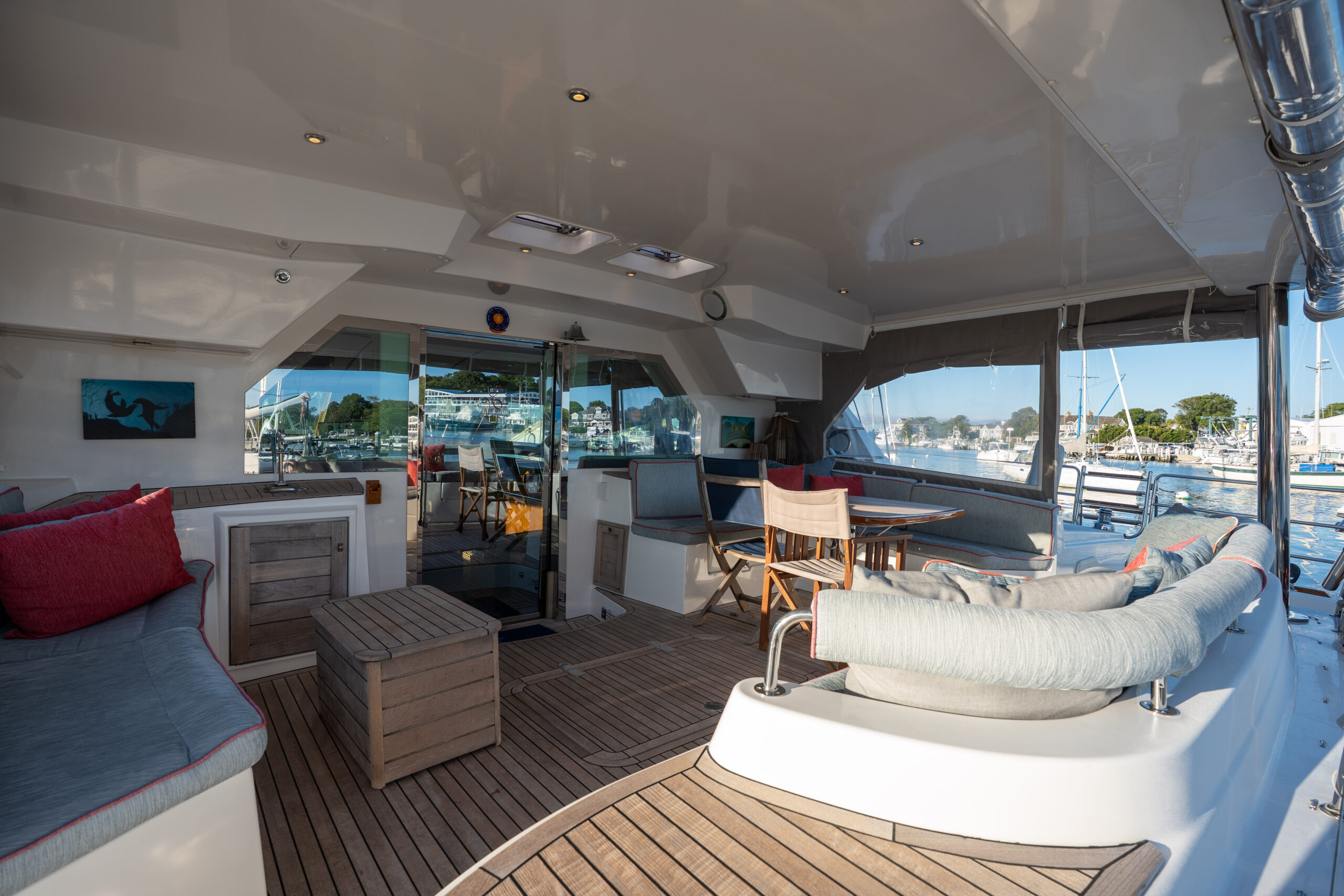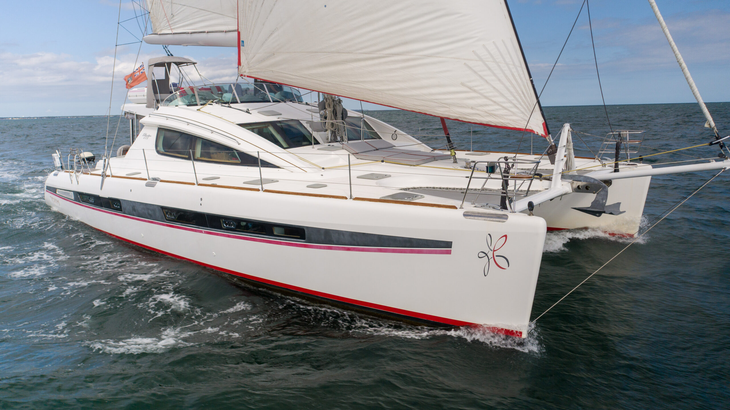 This PRIVILEGE 615 with her helm stations at mid-level between the fly bridge and the deck, and the sunbathing mattresses at the fly, allows the sailing passion to be easily shared with family and friends. Her very spacious cockpit and cozy interior invite all to enjoy a serene life onboard.