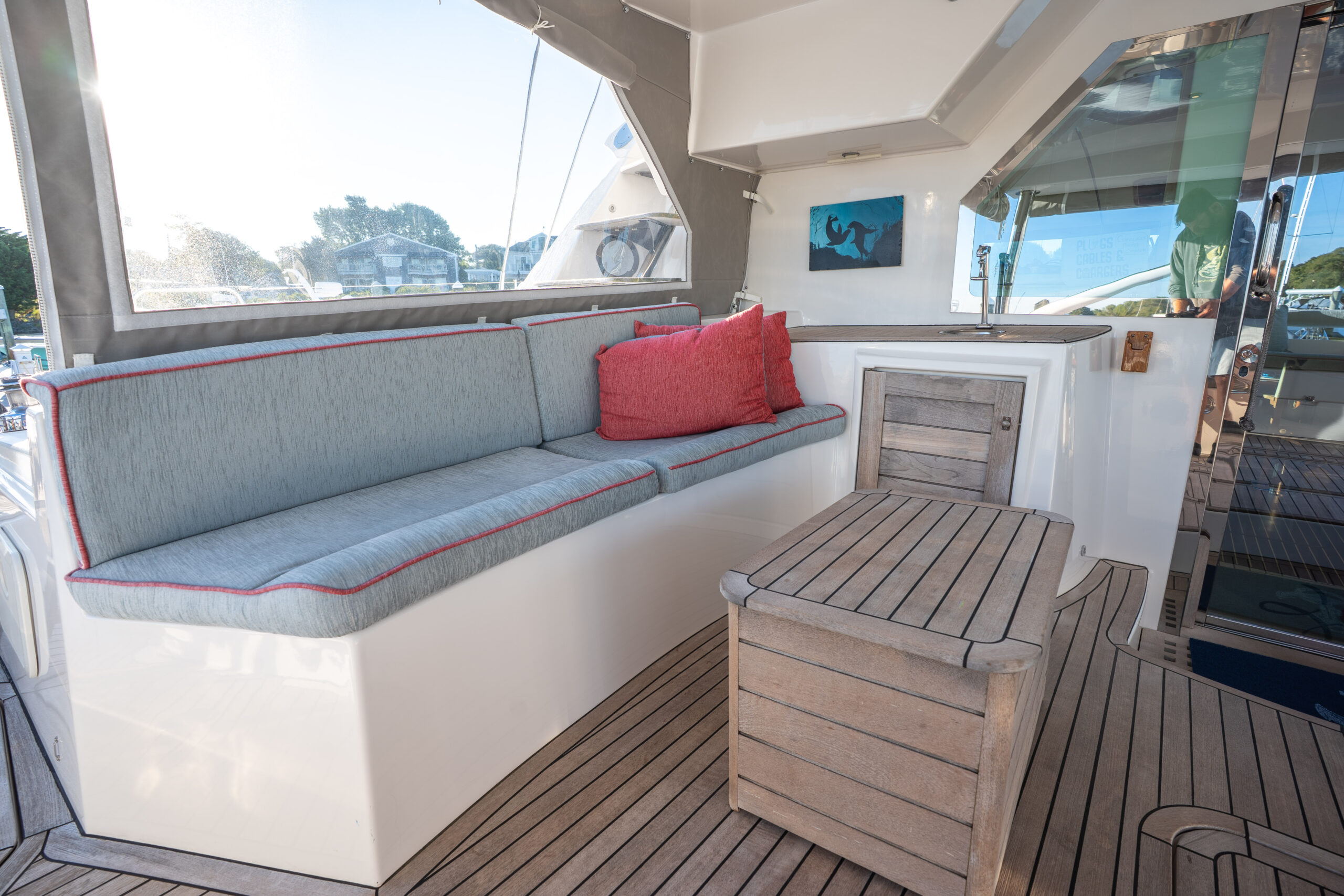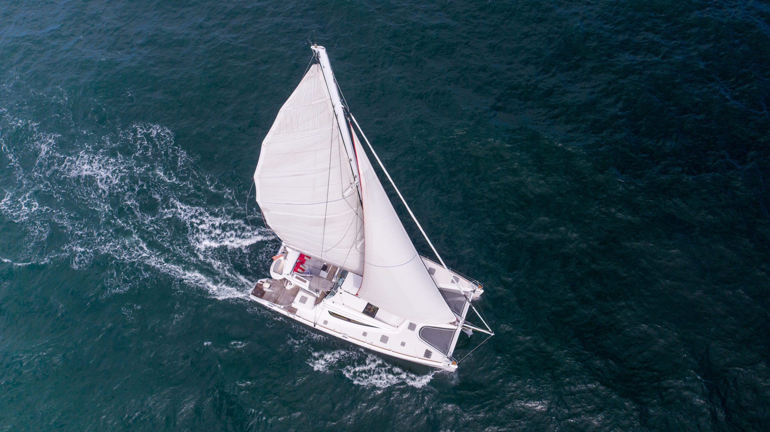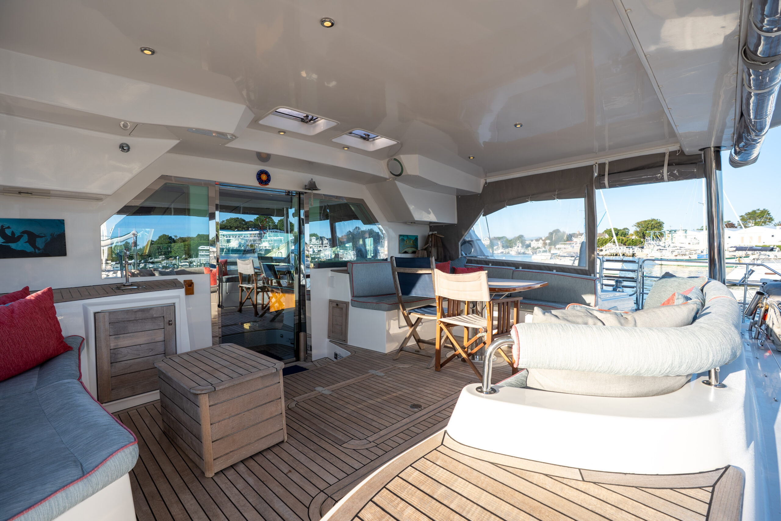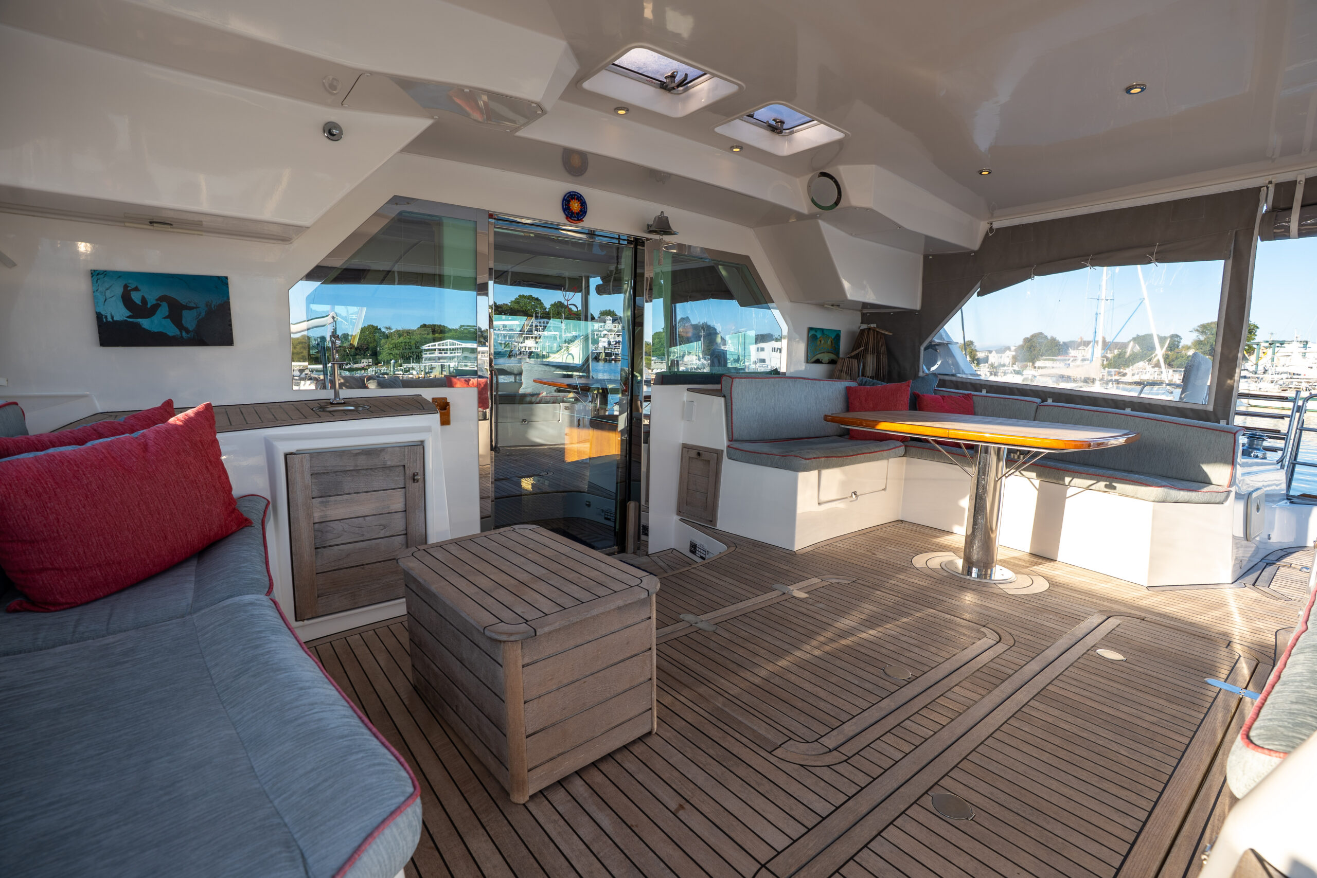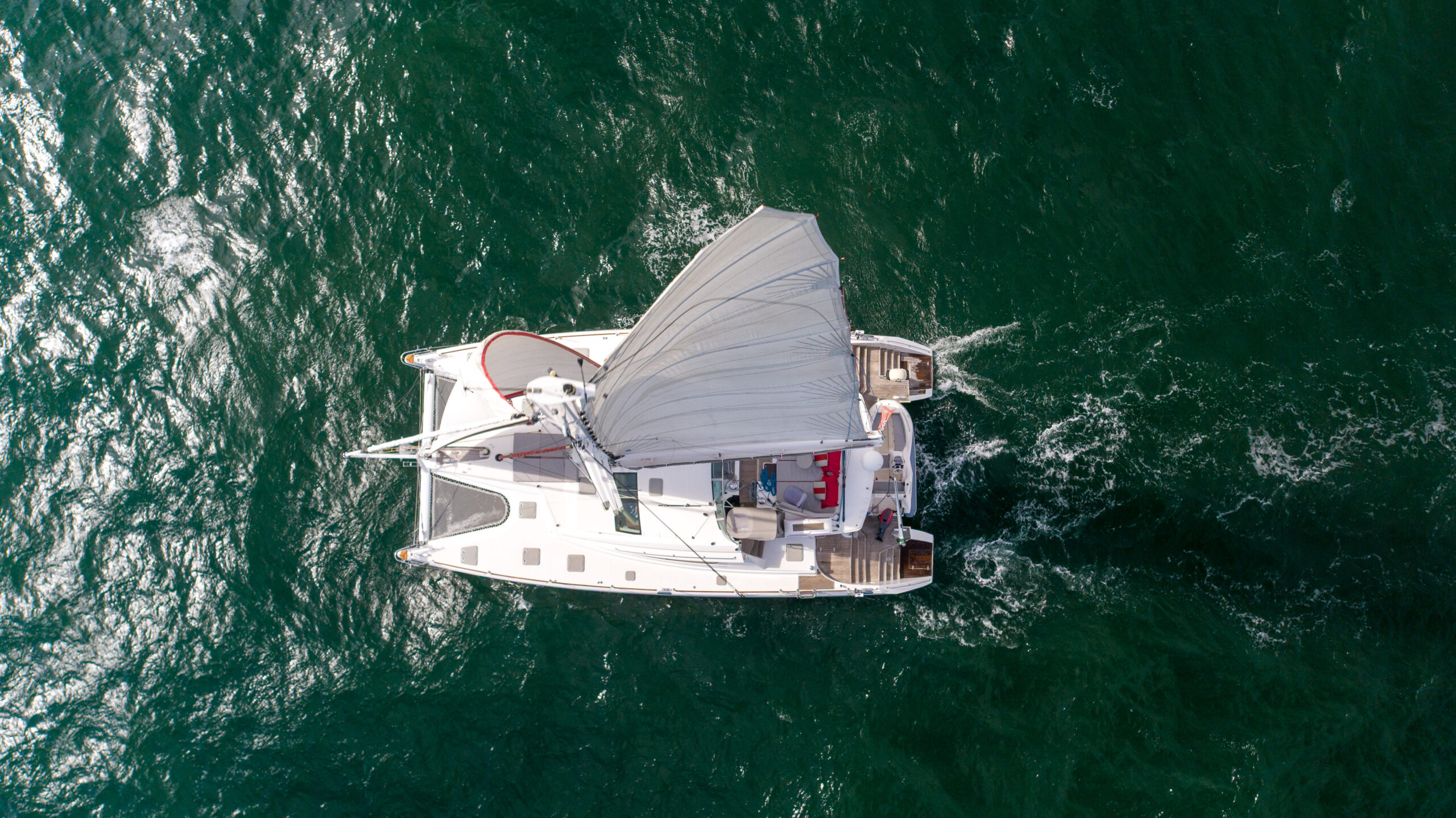 This PRIVILEGE 615 with her helm stations at mid-level between the fly bridge and the deck, and the sunbathing mattresses at the fly, allows the sailing passion to be easily shared with family and friends. Her very spacious cockpit and cozy interior invite all to enjoy a serene life onboard.