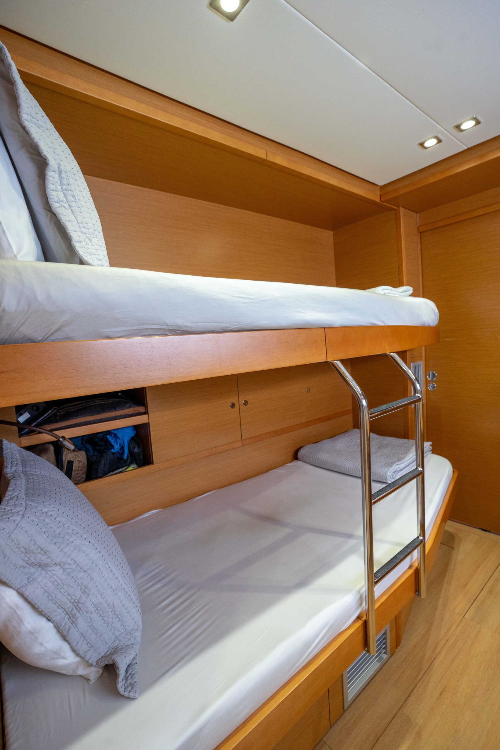 Located just forward of the Galley and features large twin bunk berths, ample storage , a deck hatch, (2) medium fixed hull windows , new functional curtains and a private head and shower.