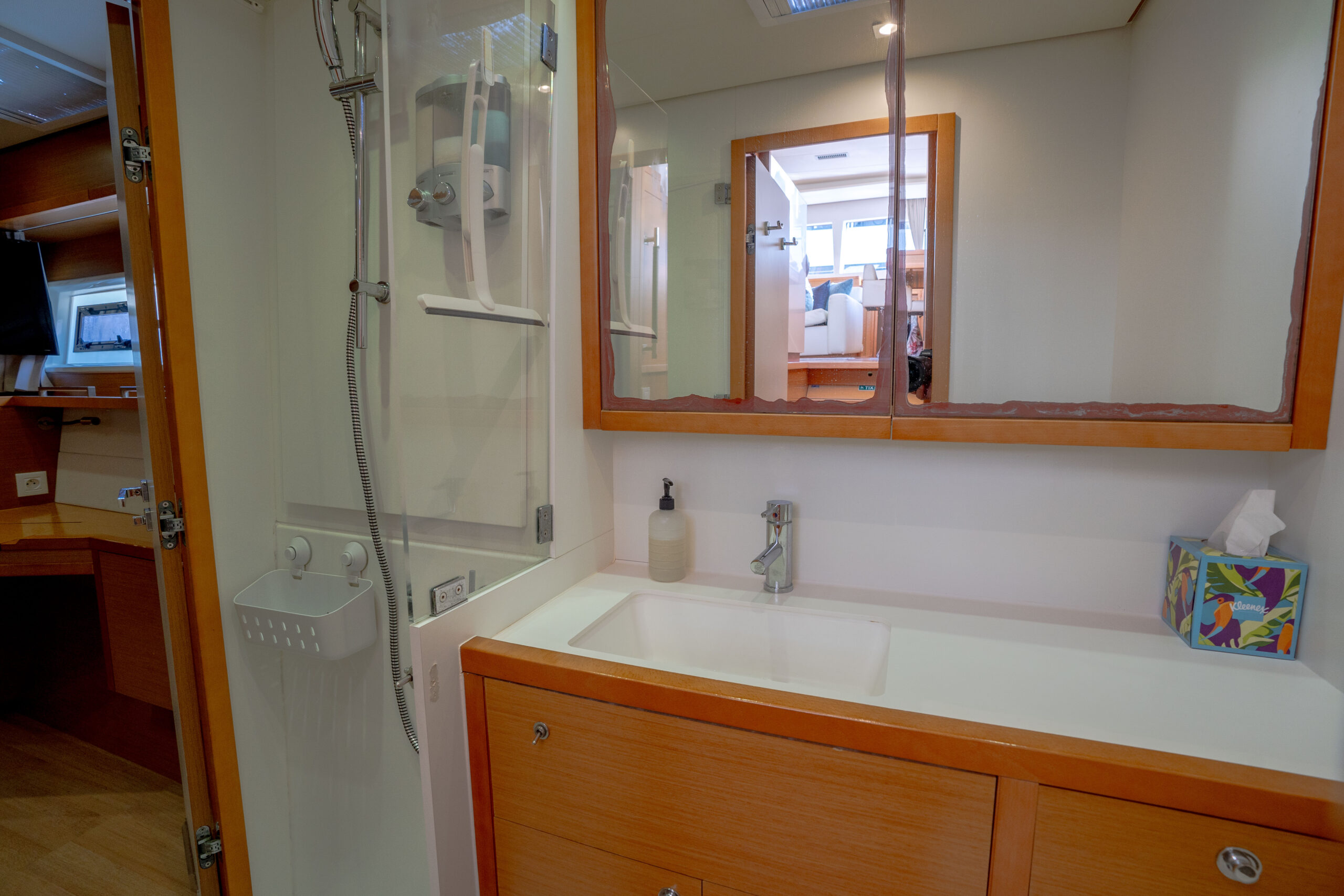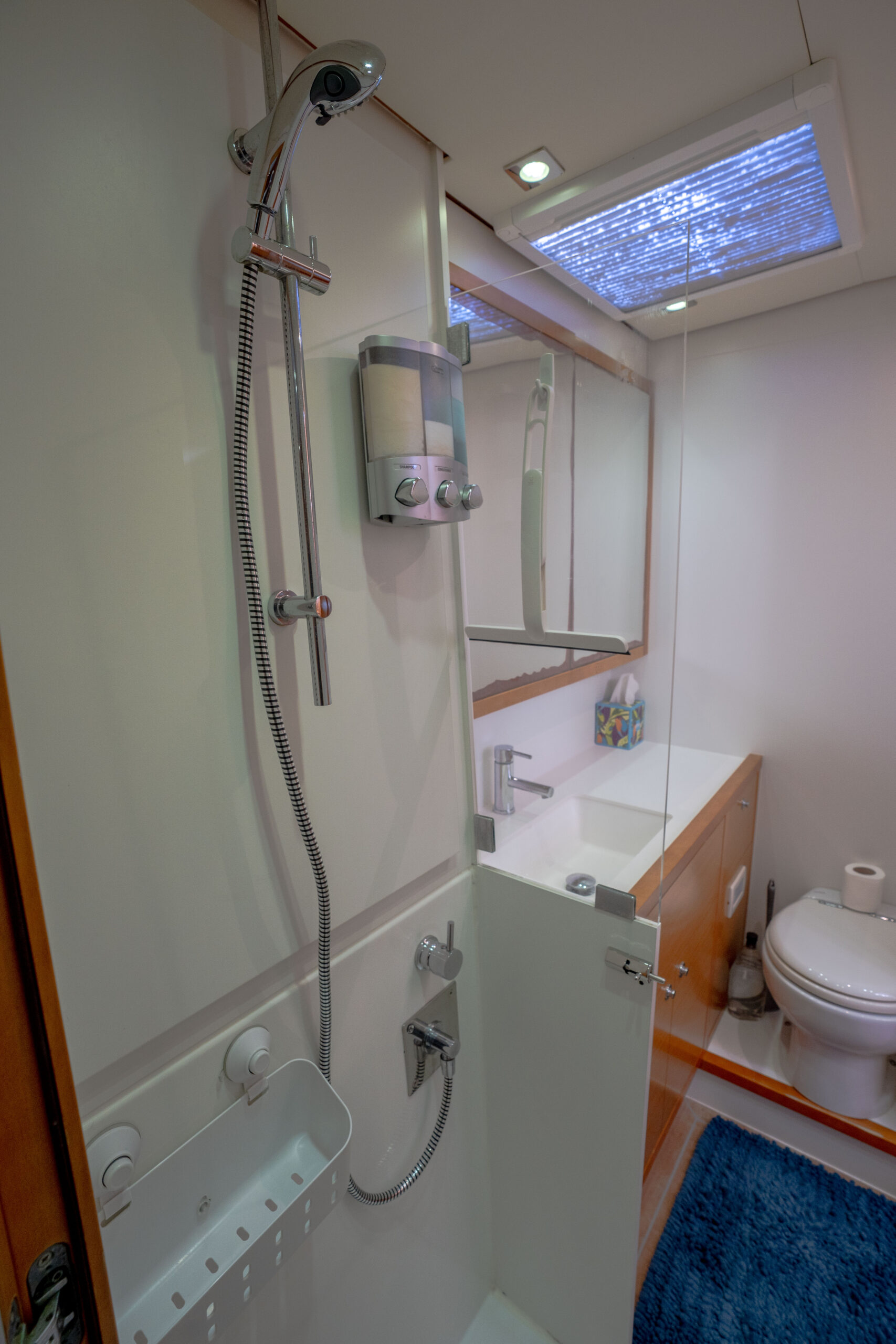 Access from Aft Companionway. Queen size bed with side access, wooden slats under mattress. Under berth storage, bedside storage, newly upholstered headboard, newly upholstered twin divider board, hanging locker with lights and shelves, (1) opening porthole. Opening Deck hatch with mosquito screen and blind, large one way fixed hull window, new functional total blackout window curtains and direct access to private head facility.TV. The aft starboard head has a separate dry shower stall with Plexiglas door, vanity cabinet with mirror, electric TECMA fresh water toilet, opening deck hatch with mosquito screen and blind and (3) spotlights.
