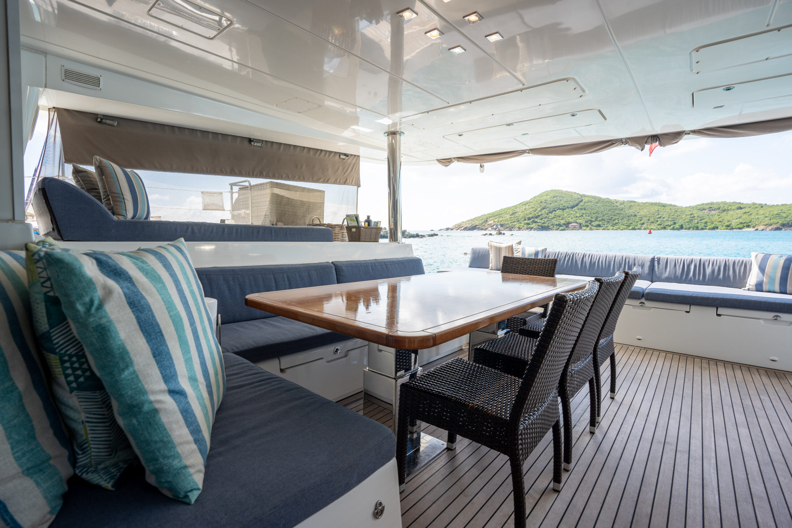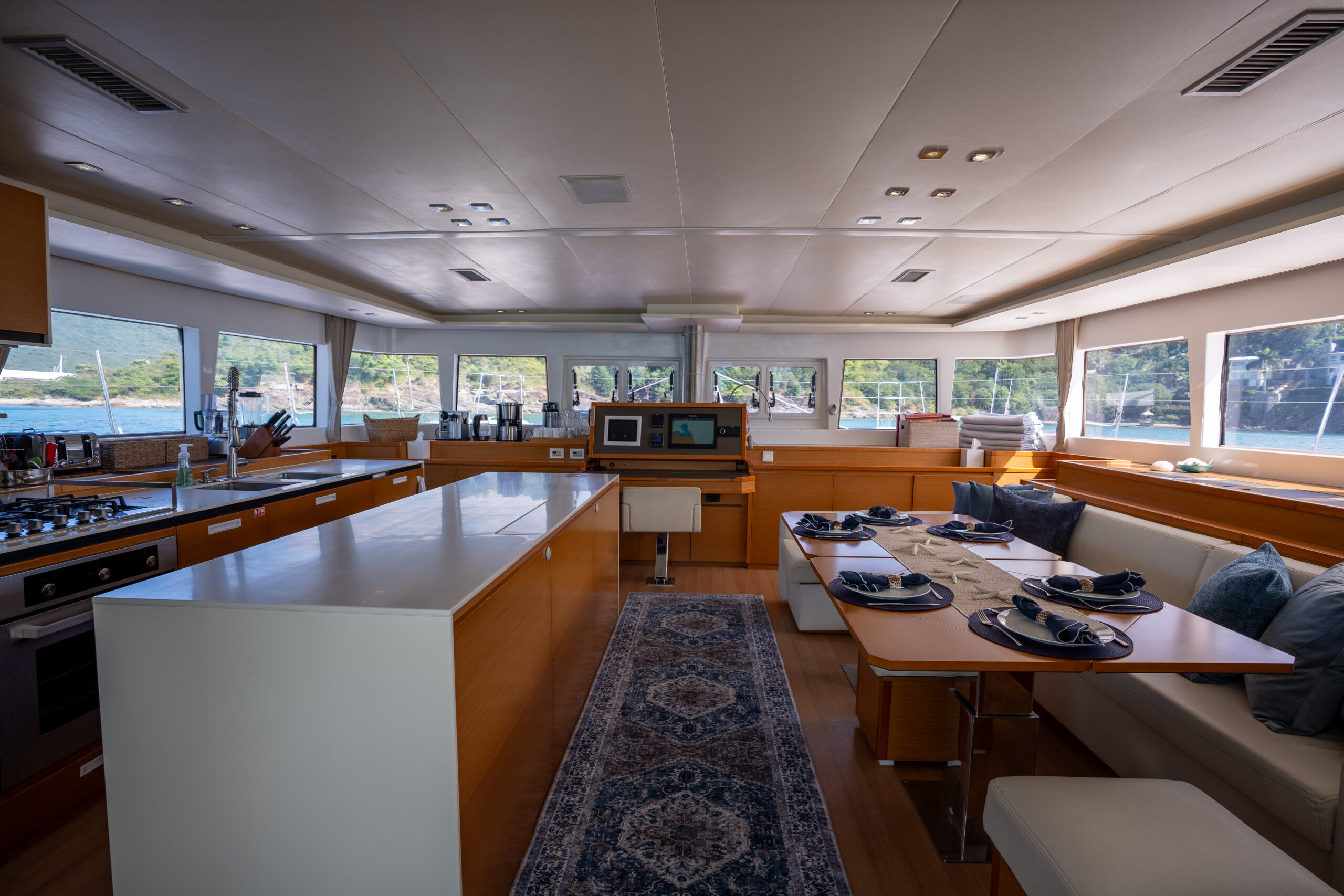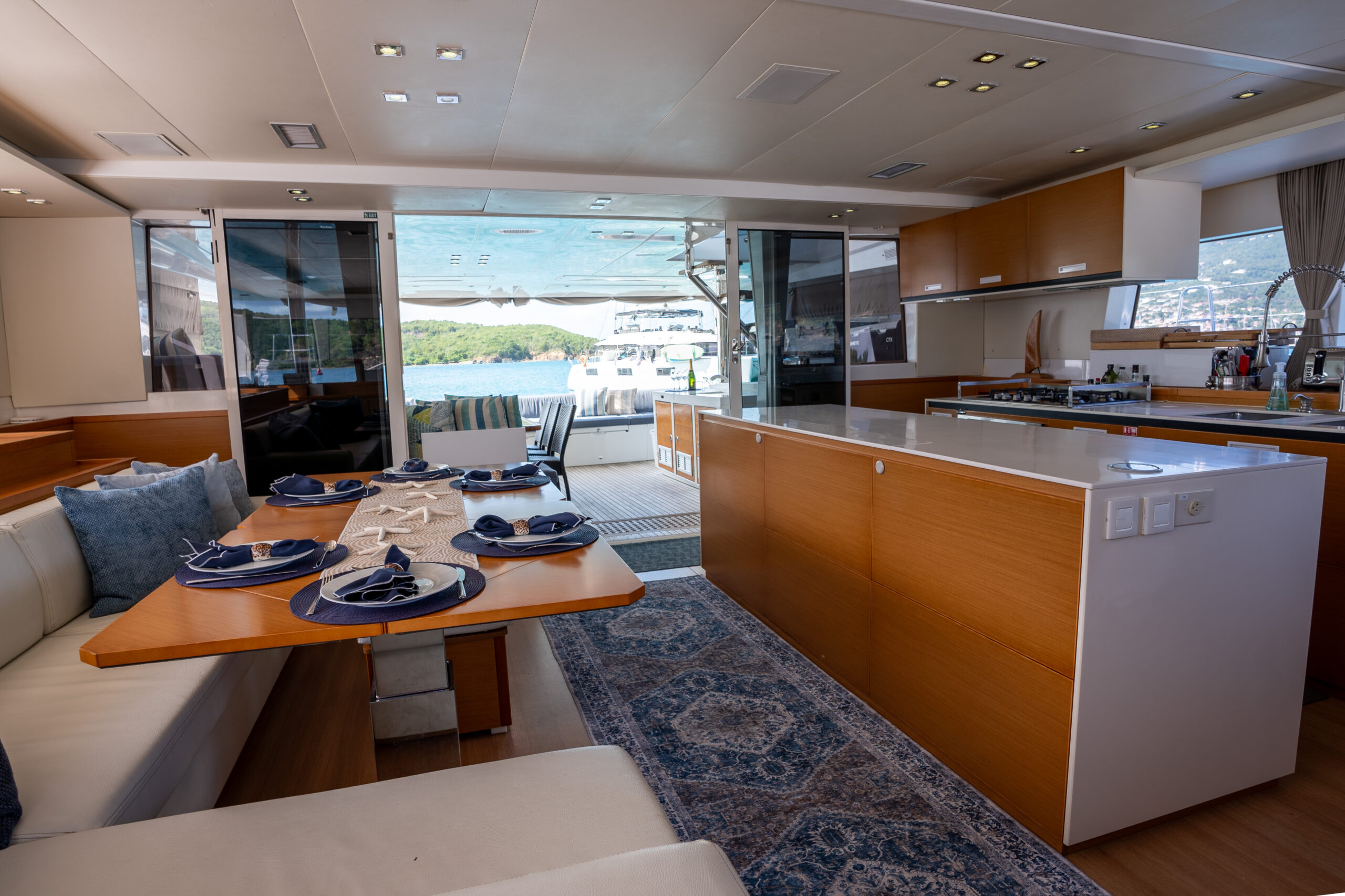 Access from the cockpit galley up through sliding glass doors. Galley Up. The Saloon floor has storage compartments underneath. There are (4) opening ports on the forward facing saloon windows for ventilation. Forward and Aft Companionway steps on both sides of the Saloon. Ample seating and wide open , airy feeling spaces. To Starboard in the main saloon is a settee for 5 persons, 2 coffee tables that convert into a large dining table with telescopic legs and (2) stand along sitting storage boxes.