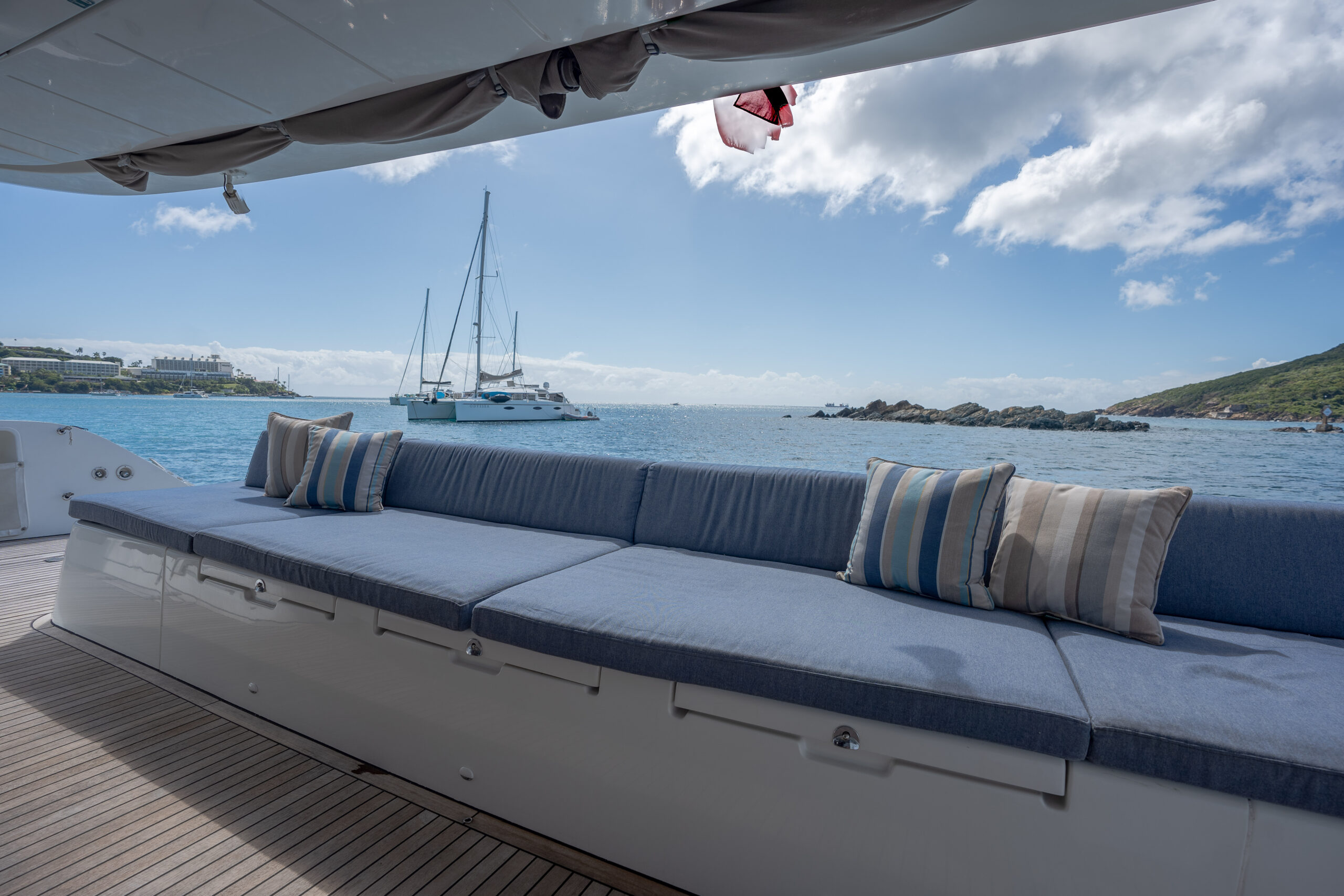 Aft crossbeam with 4 storage lockers, sun lounging area, dedicated space for 2 X 10-person life raft, stainless steel railing.
