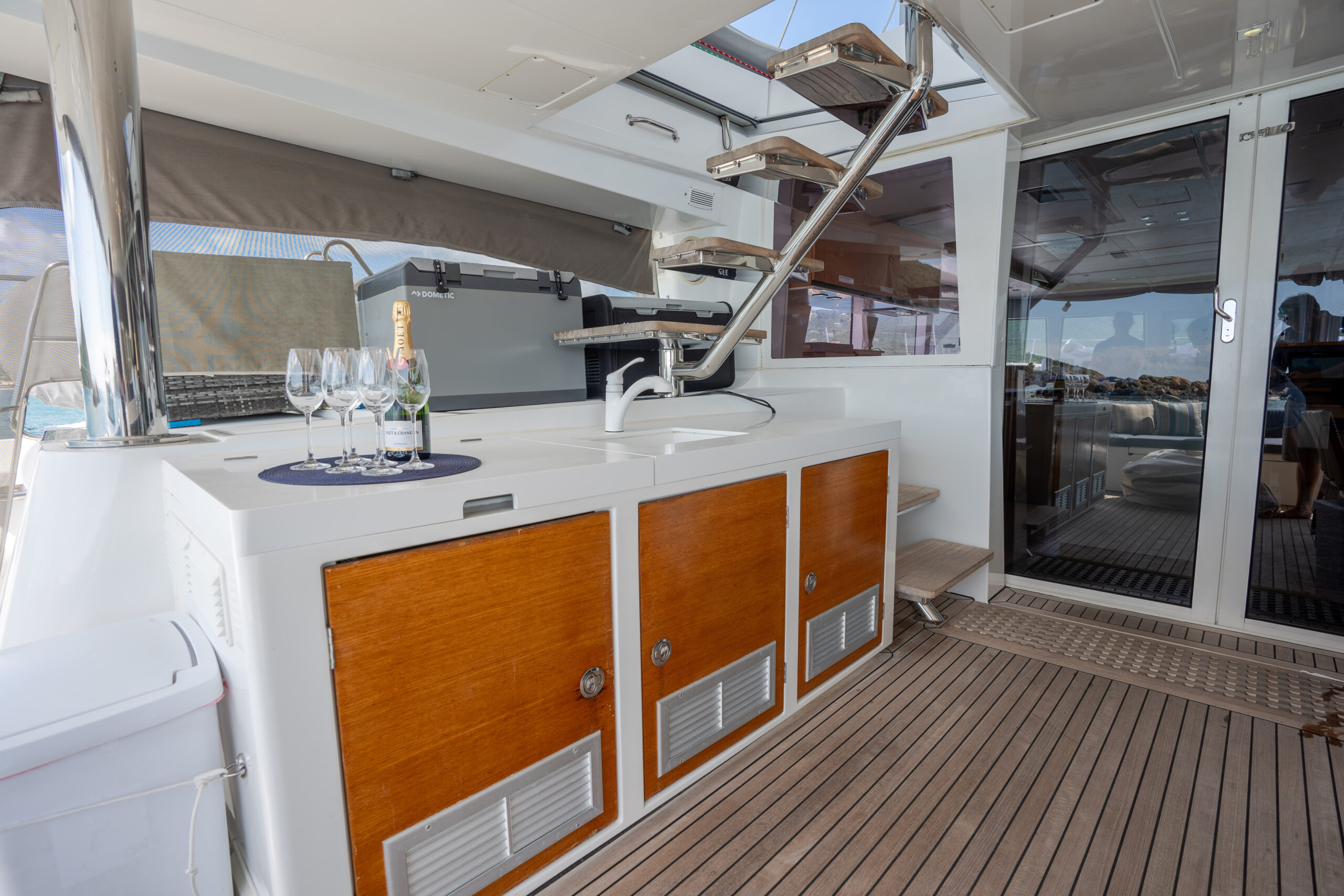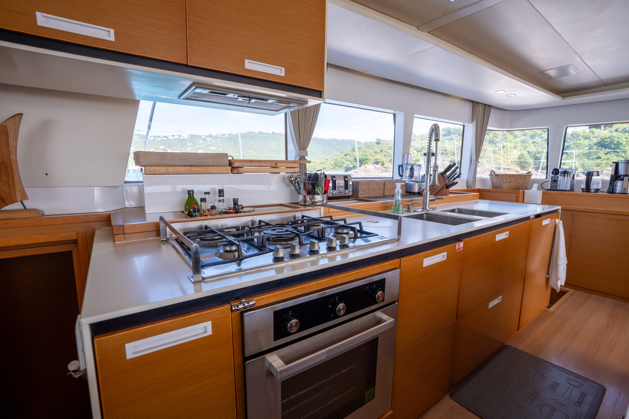 (5) burner stove top, white Corian counter tops, (2) waste bins, (2) Frigonautica stainless steel fridge and freezer in the galley. (1) Liebherr Premium Nofrost Fridge/Freezer at the base of the port companionway. (2) DOmetic 12/24v DC /AC fridge/freezers. (2) ice makers in cockpit. (1) Nespresso DiLahghi. Cultery, Flatware and Cookware. (1) Gelator Pro Ice Cream Maker. New watermaker 2021. New Miele dishwasher April 2022. Washing machine.