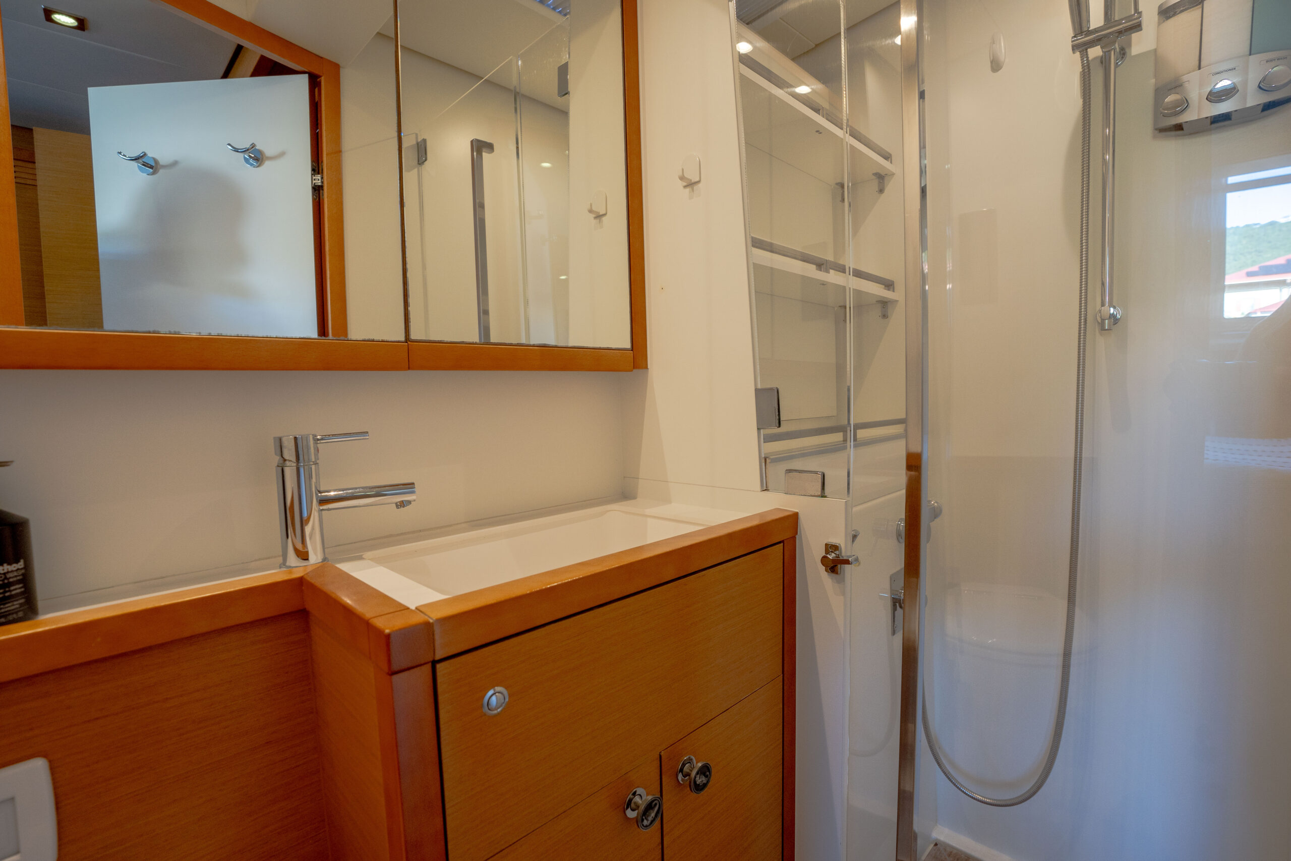 Access from forward companionway. Queen size bed with side access, wooden slats under mattress. Under berth storage, bedside storage, newly upholstered headboard, newly upholstered twin divider board, hanging locker with lights and shelves, (1) opening porthole. Opening Deck hatch with mosquito screen and blind, large one way fixed hull window, new functional total blackout window curtains and direct access to private head facility.TV. The midship starboard head has a separate dry shower stall with Plexiglas door, vanity cabinet with mirror, electric TECMA fresh water toilet, opening deck hatch with mosquito screen and blind and (3) spotlights.