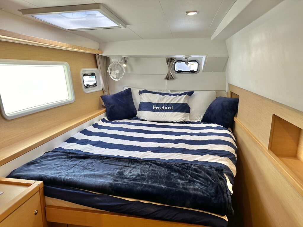 On the port side of Freebird, you have two cabins and one shared head. The aft cabin features a large queen berth and a good size hanging locker. The forward cabin can used as two singles or as one large double berth, which also has a hanging locker. There is a large head with a separate stall shower, shared between the two port side cabins.