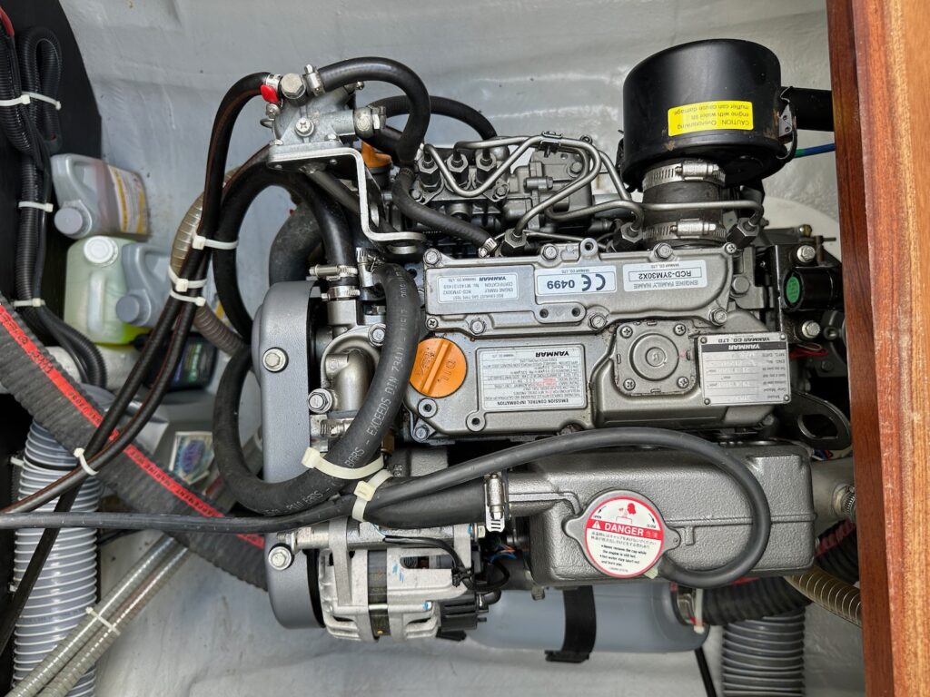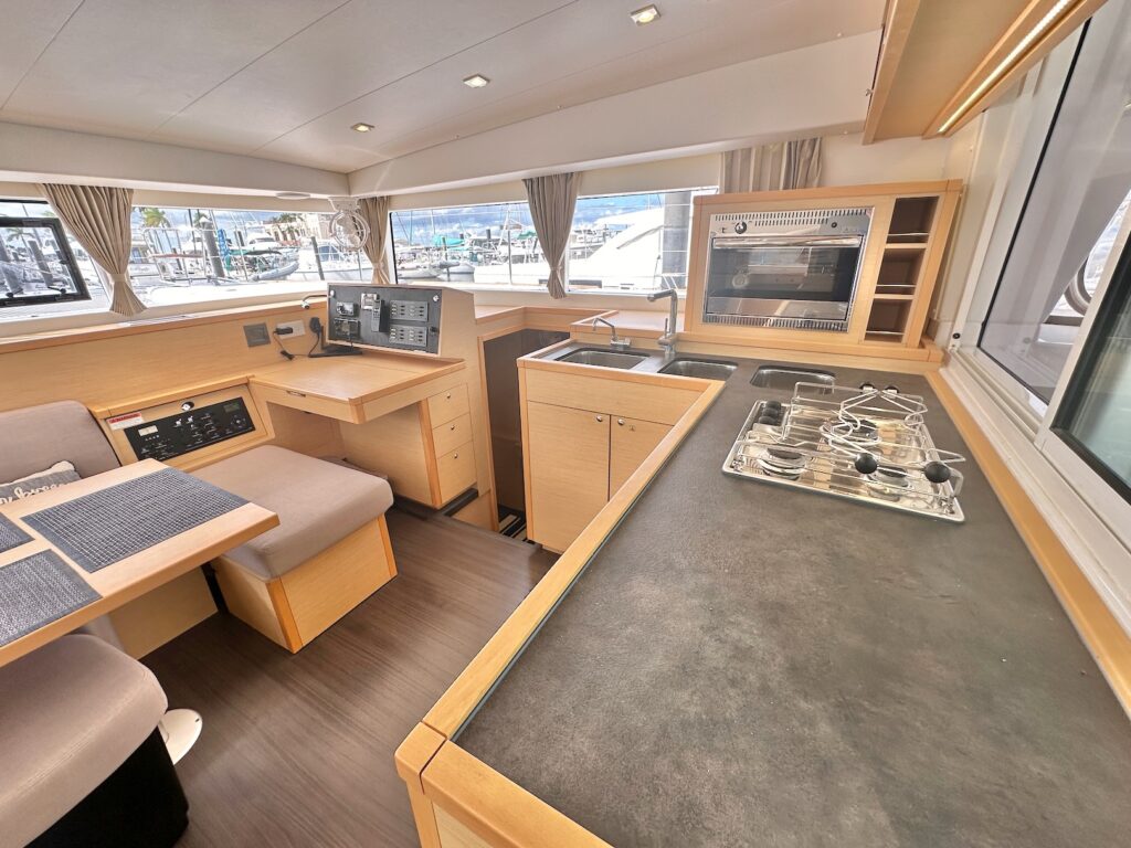 “Freebird” is the most desired 3 cabin owners version. She offers a large main salon and galley with sliding doors, and sliding pass thru windows out to the cockpit. The salon also features a very large settee and dinning table, which can convert into a double berth if needed.