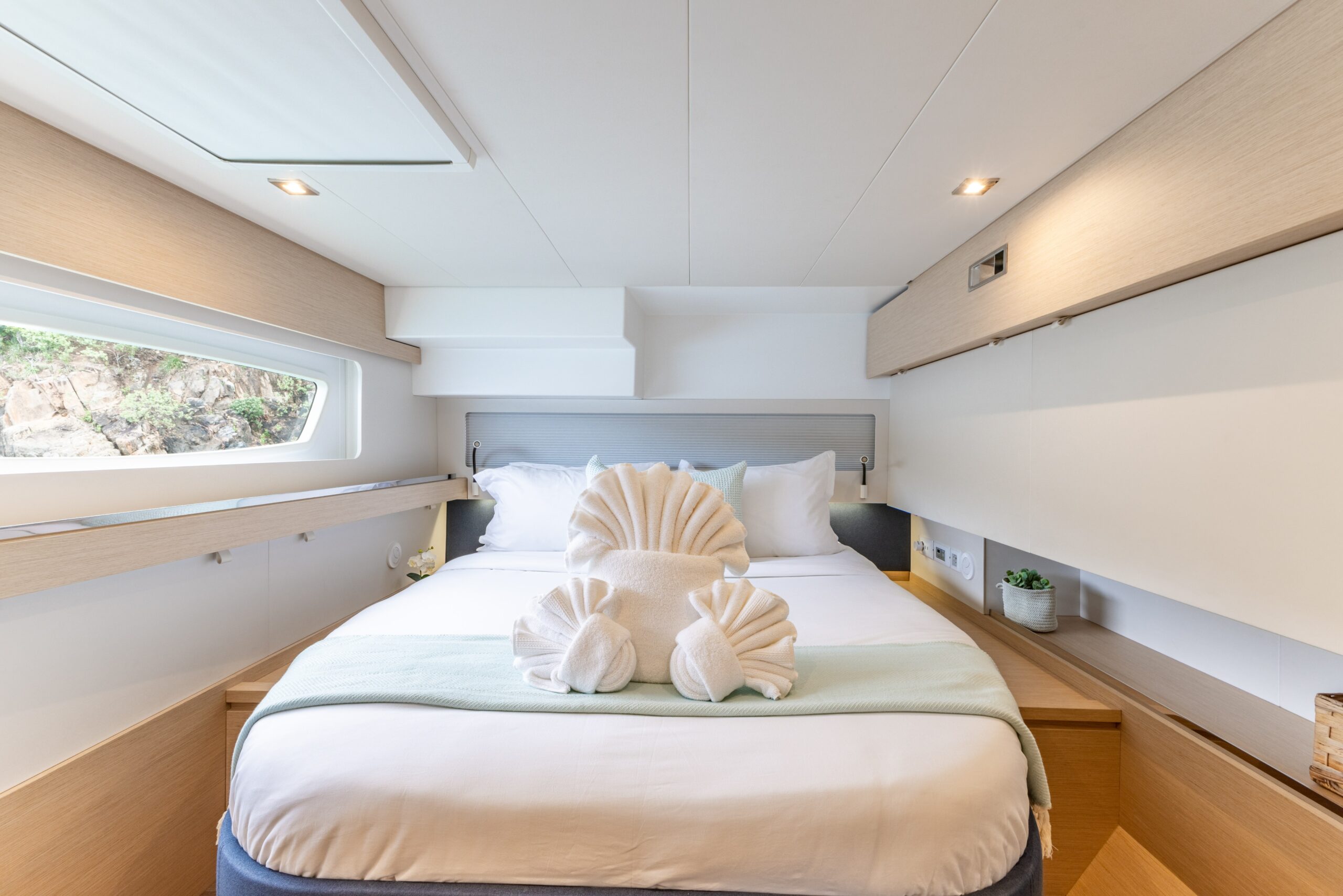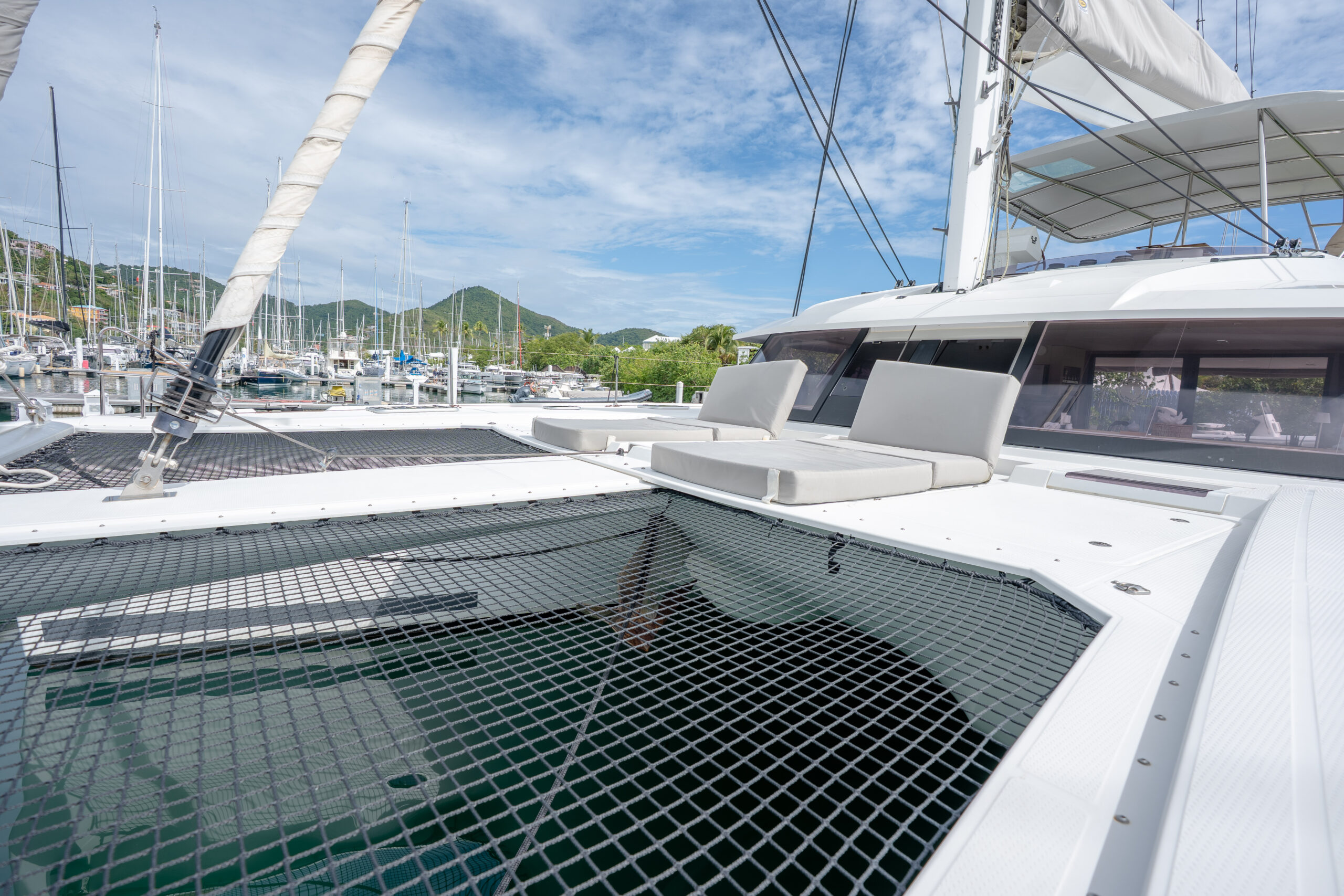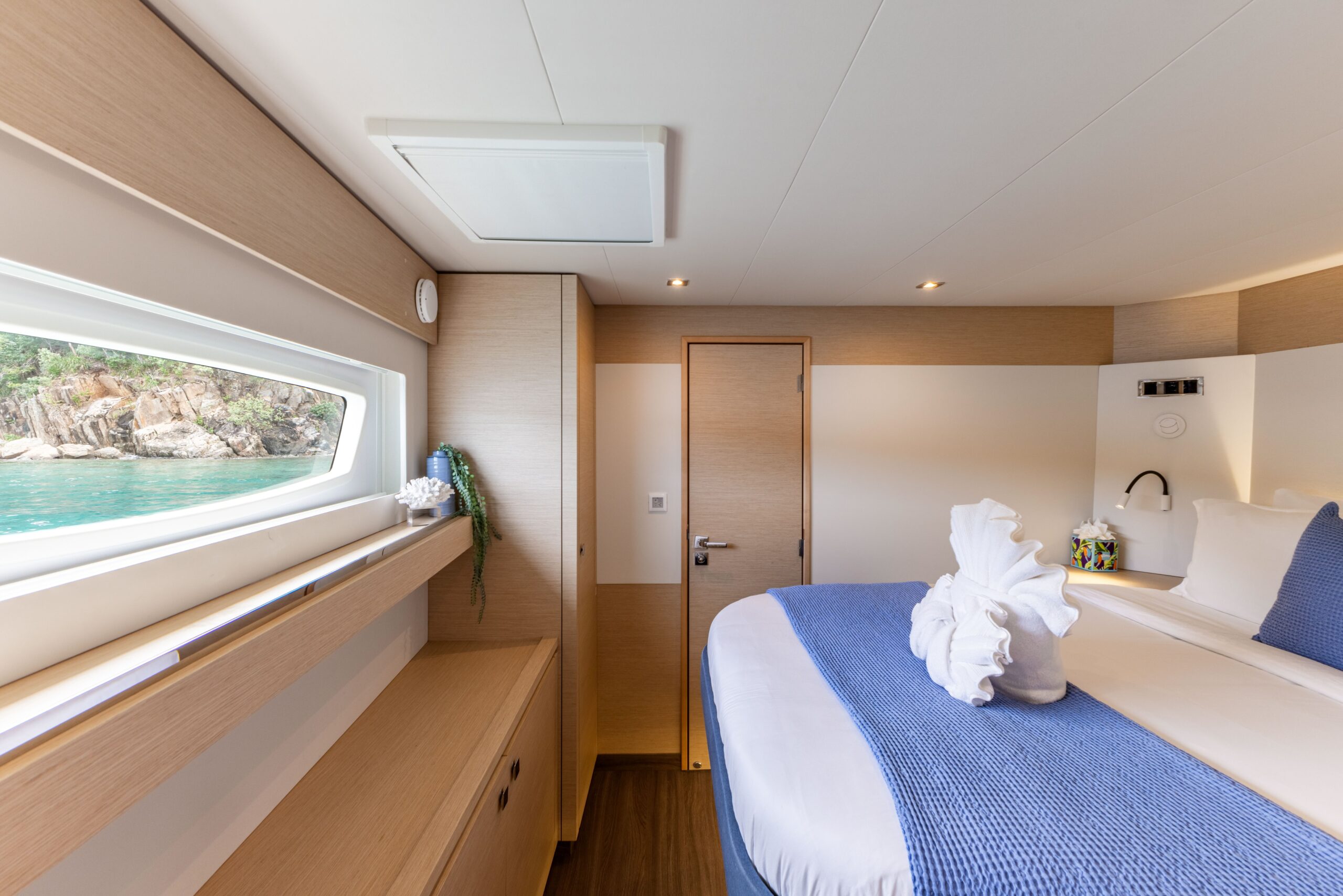 Host long lazy lunches in the stunning 25m2 cockpit that comfortably accommodates the largest group of guests, and then unwind on the inspired modular sunbathing deck on the catamaran’s expansive foredeck. This cruising catamaran includes the largest flybridge on the market with dual access points to deliver safe and convenient movement onboard.
