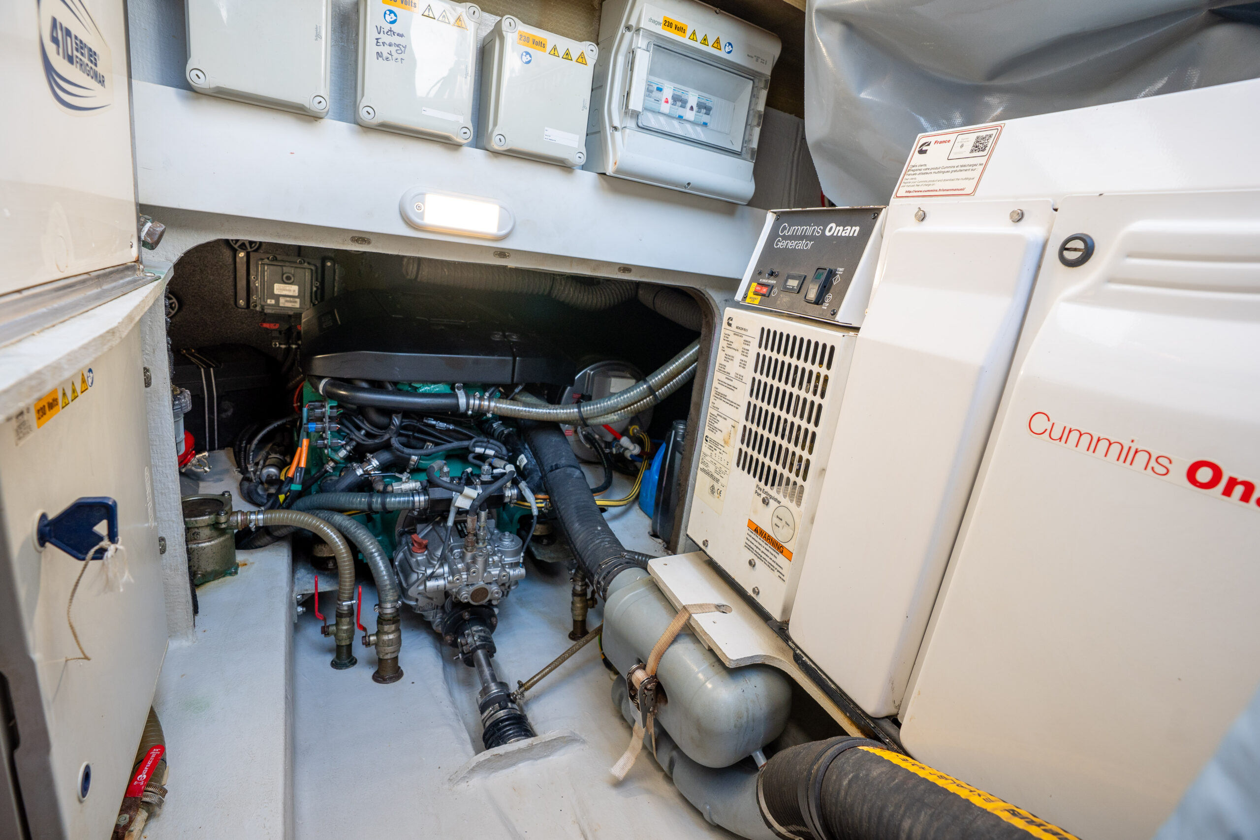 Access via a wooden door from the aft companionways, double bed (1,60 X 2,00m approx.), bedside cabinet, drawer under the bed, cupboards and wardrob, ventilation via a deck hatch with blind and flyscreen on the deck hatch, large picture-window on hull side, window curtain, lining covered ceilings, main lighting by embedded LED spotlights and 2 bedside reading lights