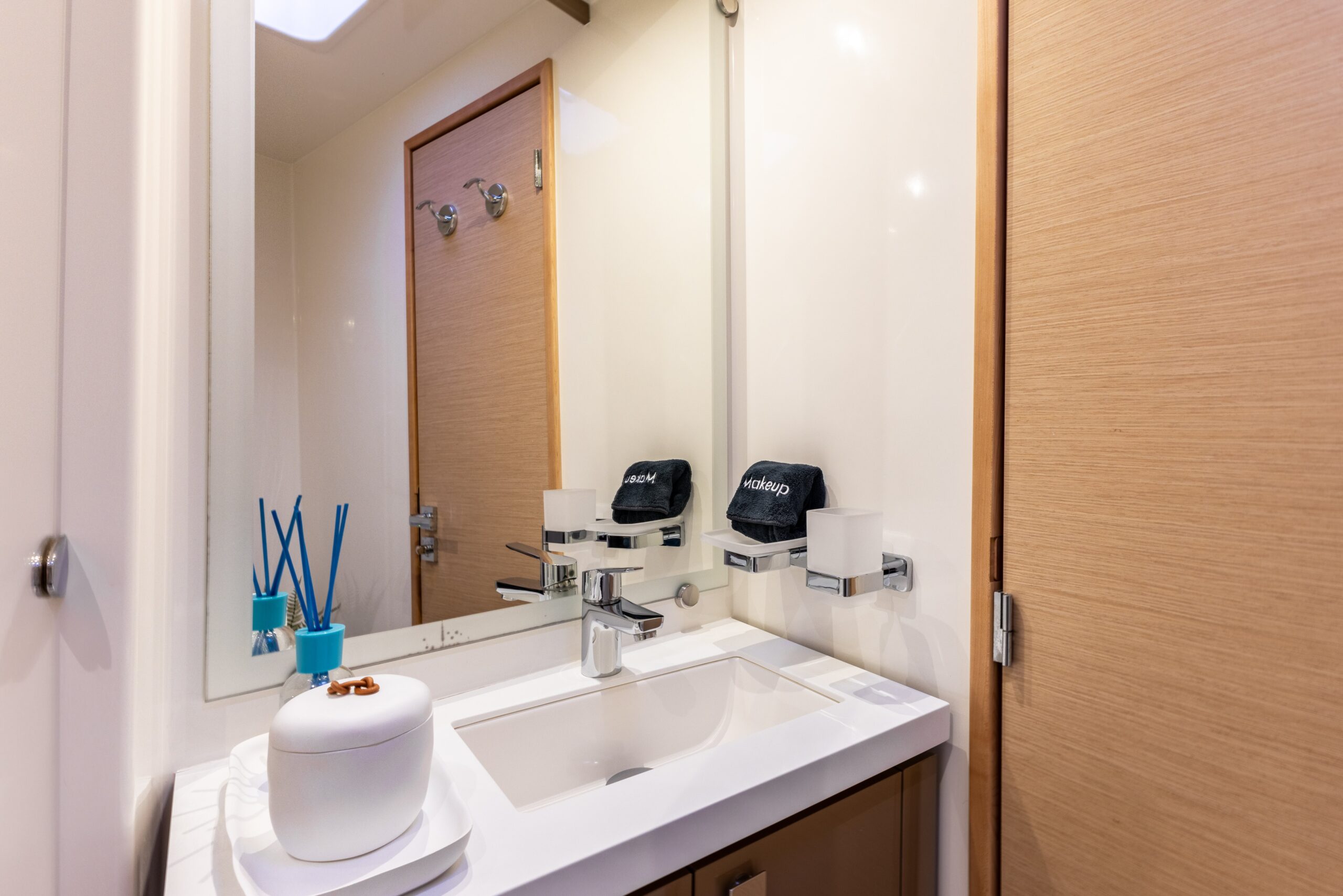 Bathroom: Private access from the cabin, counter top with washbasin, mirror, shower cabin with automatic drainage of the grey water, bathroom accessories, ventilation via 1 deck hatch, lighting - waterproof LED spotlights, cupboard under washbasin