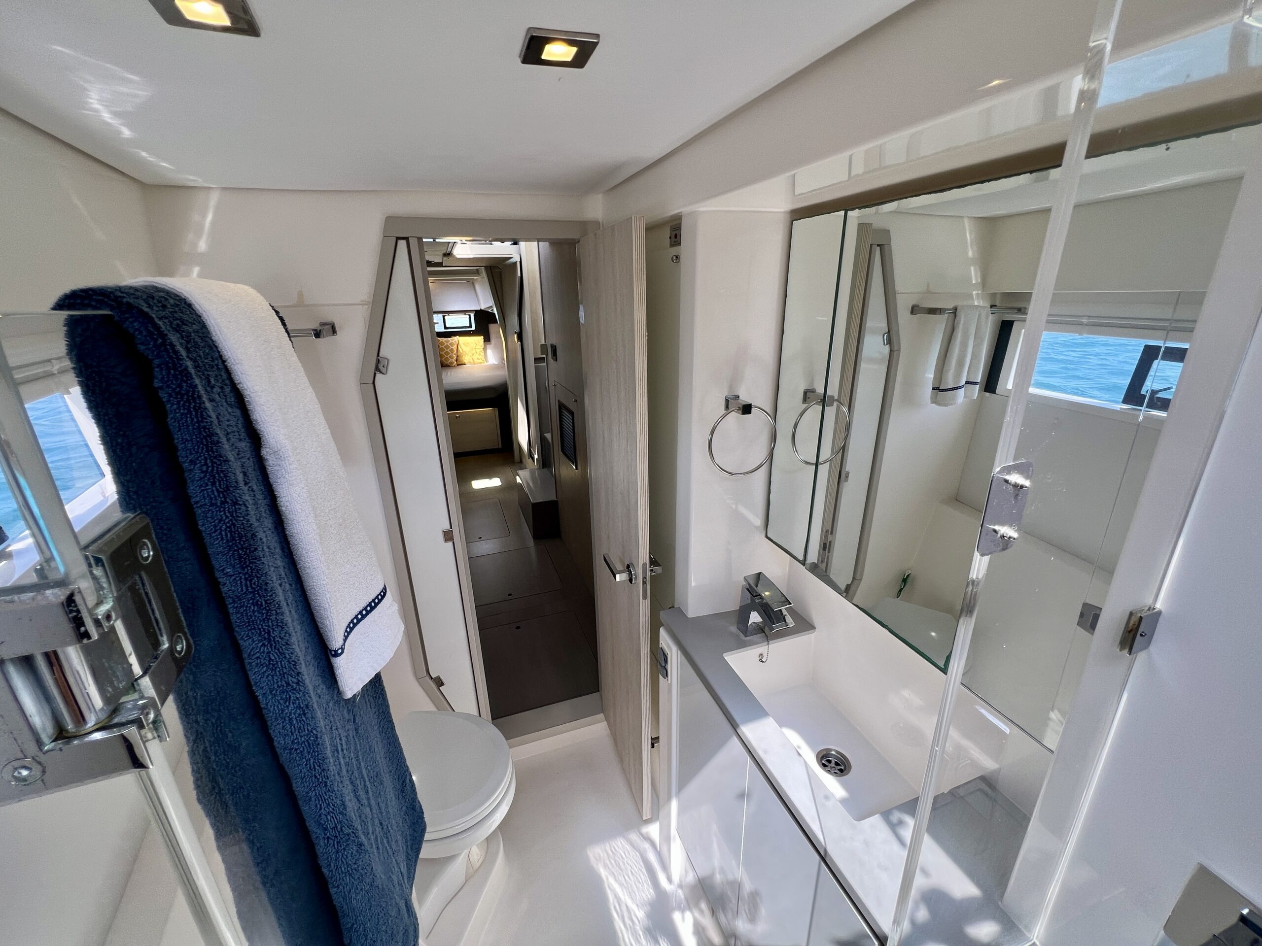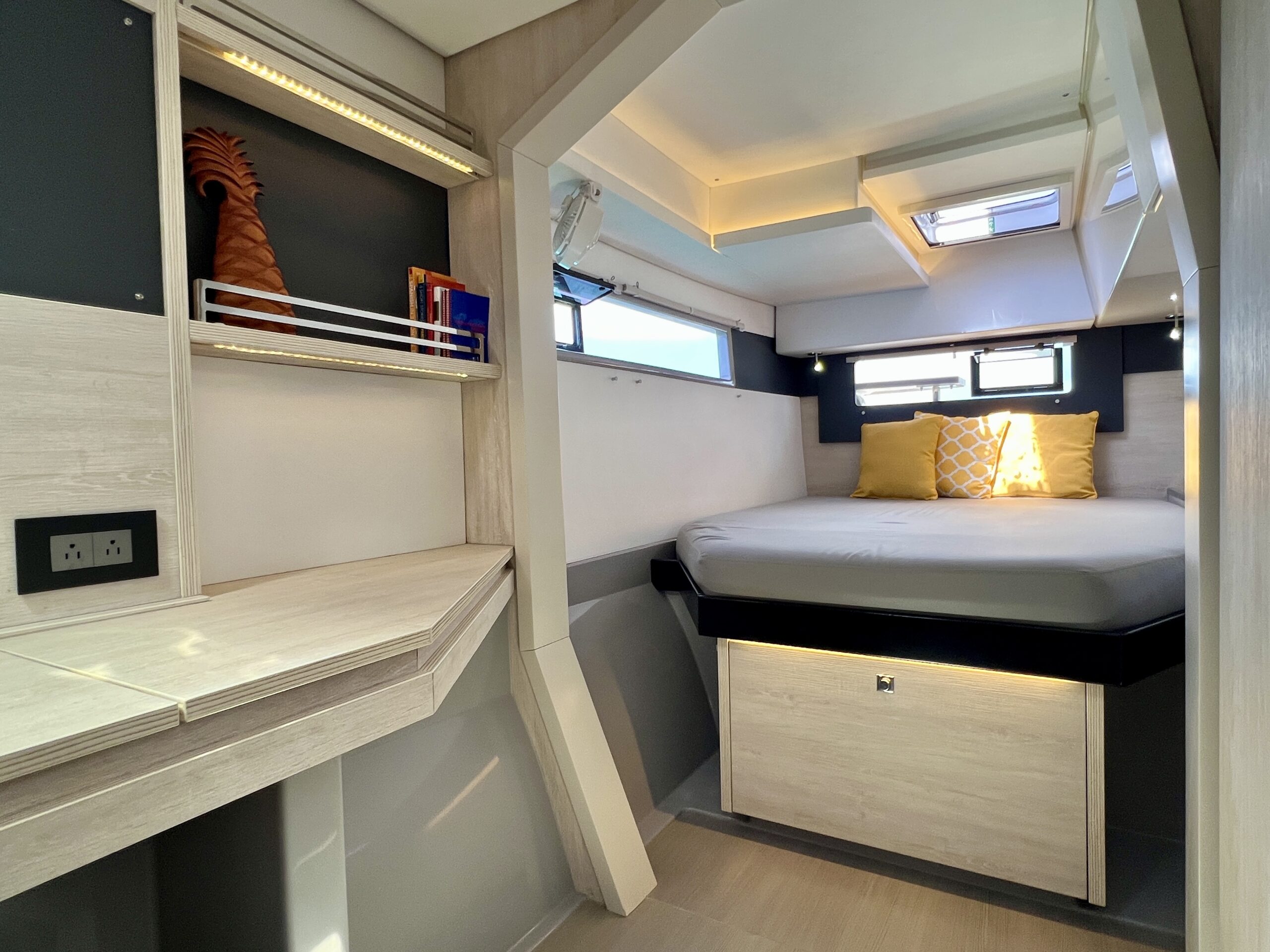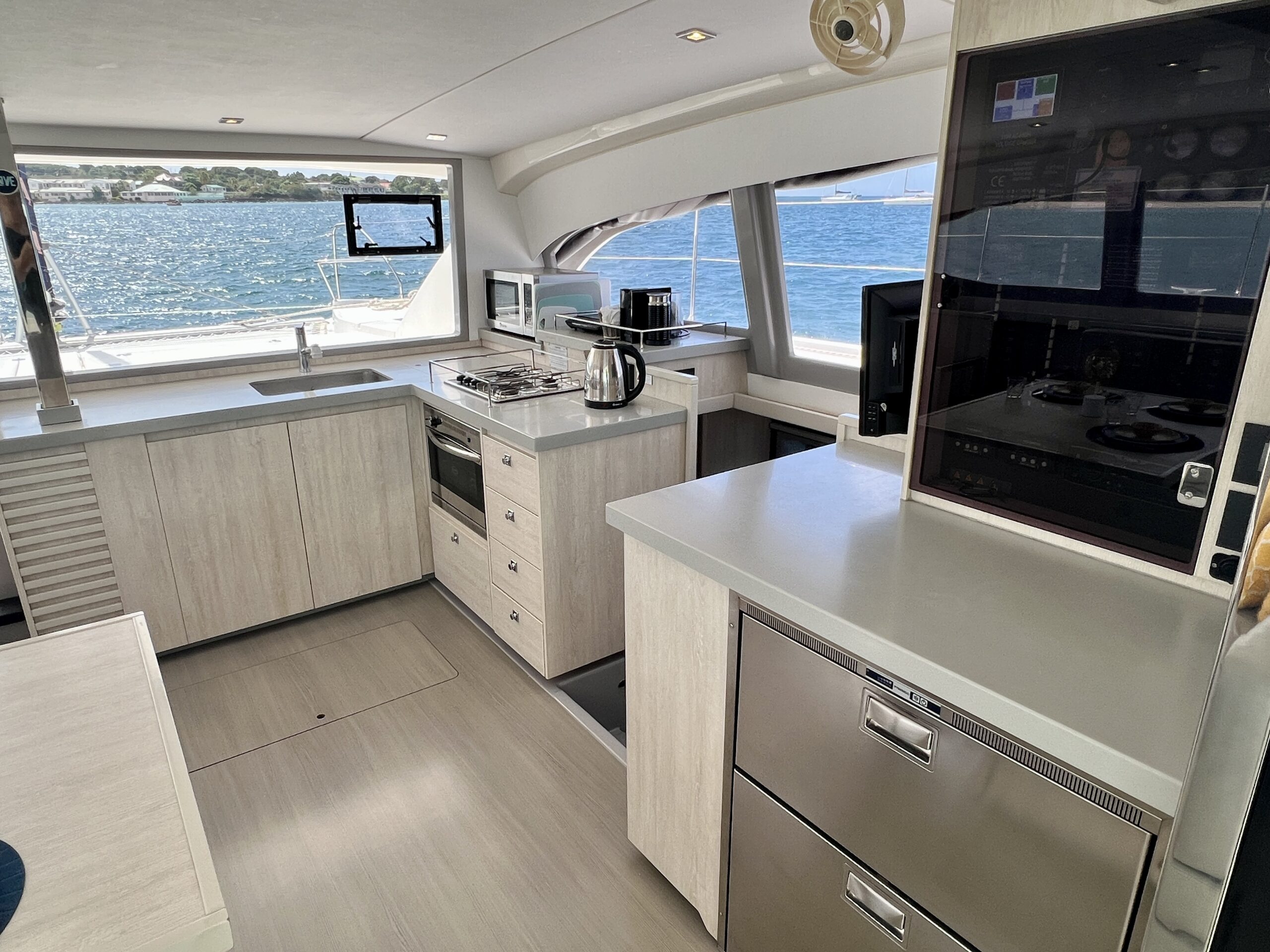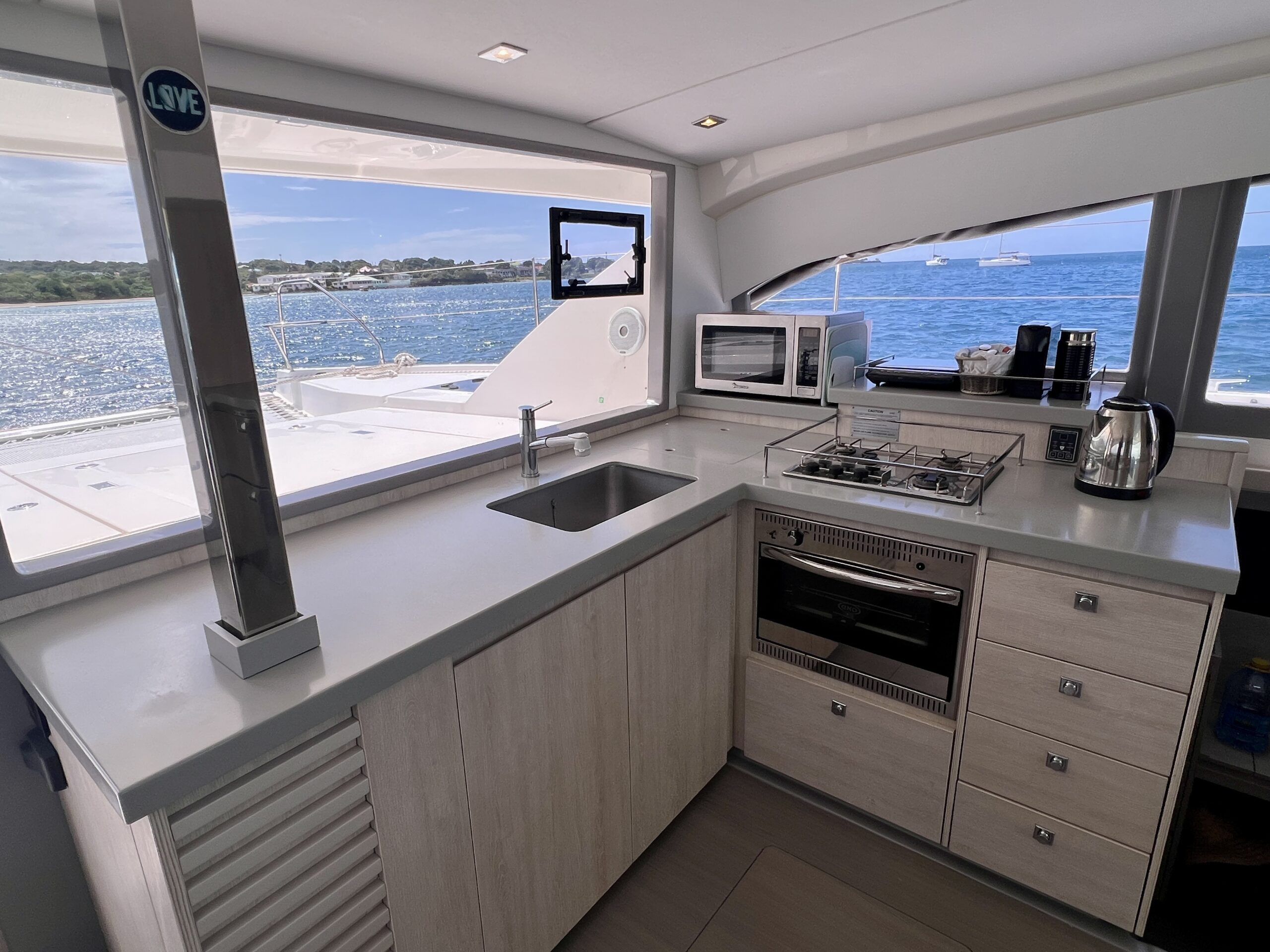 She is set up to run the starboard air conditioner off the battery bank for a truly off grid experience. This 2019 Leopard 40 has the redesigned aft cabins featuring semi-island berths, access steps, concealed strip lighting under shelves, berths, and ceiling fixtures, and more overall space than the previous version. She offers more interior living space than other catamarans in this range.