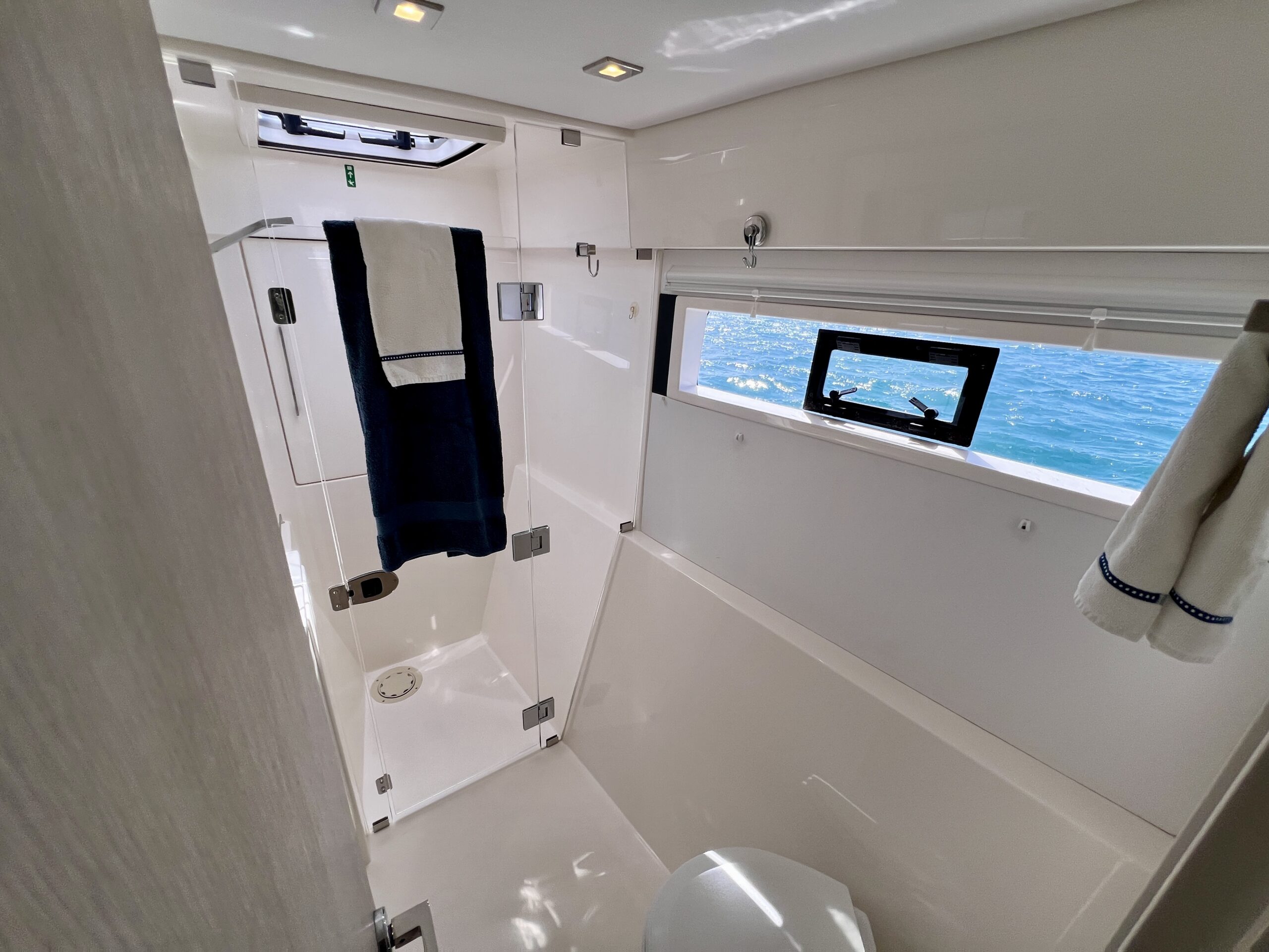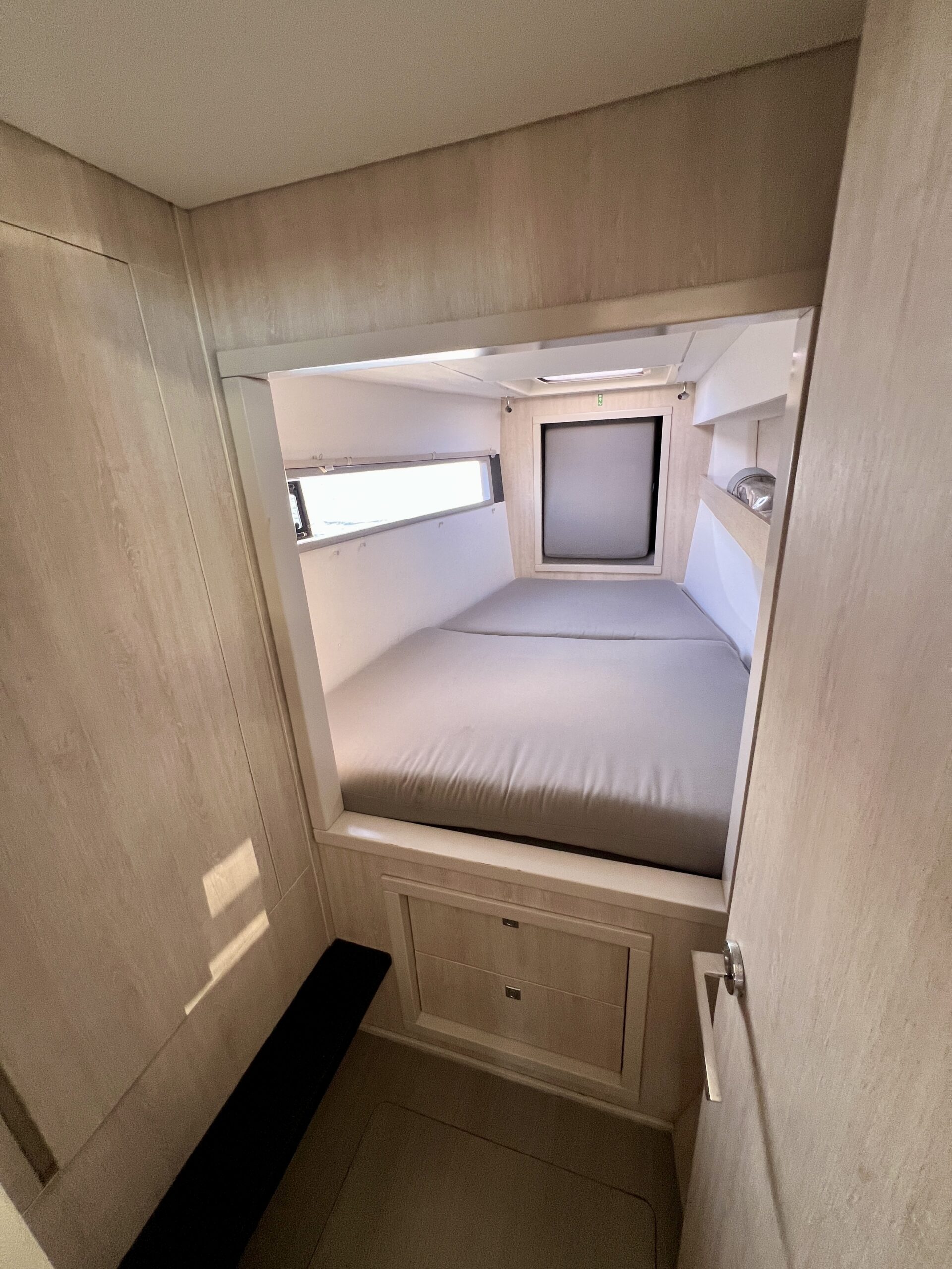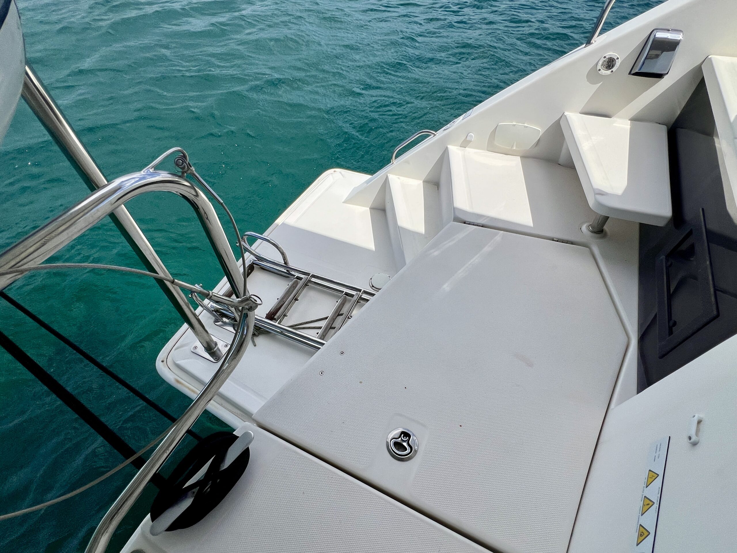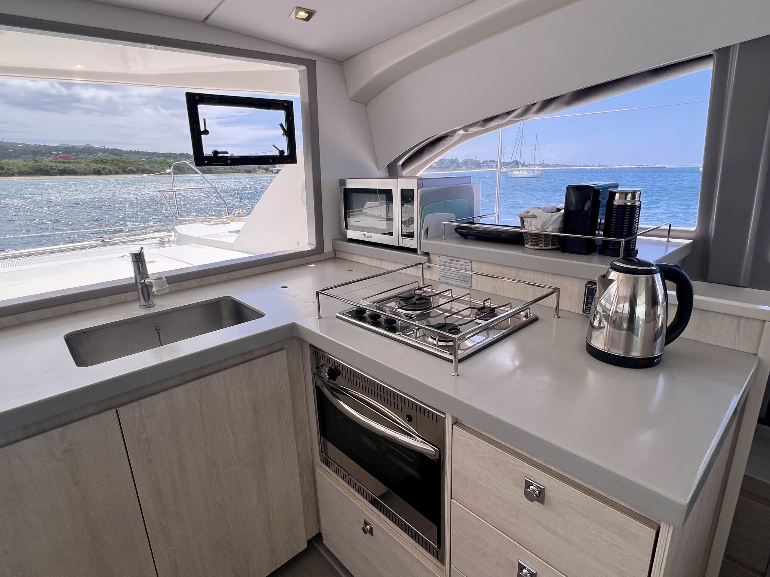 She is set up to run the starboard air conditioner off the battery bank for a truly off grid experience. This 2019 Leopard 40 has the redesigned aft cabins featuring semi-island berths, access steps, concealed strip lighting under shelves, berths, and ceiling fixtures, and more overall space than the previous version. She offers more interior living space than other catamarans in this range.