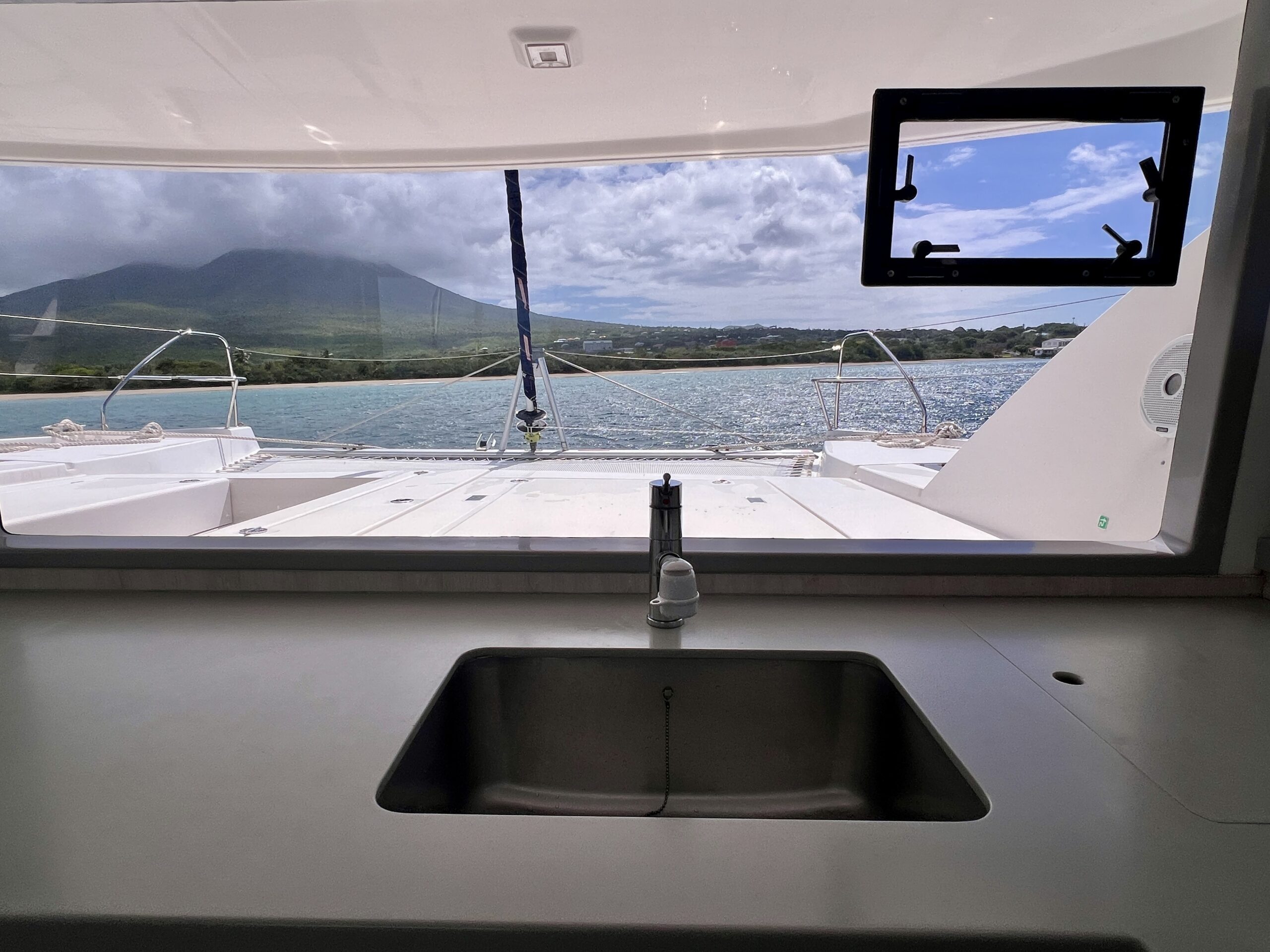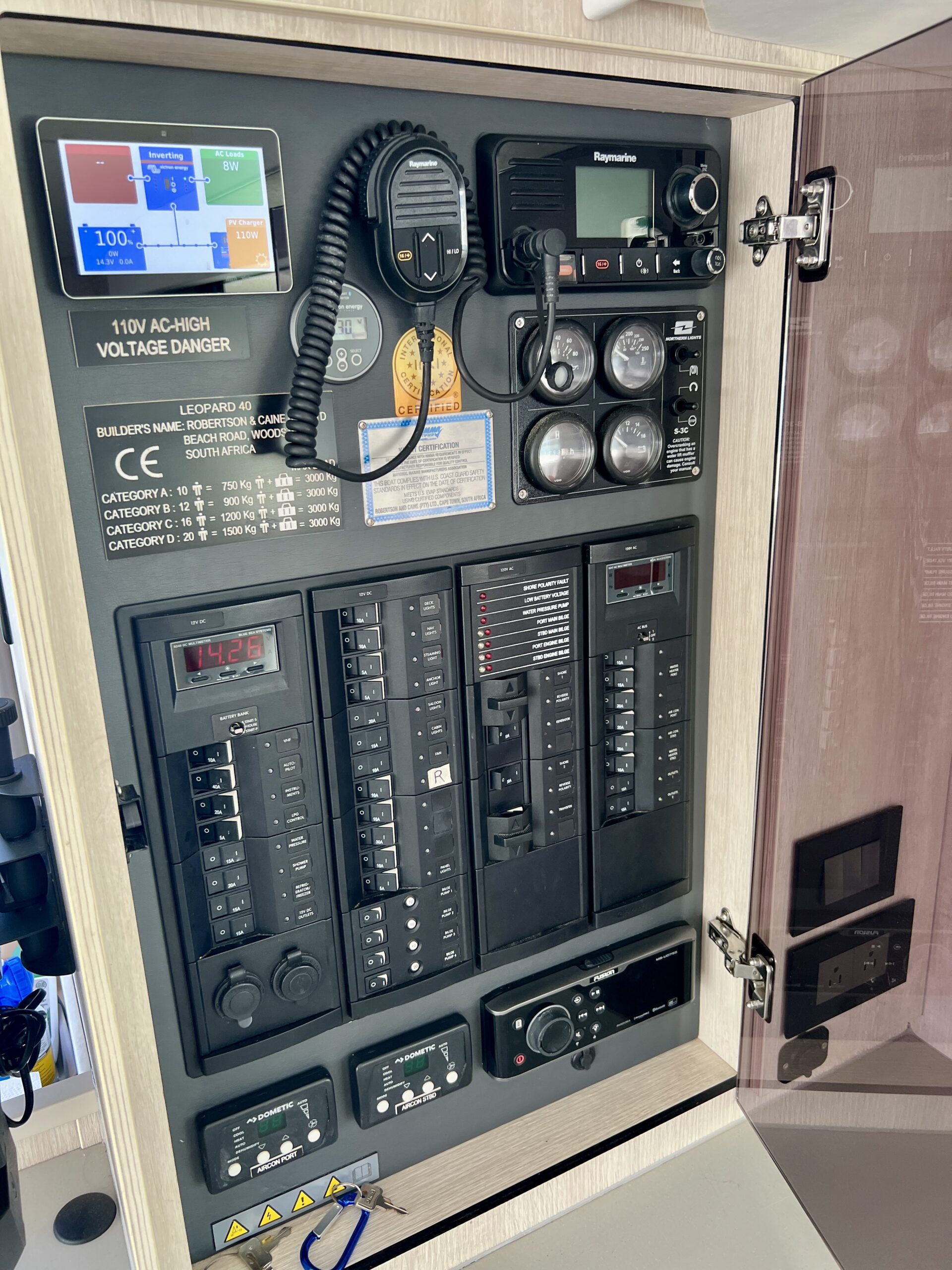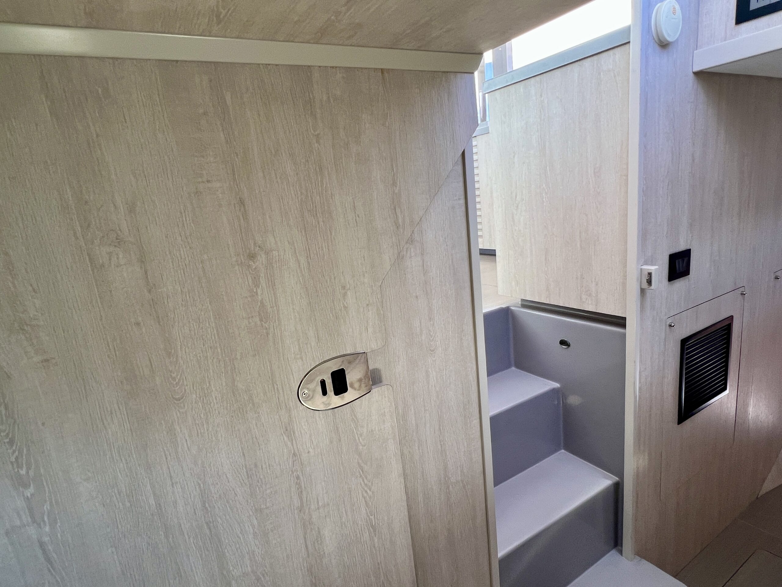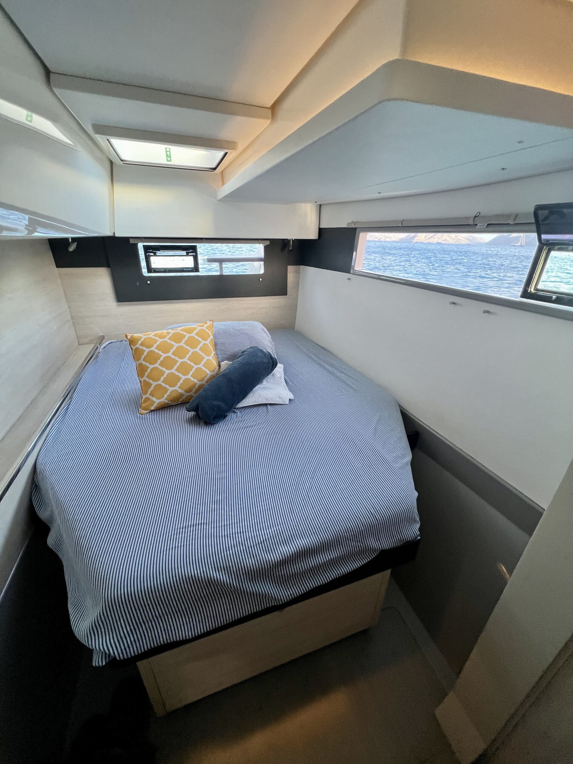 She is set up to run the starboard air conditioner off the battery bank for a truly off grid experience. This 2019 Leopard 40 has the redesigned aft cabins featuring semi-island berths, access steps, concealed strip lighting under shelves, berths, and ceiling fixtures, and more overall space than the previous version. She offers more interior living space than other catamarans in this range.