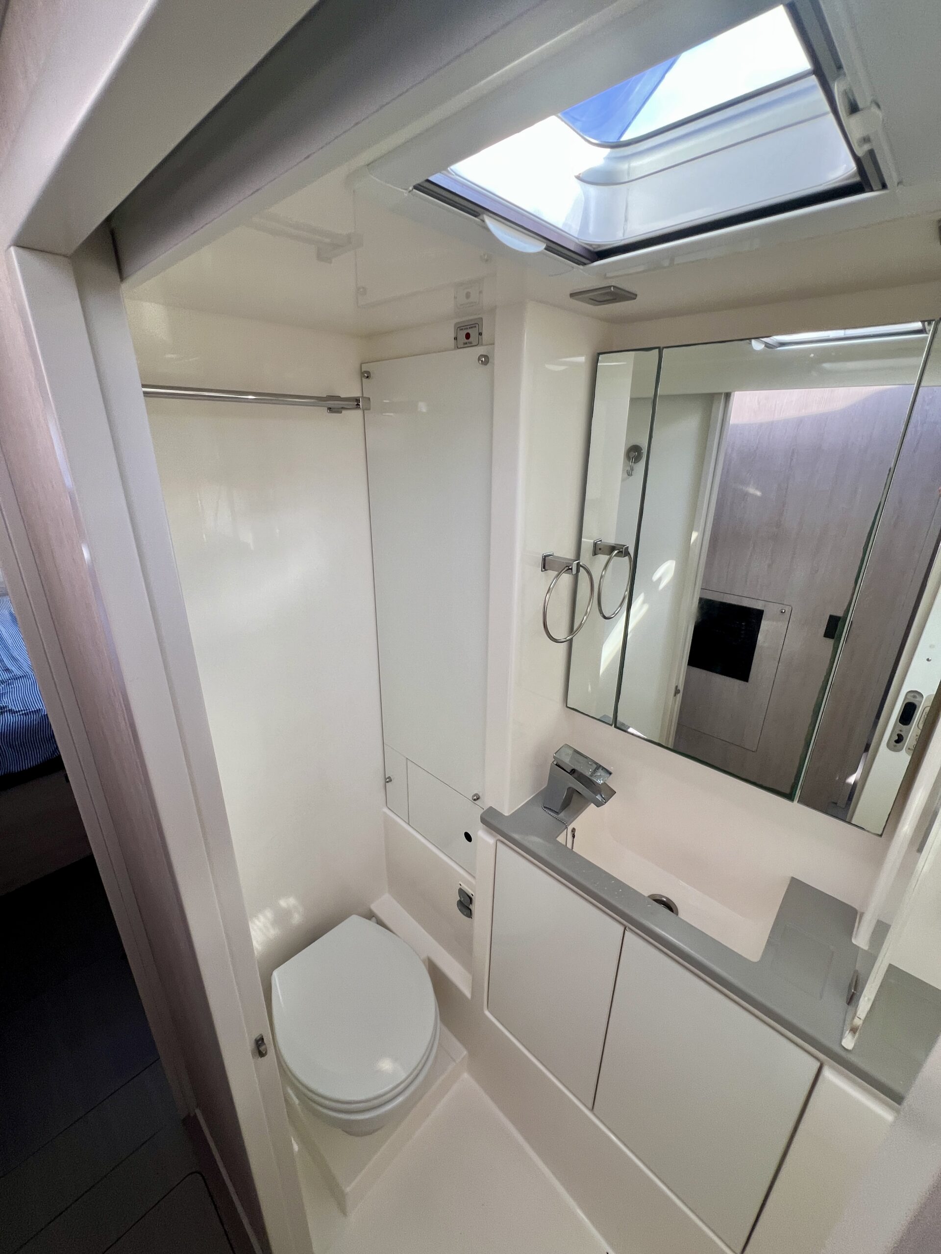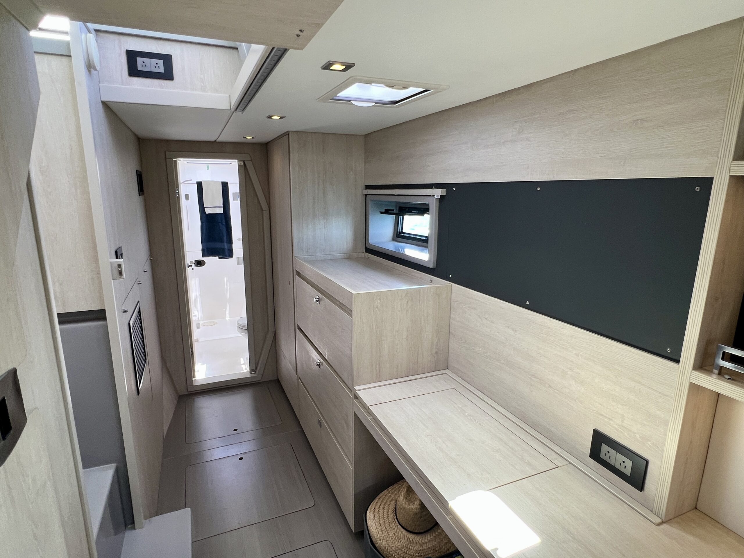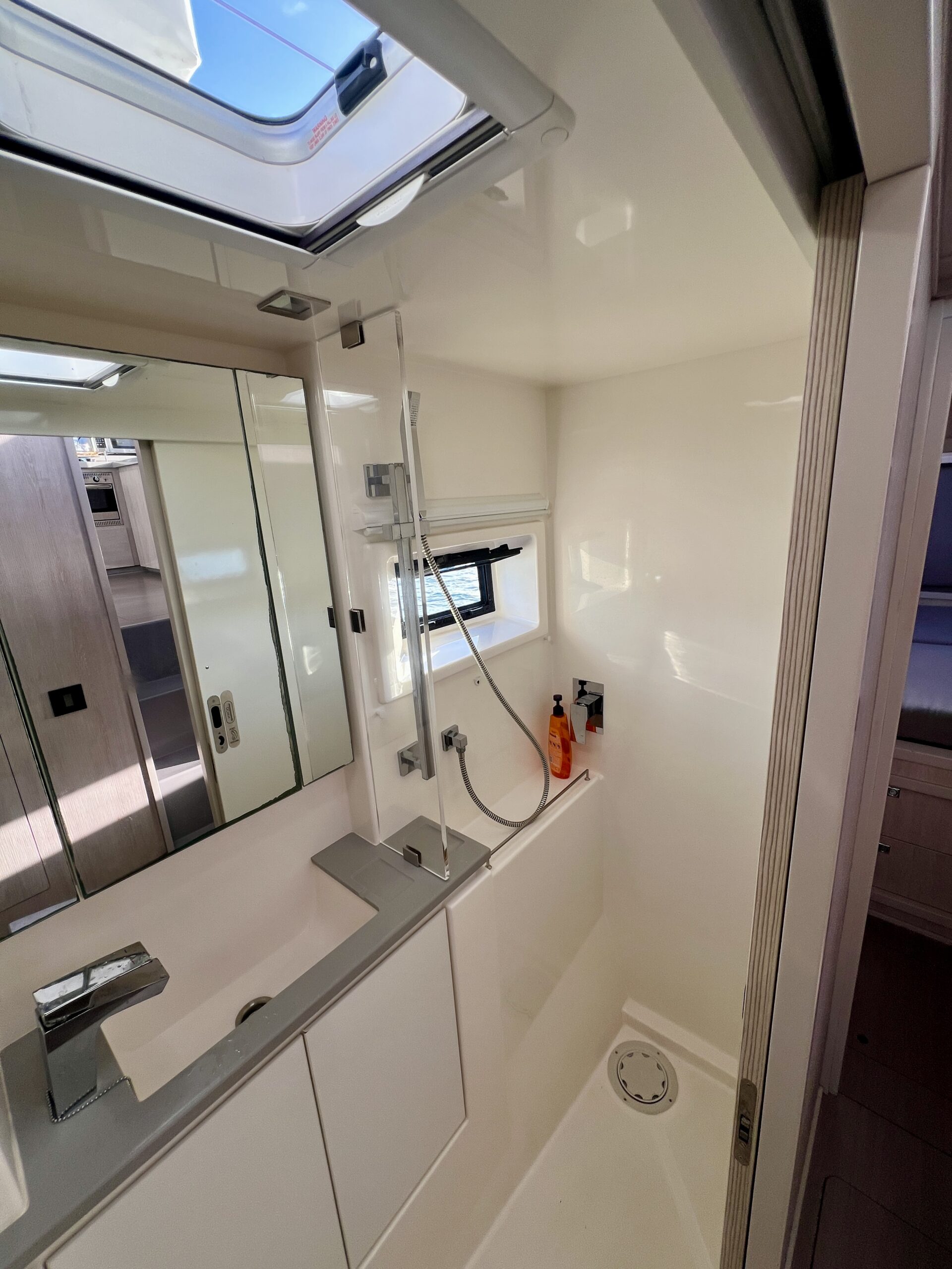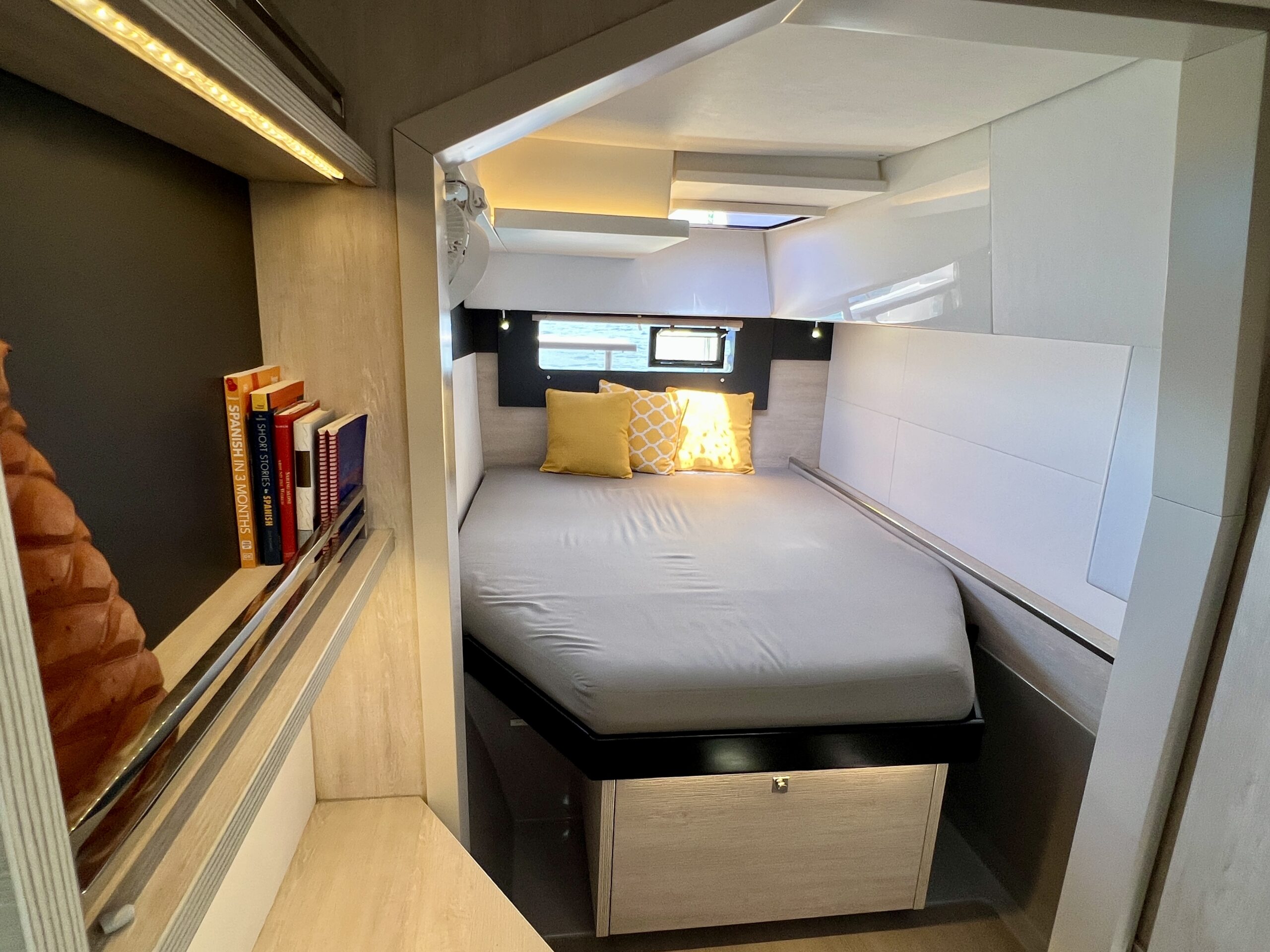 She is set up to run the starboard air conditioner off the battery bank for a truly off grid experience. This 2019 Leopard 40 has the redesigned aft cabins featuring semi-island berths, access steps, concealed strip lighting under shelves, berths, and ceiling fixtures, and more overall space than the previous version. She offers more interior living space than other catamarans in this range.