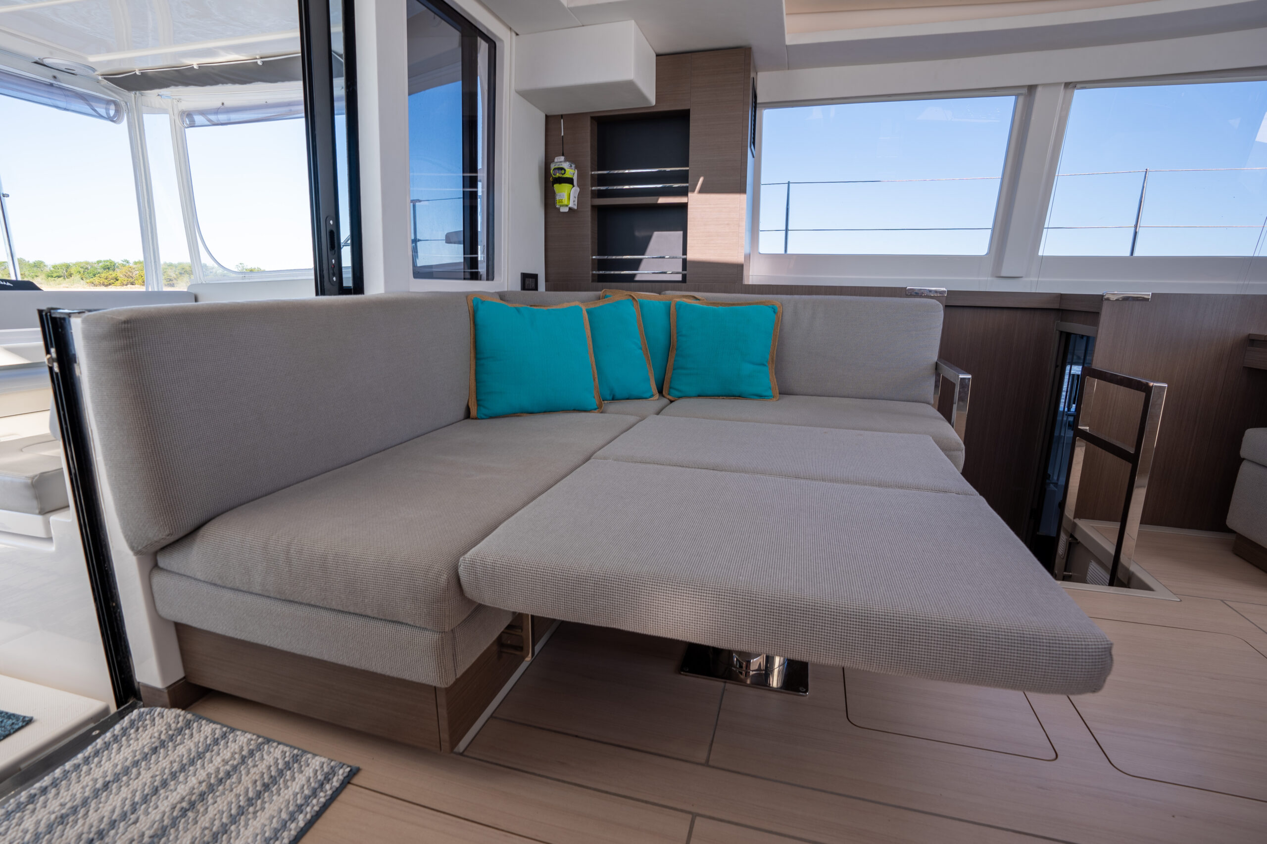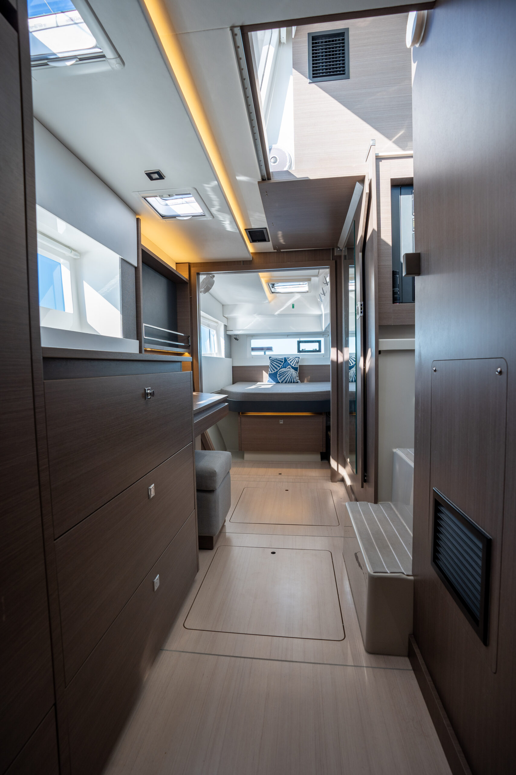 The interior design has adopted the styling that was developed for the award-winning Leopard 53 Powercat. With modern contrasts, indirect lighting, and classy finishes, the Leopard 42 brings more luxury and elegance to the Leopard sailboat range. All bunks are now island berths that allow access from both sides. With windows everywhere space permitted, the natural light is amplified.