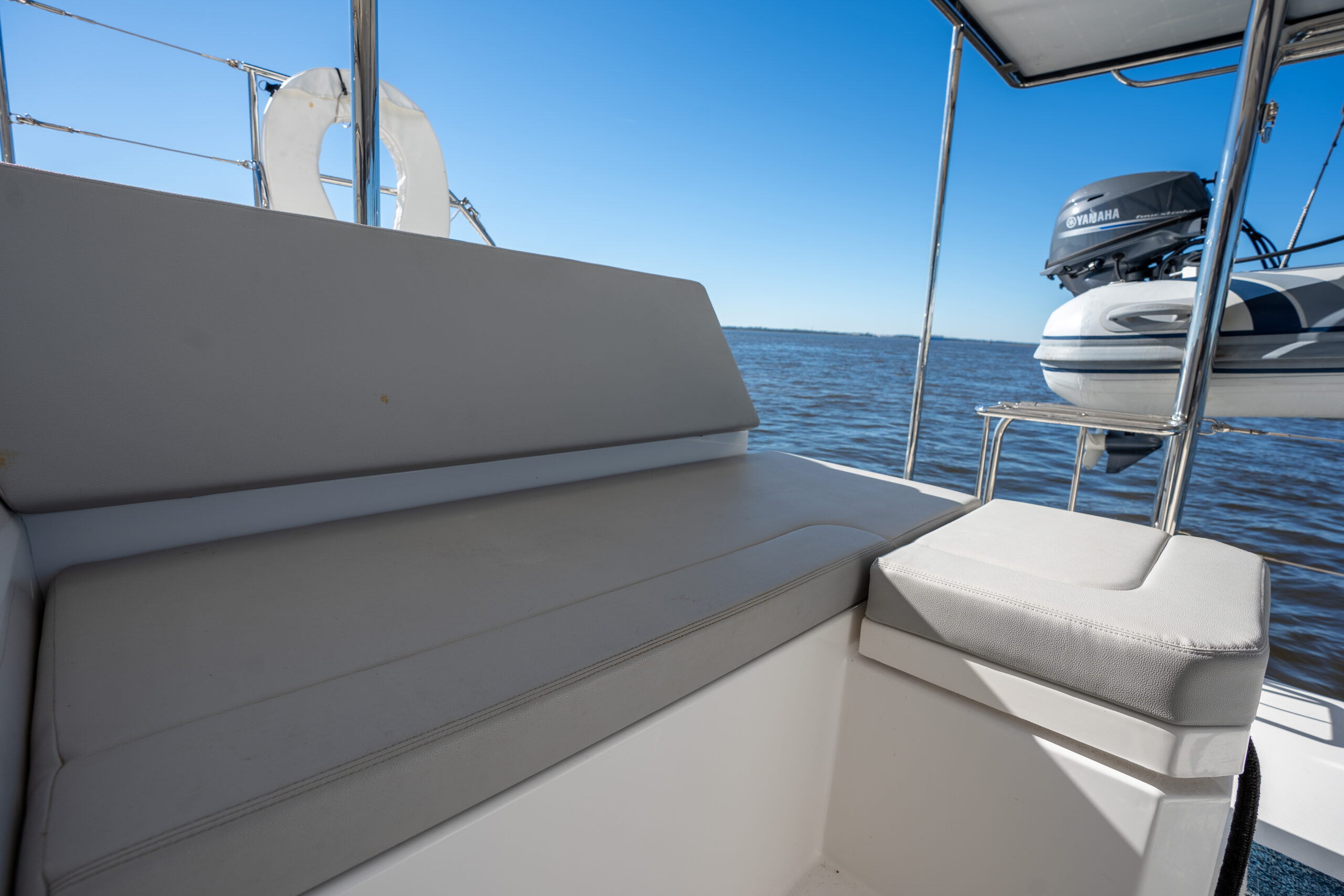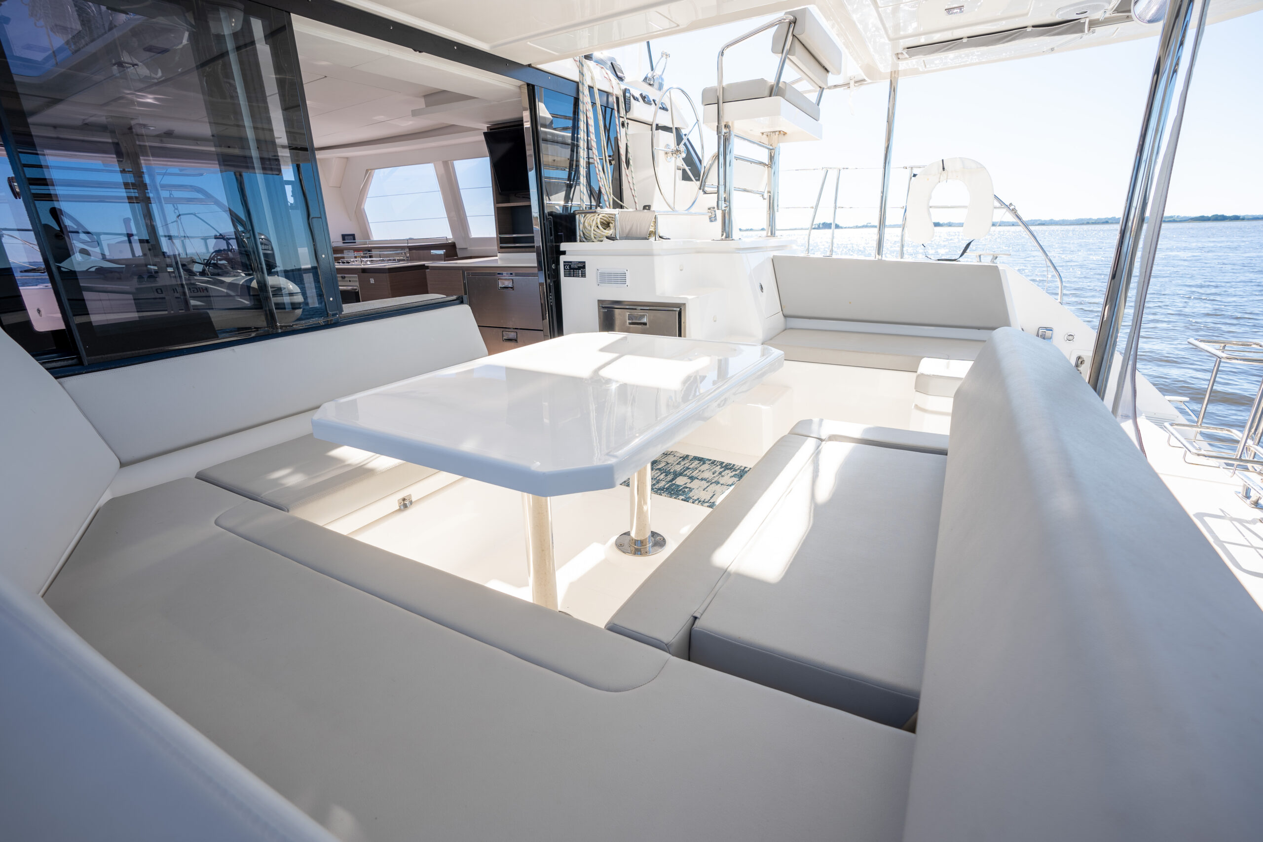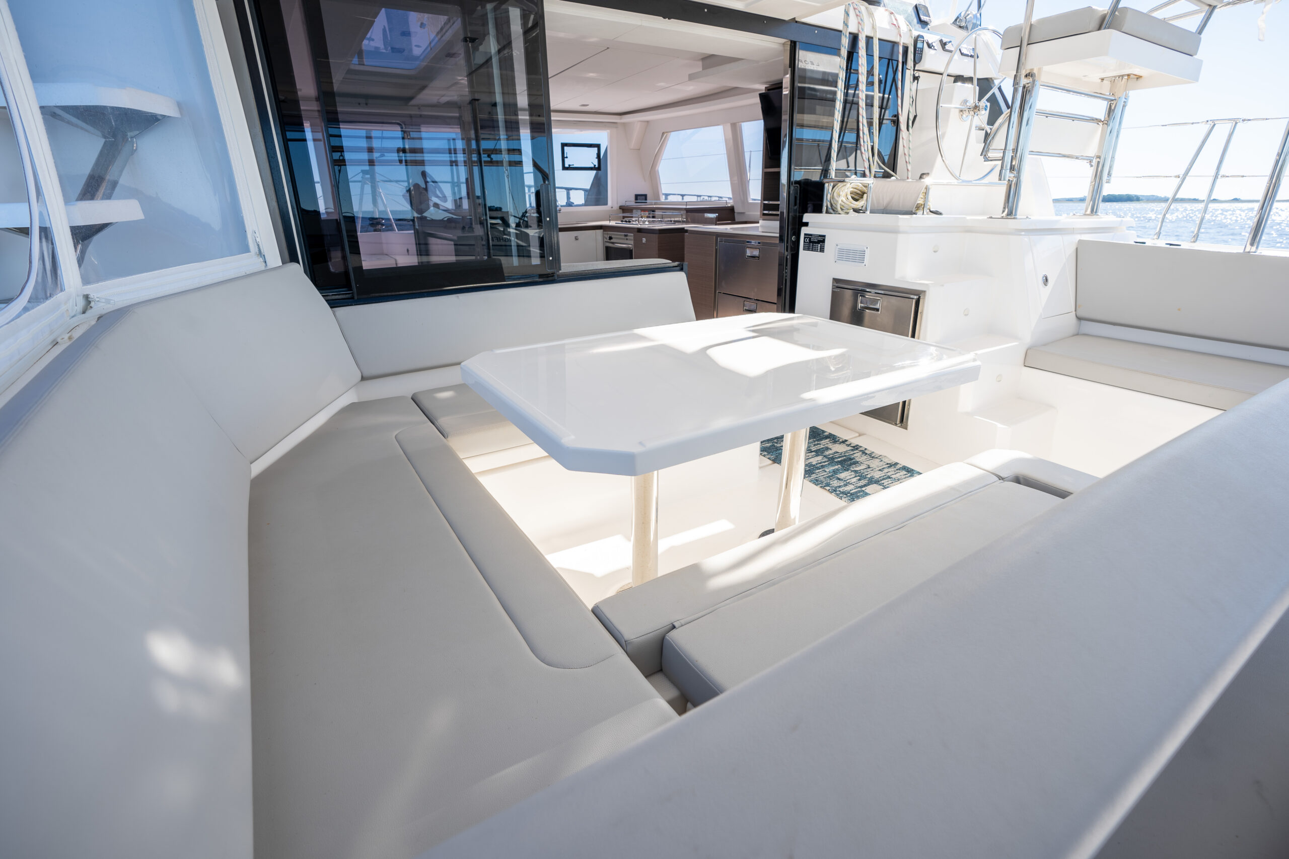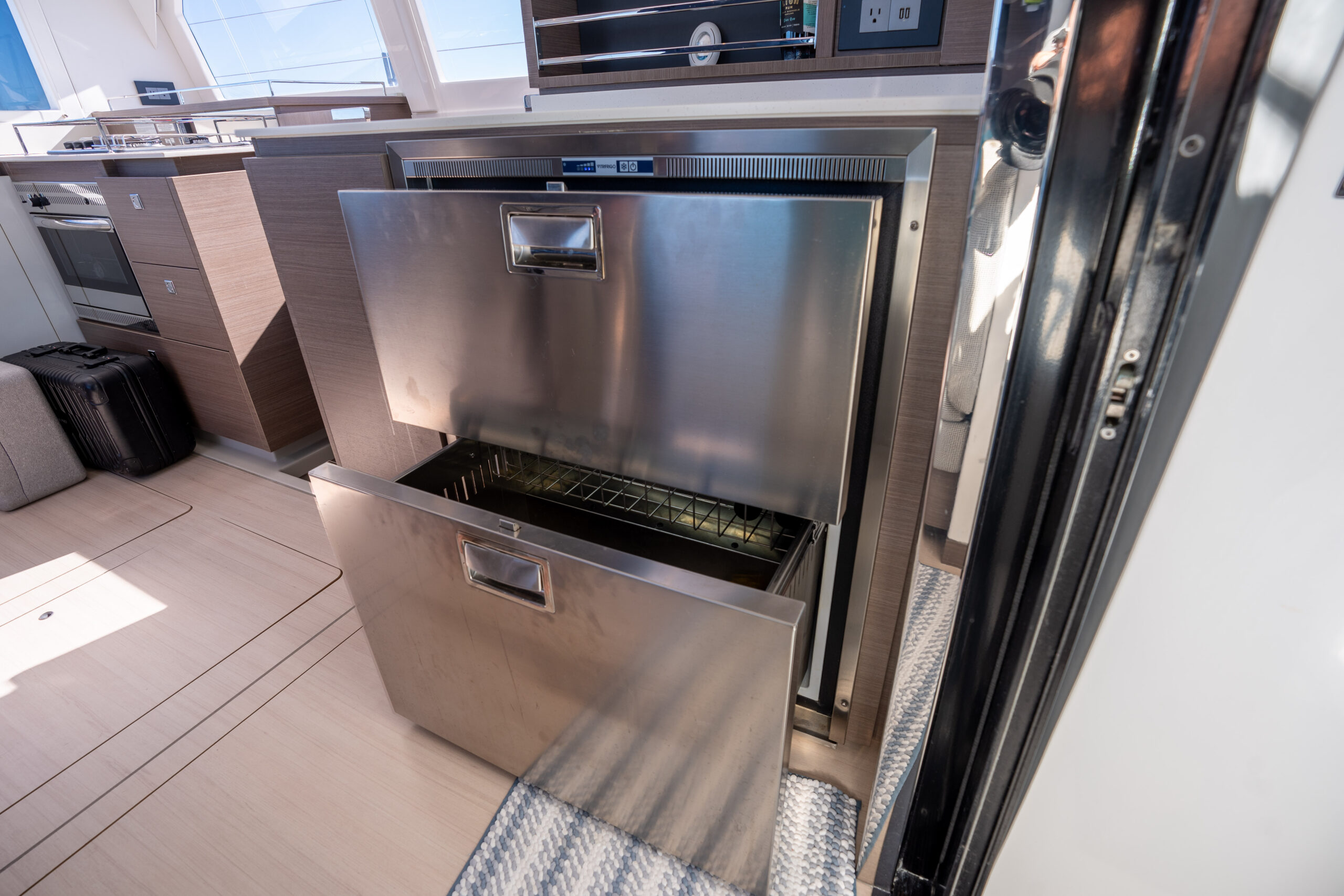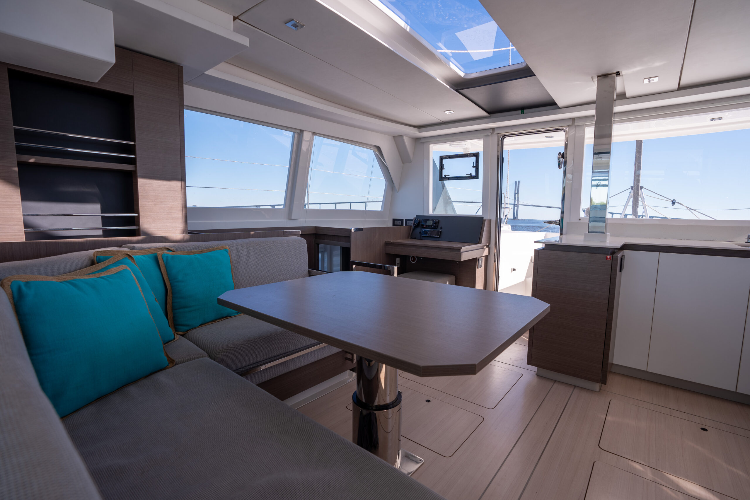 In the saloon, we have added a generous skylight, as well and an additional window in the aft starboard corner facing the helm seat. The forward-facing L-shaped galley is sure to entice any chef!