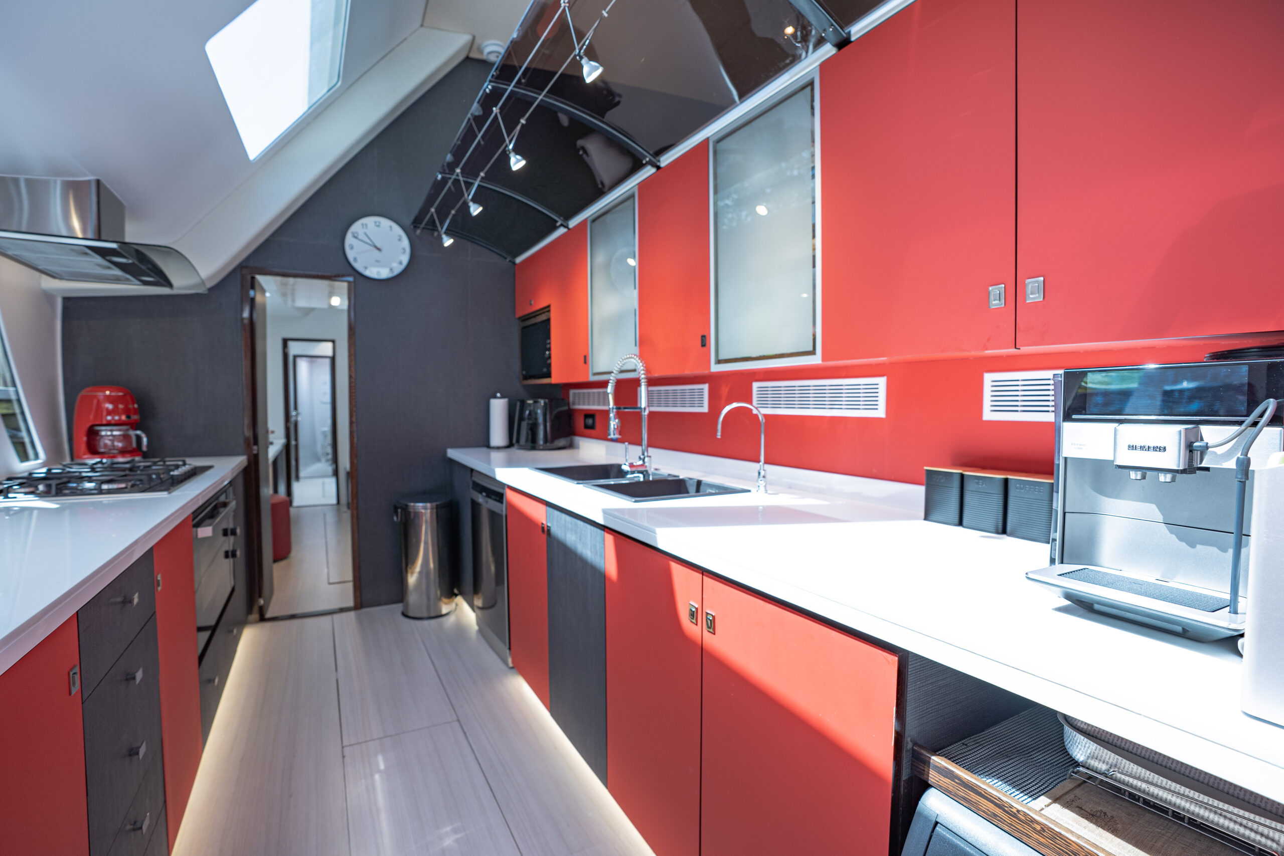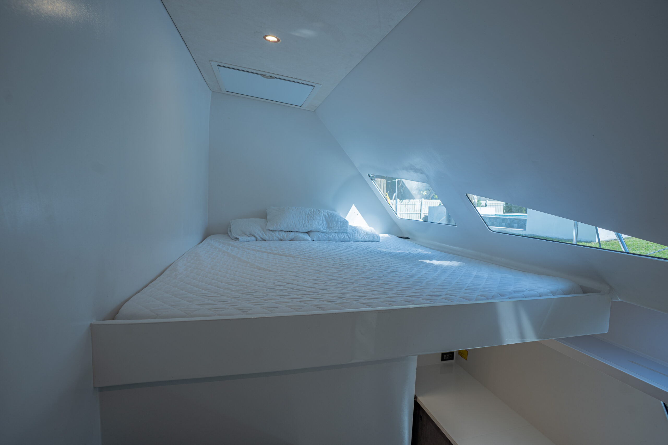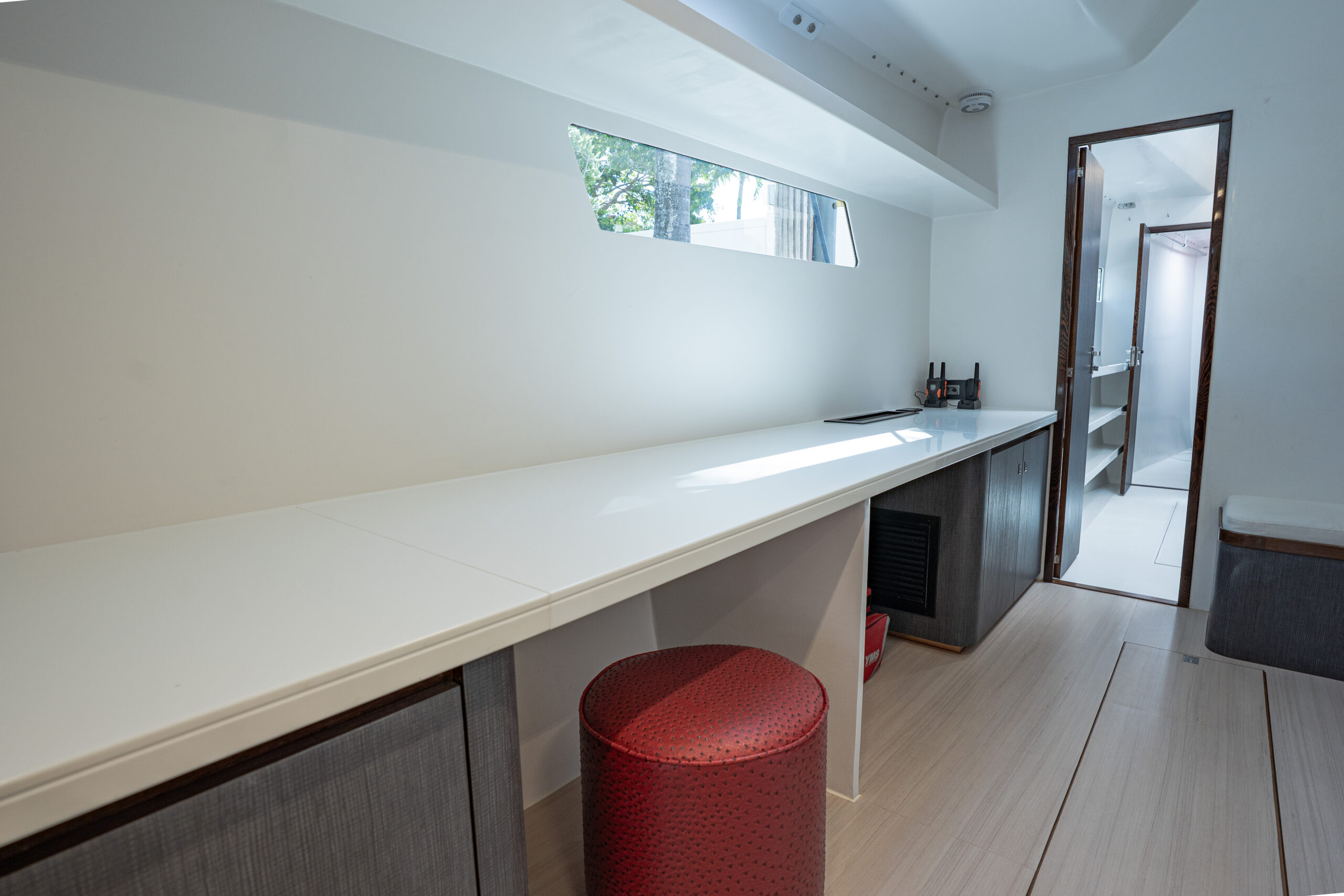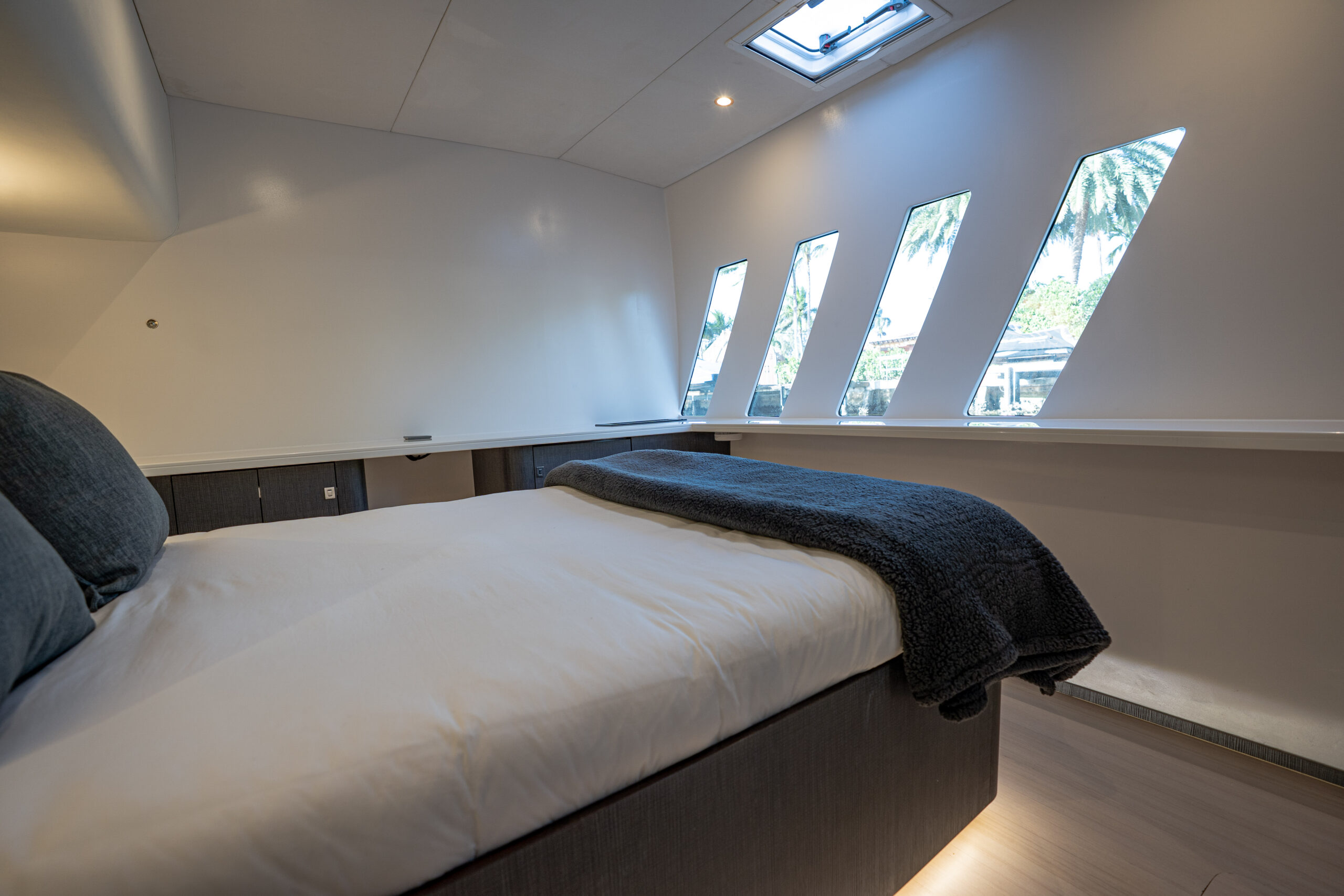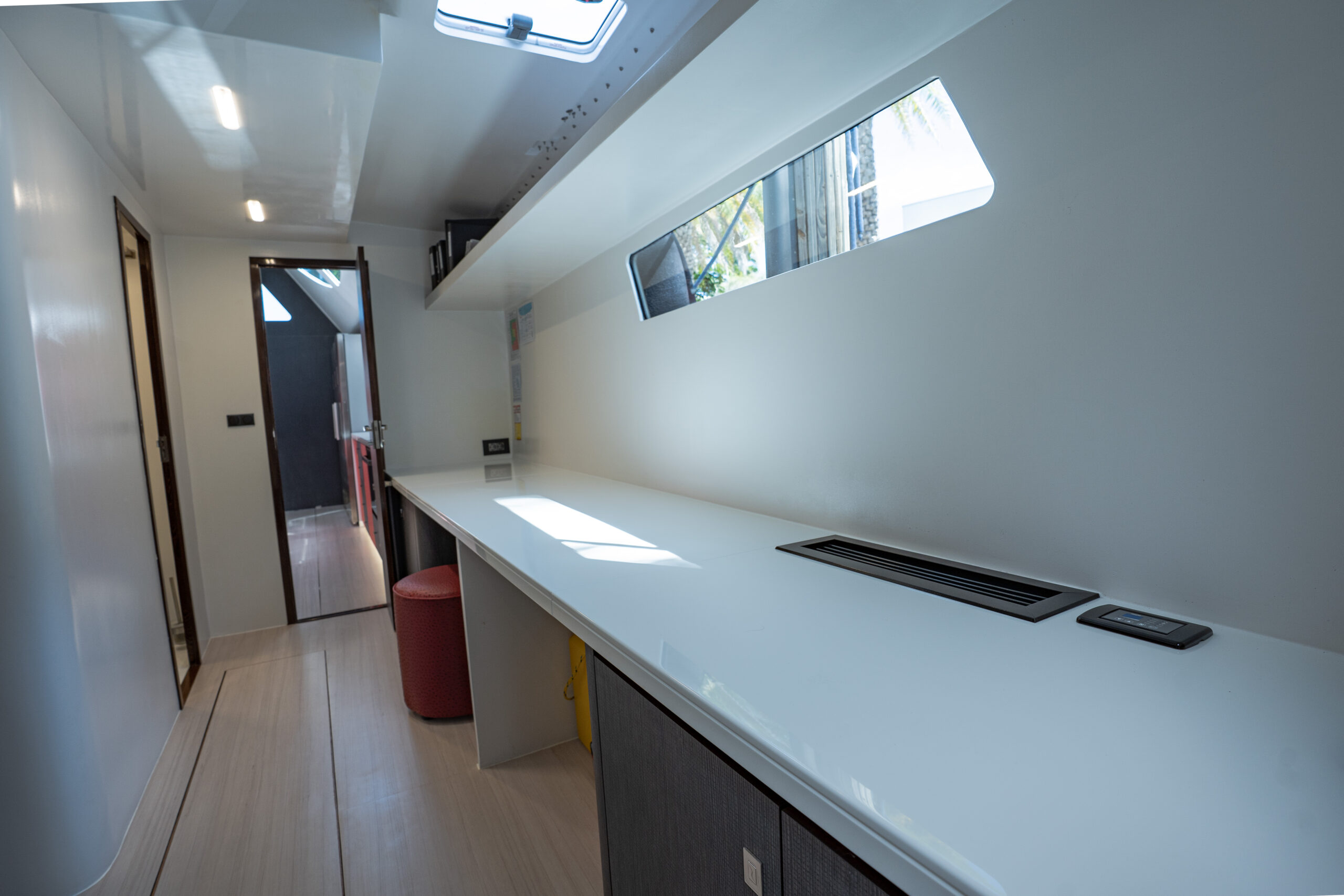 The bridge deck galley is a chef’s dream, featuring ample refrigeration, storage, and workspace to ensure the crew delivers top-tier service. The starboard hull houses generously sized crew quarters with en-suite facilities, while the captain’s private cabin comes with access to a workshop and laundry equipped with commercial-grade appliances, reducing reliance on shore services.