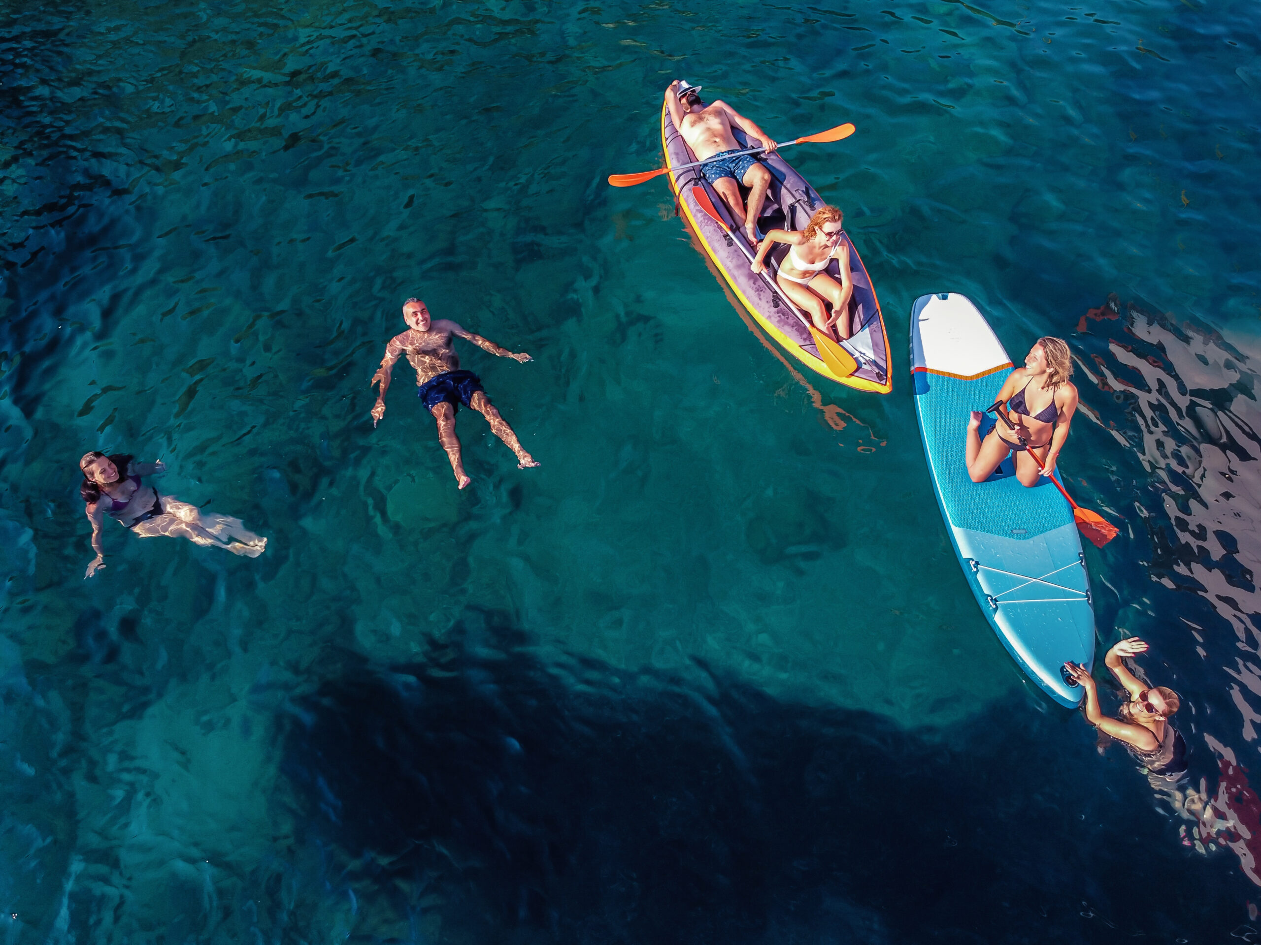 Our favorite spot on the Bali 5.4’s is the multi-purpose bow. There is a sitting area with a fold out table, great for enjoying that first cup of coffee in the morning and the large sprawl of sunpads, perfect to use while you’re underway or at anchor. The Bali’s are also known for their long dining room tables which can be enjoyed either fully indoor with the A/C, or open up the garage door for a more alfresco dining experience. When guests are ready to try out the watertoys onboard, there’s a hydraulic swim platform guests can utilize (especially helpful for those with mobility issues). Onboard High 5 you’ll find sea scooters, wakeboard, SUPs, subwing, towable tube, snorkel gear, and a 10ft floating dock which the crew are happy to set up for guests. To view High 5’s entire e-brochure, click here.