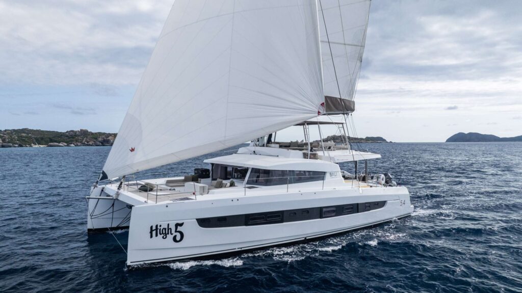 S/Y High 5 is a 2023 Bali 5.4, which can accommodate up to eight guests, in four ensuite cabins. The Bali 5.4’s are known for seamlessly combining indoor/outdoor living spaces, providing guests with multiple areas to enjoy meals, cocktail hours, family game nights, sunbathing and even staying healthy with yoga. There is an owner’s cabin on the port side, featuring a full walk-around queen size bed, with a separate shower and toilet and private access to the cockpit. The other three cabins also feature queen size beds and are all ensuites.