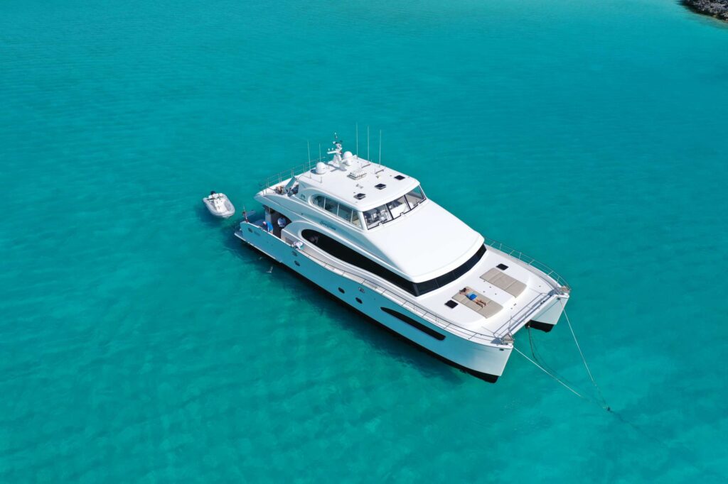 M/Y SeaGlass is a 2018 Horizon 74 powercat, with four ensuite cabins, that can accommodate up to eight guests. The cabins include: a King primary’s suite which sits on the main deck, encompassing the entire width of the boat and giving guests 180 degree views to wake up to. There are two King VIP cabins just below the main deck and the third midship cabin is convertible into twins or a King. The main salon features a fantastic galley with an island and 4 bar stools, allowing guests to be right where the action is while the chef is preparing your 5 star meals. The salon also features a fantastic large L-shaped couch with two swivel chairs, with windows wrapping the boat on both port and starboard, guests can enjoy fantastic views even when sitting indoors. Guests can enjoy alfresco dining on the aft deck, with seating for up to 10. The flybridge is another great spot for guests to enjoy when the sun is too much or there’s a bit of rain on the radar. The entire flybridge is enclosed and air conditioned. There’s a full size dining table, a massive bar with seating for 5, and a dayhead, which is easy for guests to use while they’re jumping in and out of the water all day. SeaGlass comes with 3 crew and is the definition of luxury vacation. To view SeaGlass’s full e-brochure, click here.