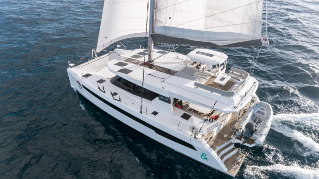 S/Y Sea Dog is a 2020 Leopard 50, which can accommodate up to six guests, in three ensuite cabins. There is an owner’s cabin on the starboard side, which features a queen size bed, dressing area with lots of hanging closets and a spacious and open shower, vanity and dry head combo. The other two cabins also feature queen size beds and are ensuites. The Leopard 50’s have so many wonderful living spaces to enjoy while underway or at anchor. One of the most popular spots is the sunken forward cockpit, which guests can directly access from the salon and galley. This is a wonderful spot for guests to enjoy a cup of tea and watch the sunrise. There’s also a massive trampoline and two bow seats for guests to enjoy the sunshine and feel the refreshing sea spray while sailing. And when it’s time to take a break from the heat of the sun, guests have a large U-shaped settee in the salon with air conditioning and a front row view of the chef hard at work preparing that next 5 star meal. The cockpit on the aft deck is where guests can enjoy the majority of their meals alfresco. And when it’s time to unwind for the night, the flybridge makes a great spot to star gaze, and enjoy a nightcap. To view Sea Dog’s entire e-brochure, click here.