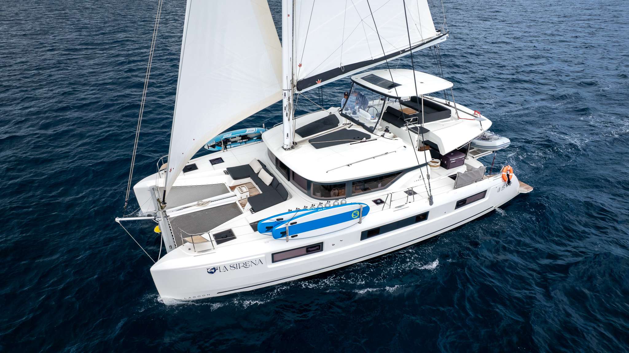 S/Y La Sirena is a 2023 Lagoon 51 with three Queen size cabins and one midship twin cabin which is perfect for a young adult or small children to share. All three queen ensuite cabins are all in equal size, so there won’t be any disagreement on who is getting the better cabin; making it a great option for couples to charter or a small family. The salon features a massive couch, perfect to watch the chef prepare meals, enjoy a board game, or just take a break from the heat and sun with the icy cool air conditioning. For the majority of meals, guests can enjoy alfresco dining in the cockpit, but for appetizers, sundowners, snacks and morning latte’s, there are multiple spots to enjoy. From the forward cockpit and two massive trampolines, to the covered flybridge with a L-shaped settee and coffee table, or the two large sunpads that are just forward of the helm; La Sirena offers plenty of space for the entire group and is sure not to disappoint. To see La Sirena’s full e-brochure, click here.