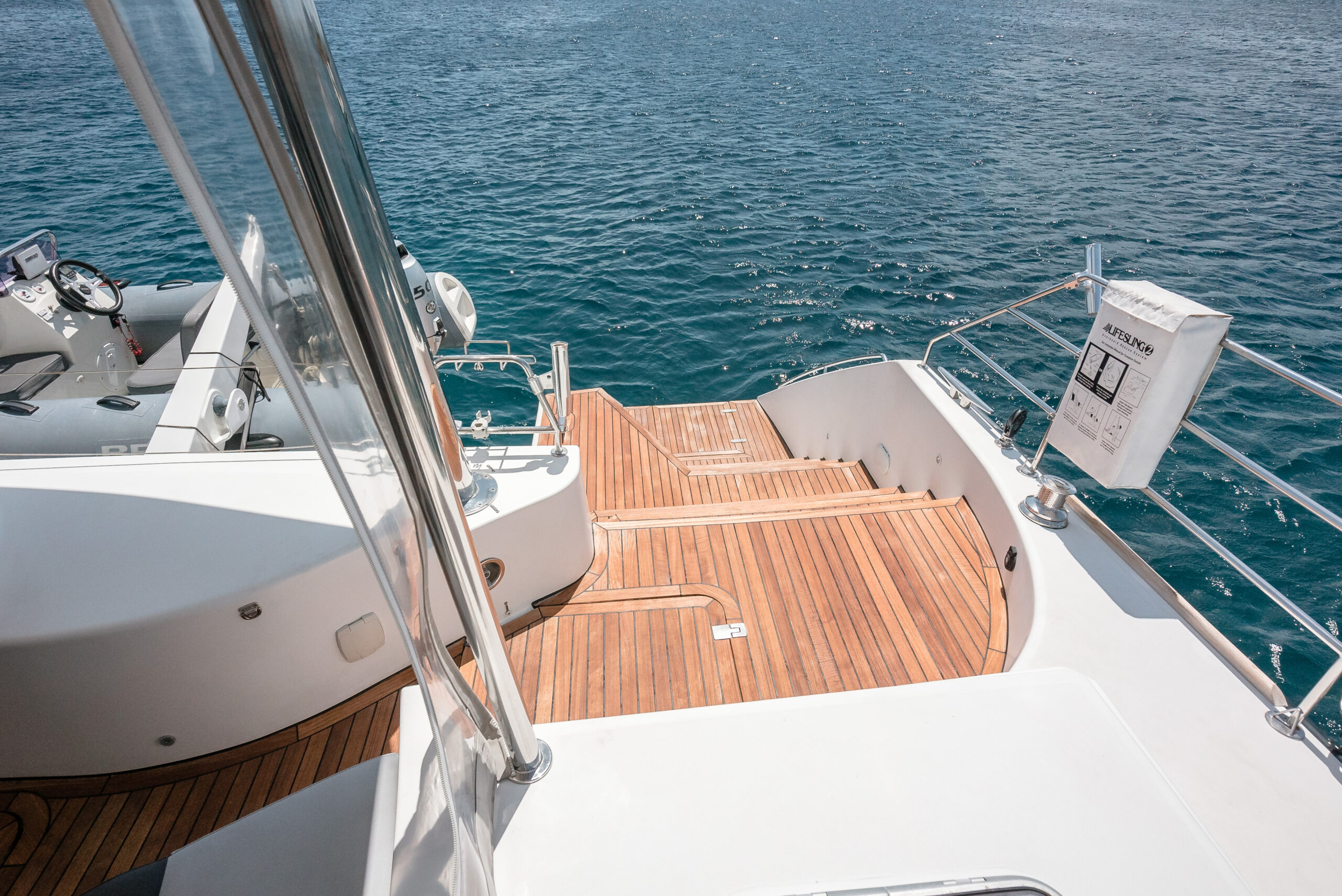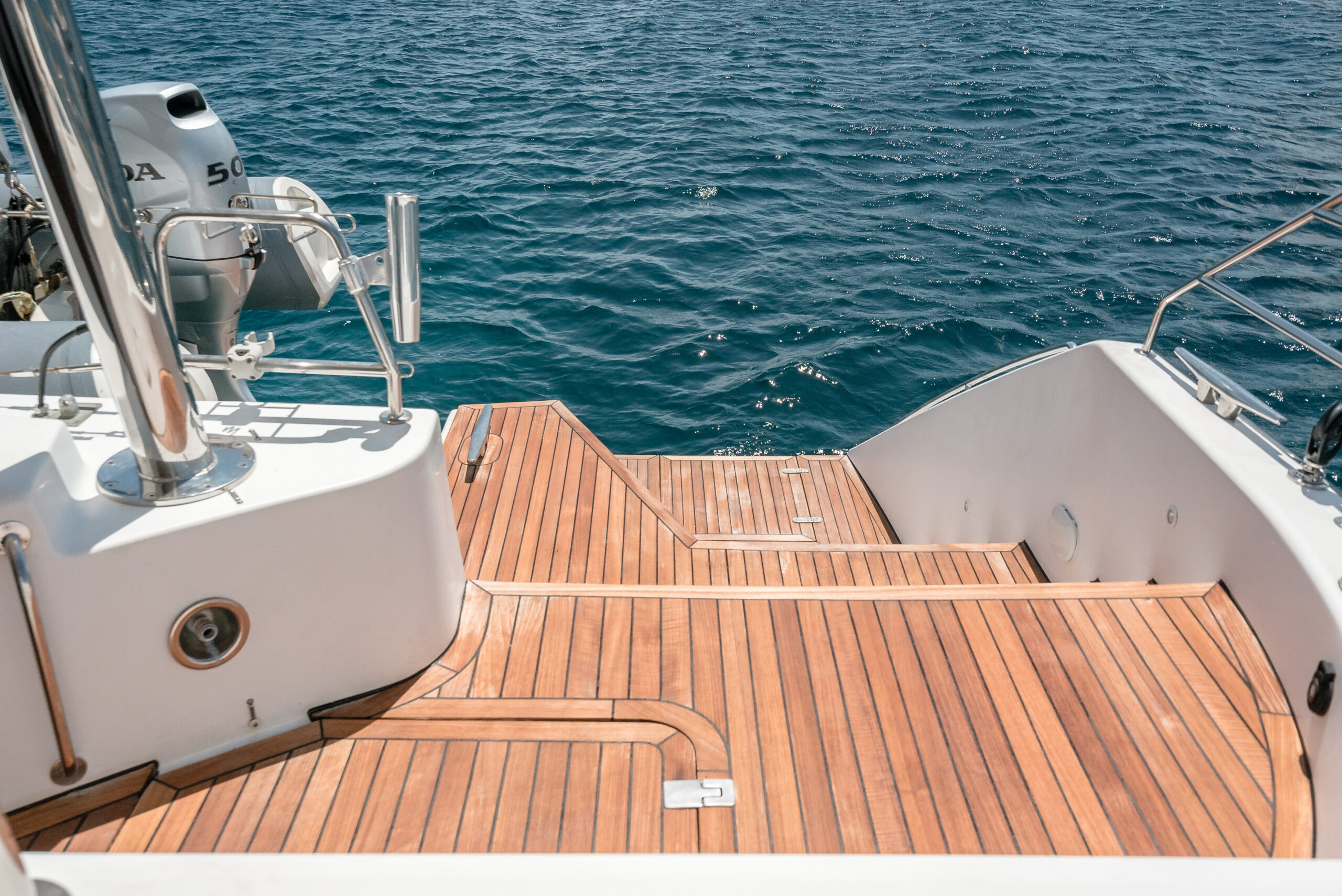 - Folding stainless steel swim ladder under transom floor with teak steps