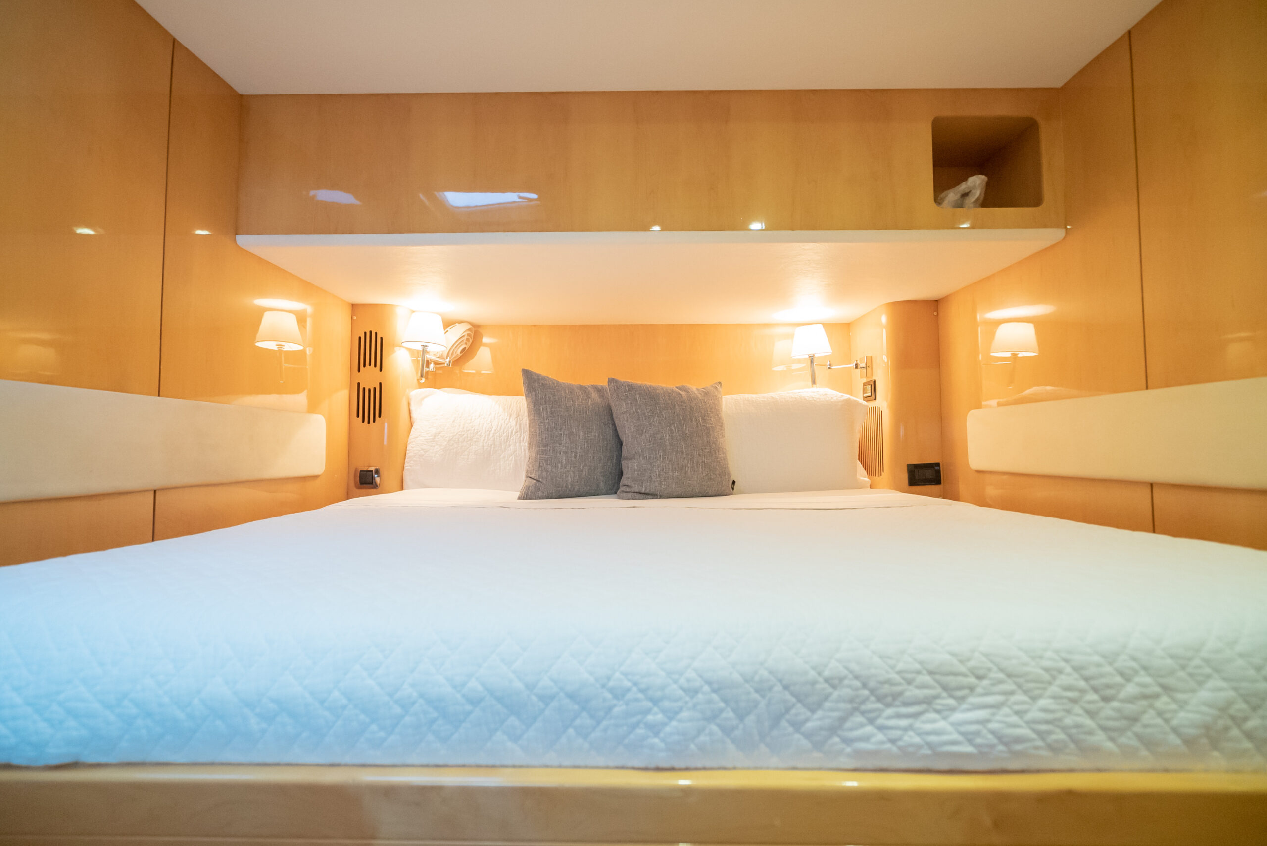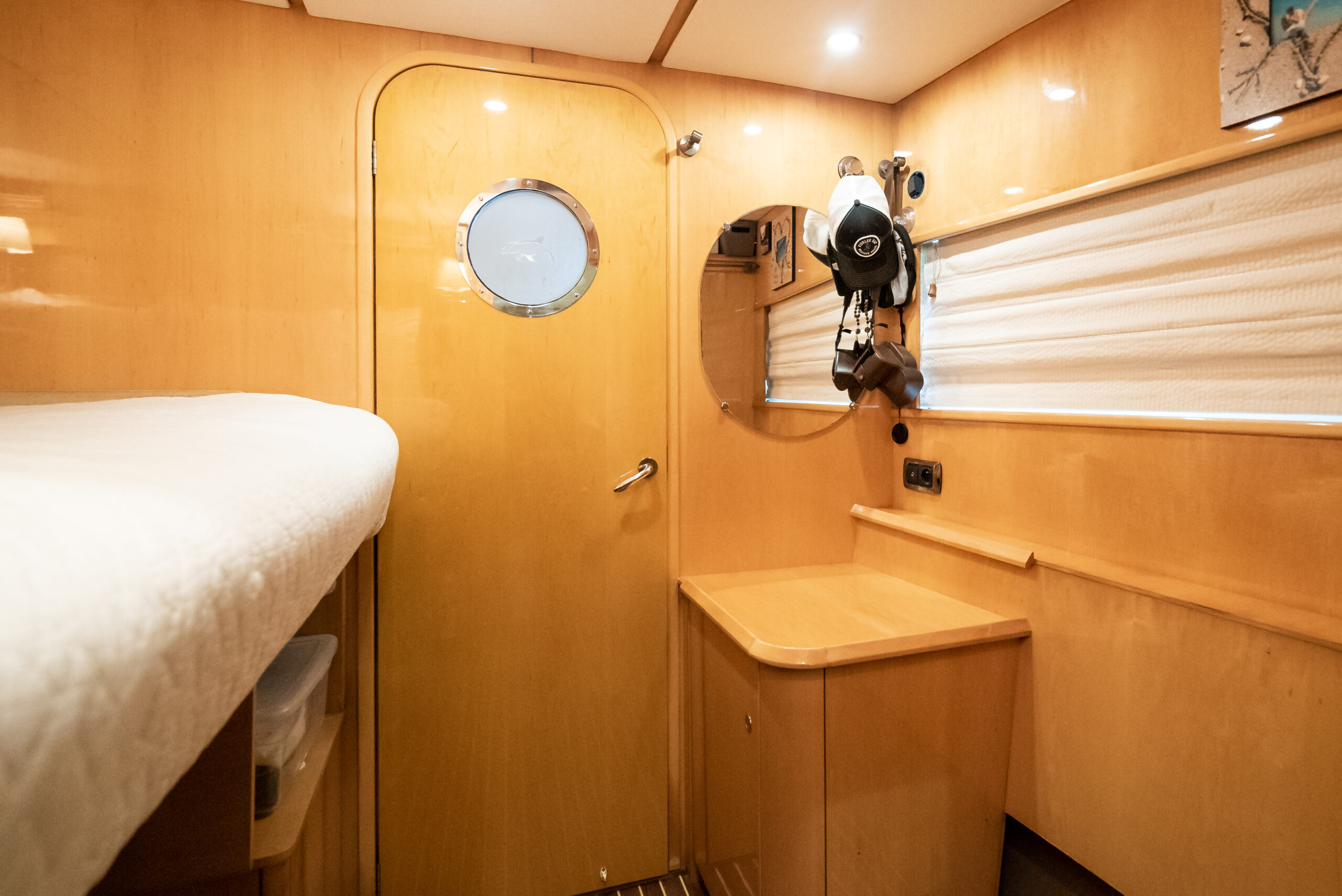 - One central forward master cabin (access from port)