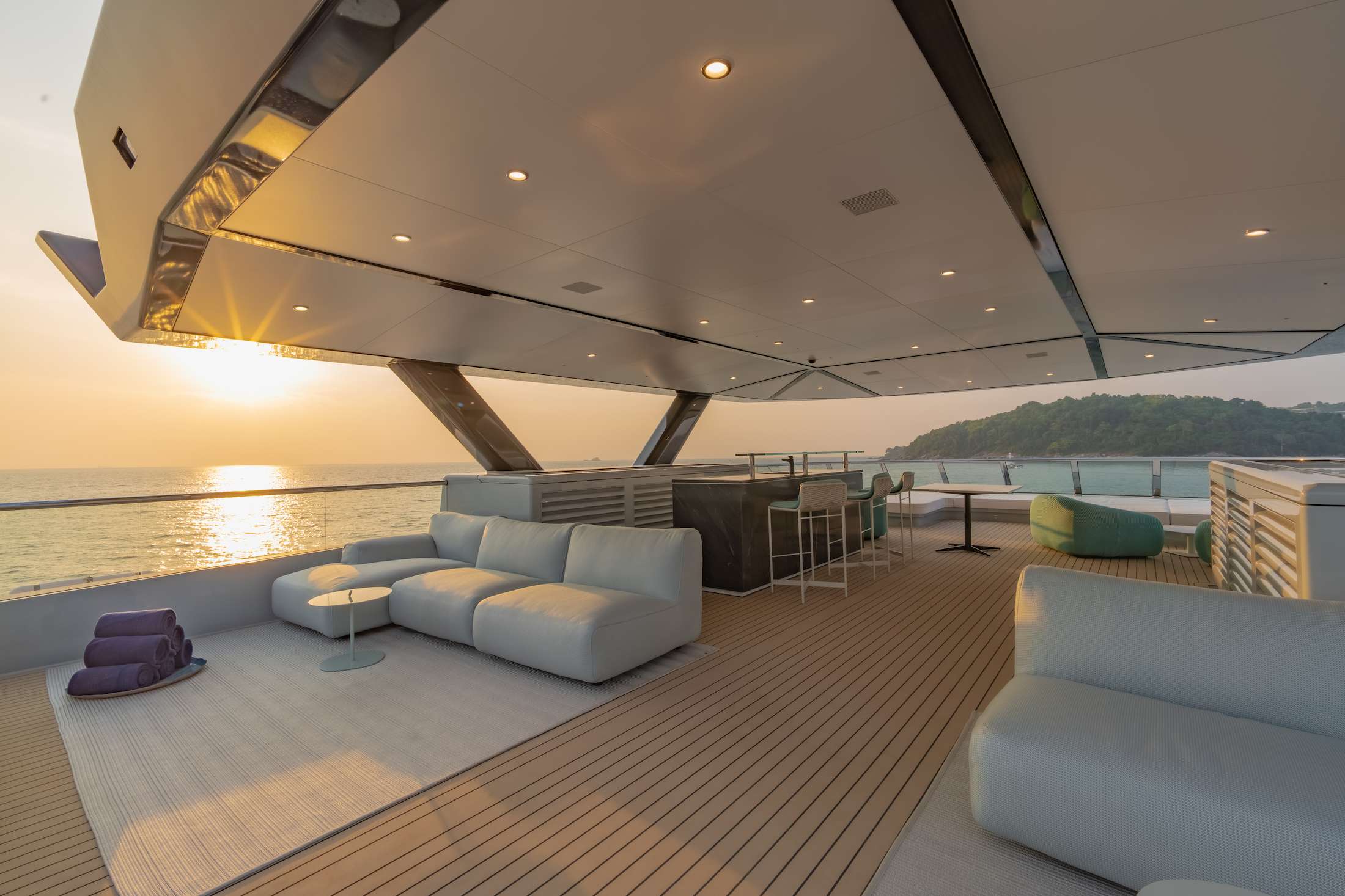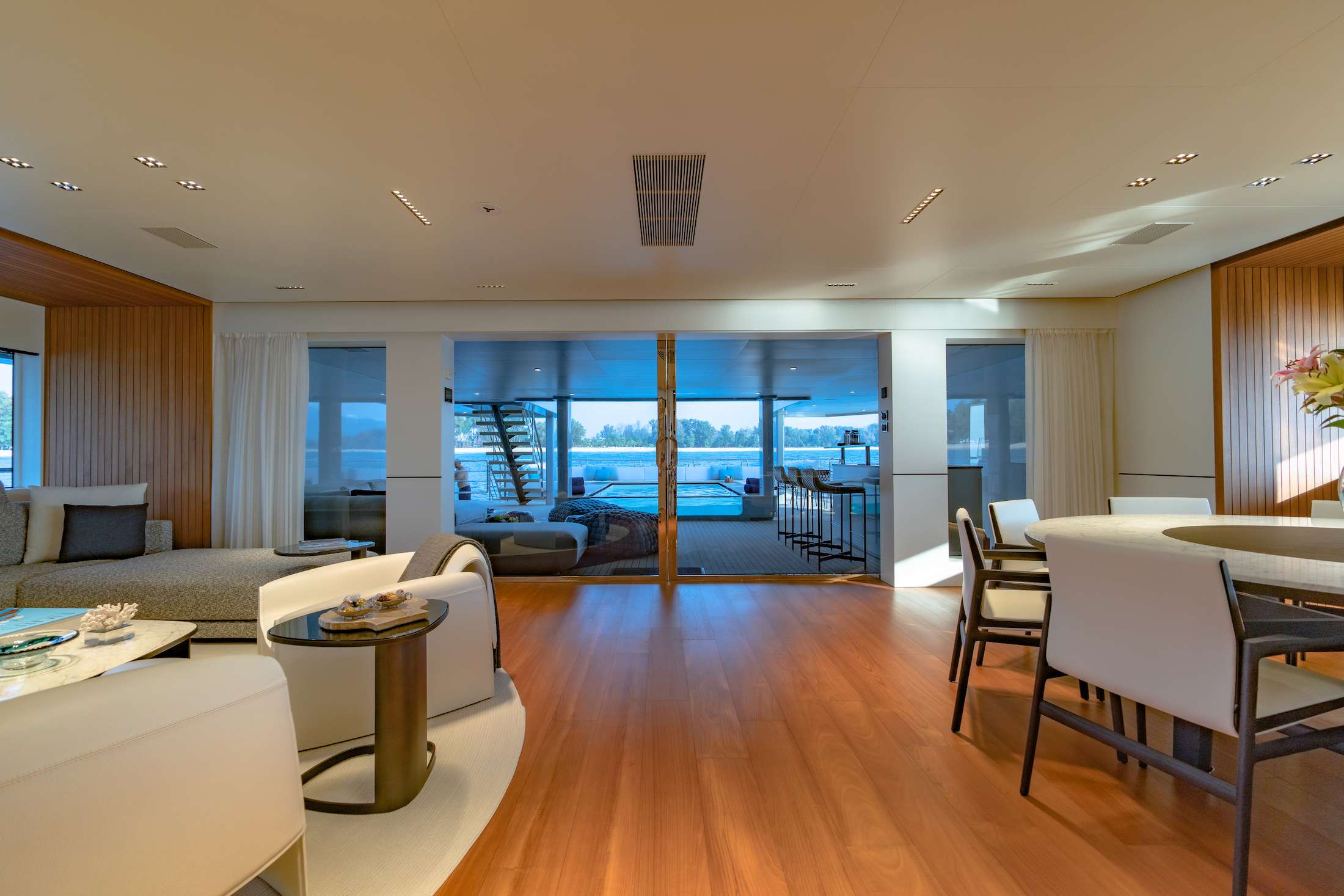 Designed to accommodate up to eight guests in four beautifully appointed cabins, SPACECAT offers a high level of privacy and comfort. The full-beam master suite is a standout feature, complemented by spacious guest cabins that reflect the yacht’s refined, modern aesthetic. Social spaces are equally impressive, from the open-plan main salon to multiple alfresco lounging and dining areas, including an aft deck complete with pool and bar — ideal for relaxed afternoons or sunset cocktails.